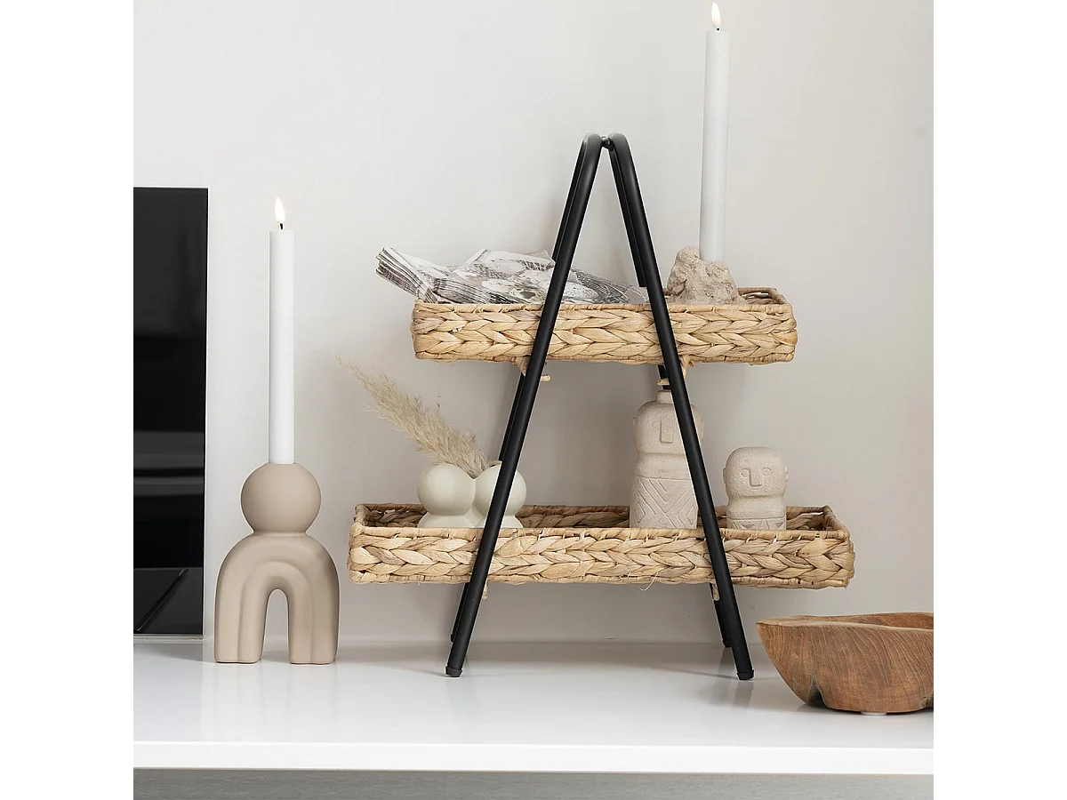 MAORI - Petite Etagère à Poser 2 Plateaux Tressés en Jacinthe Support en Métal Noir