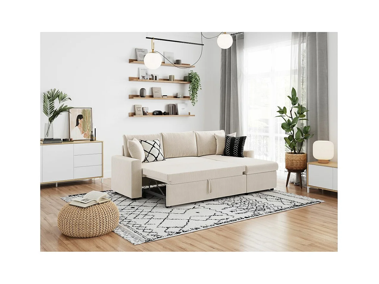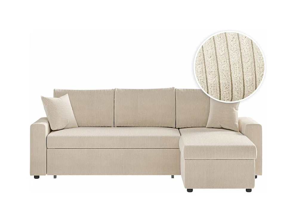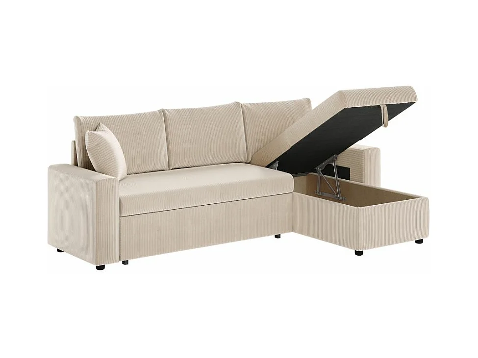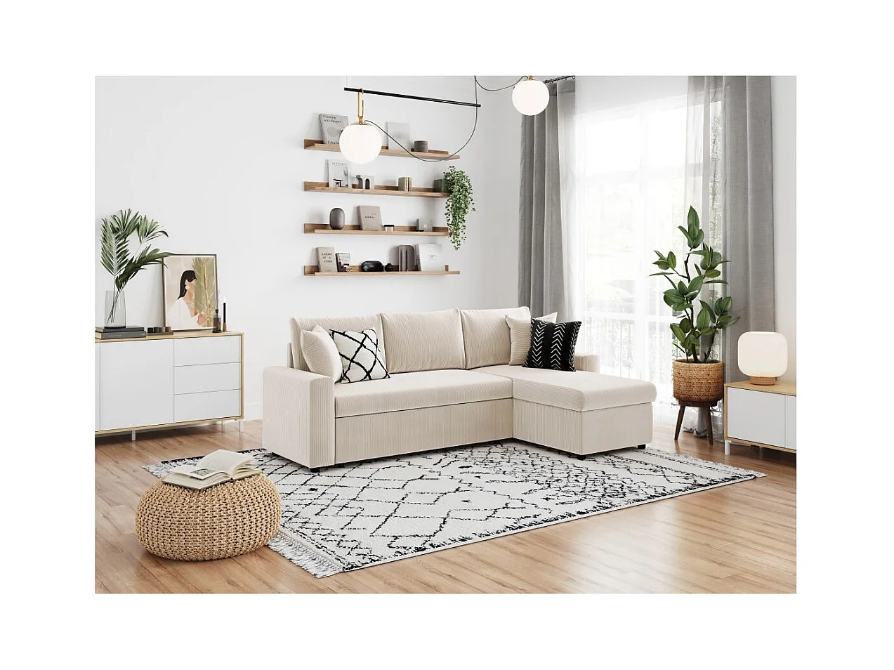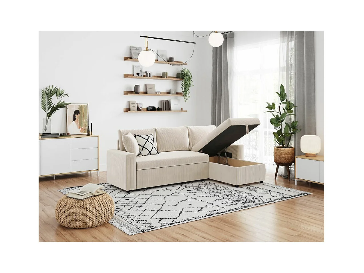Canapé d'angle 3 places Maria réversible, convertible avec coffre en velours côtelé - Écru - L227 x P146 x H81cm - Loungitude