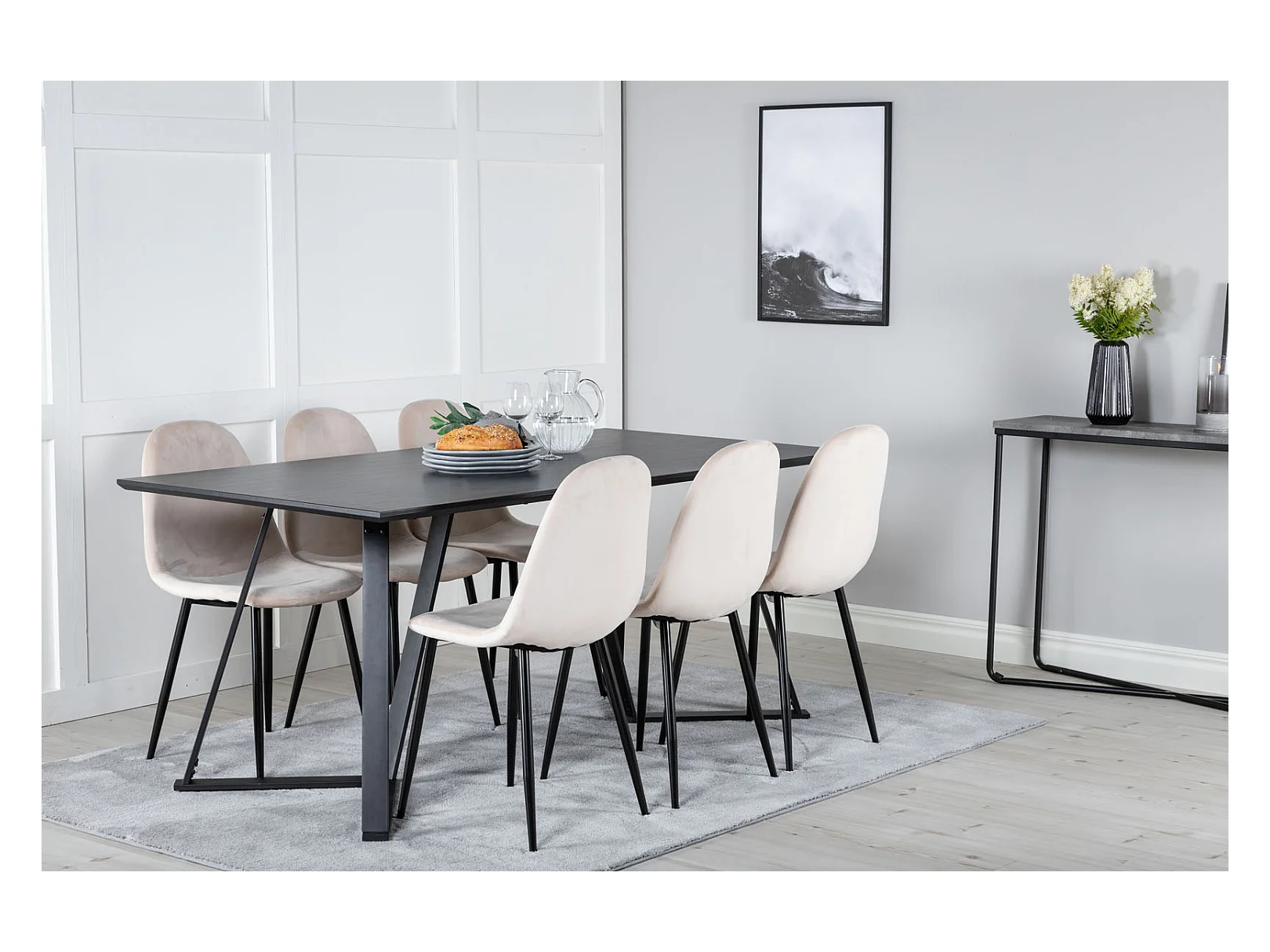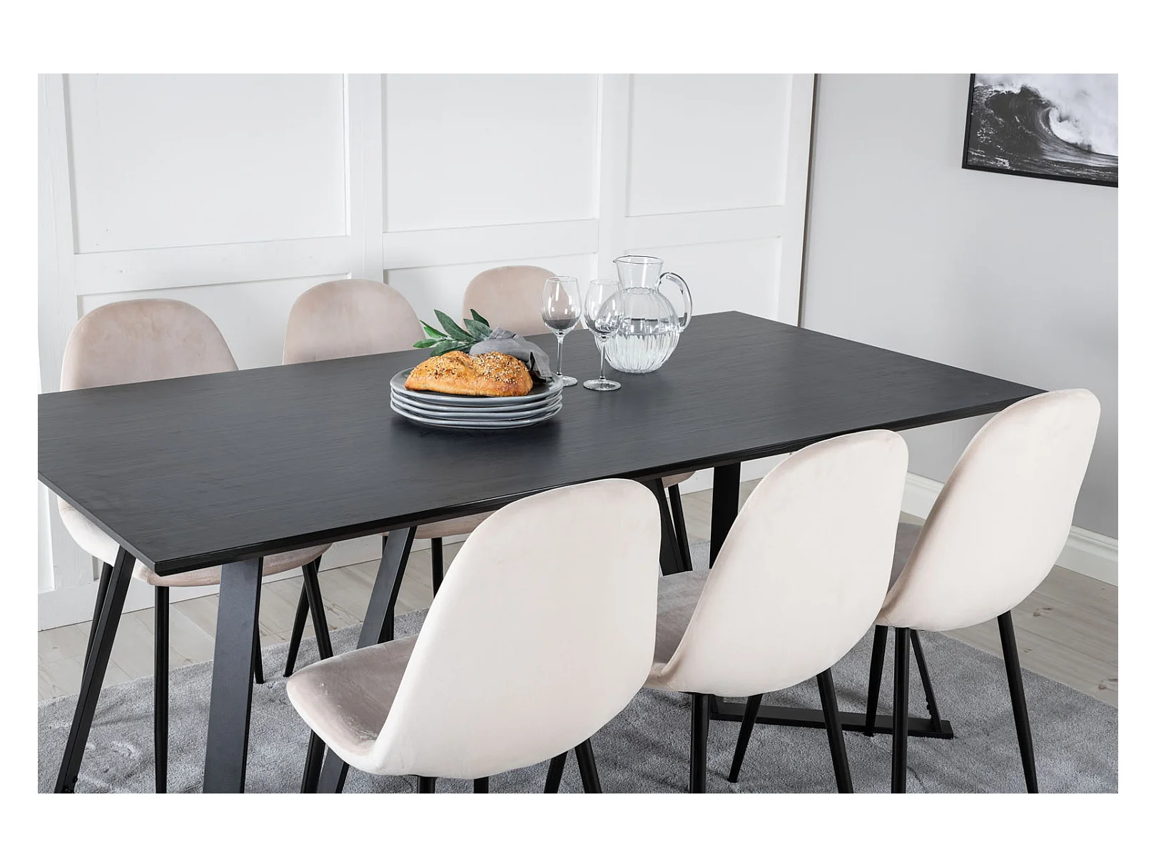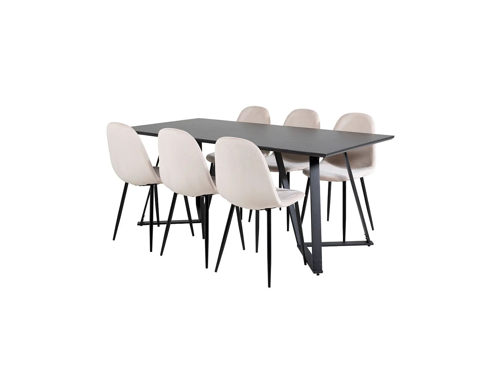 MarinaBLBL ensemble table, table noir et 6 Polar chaises Velours beige.