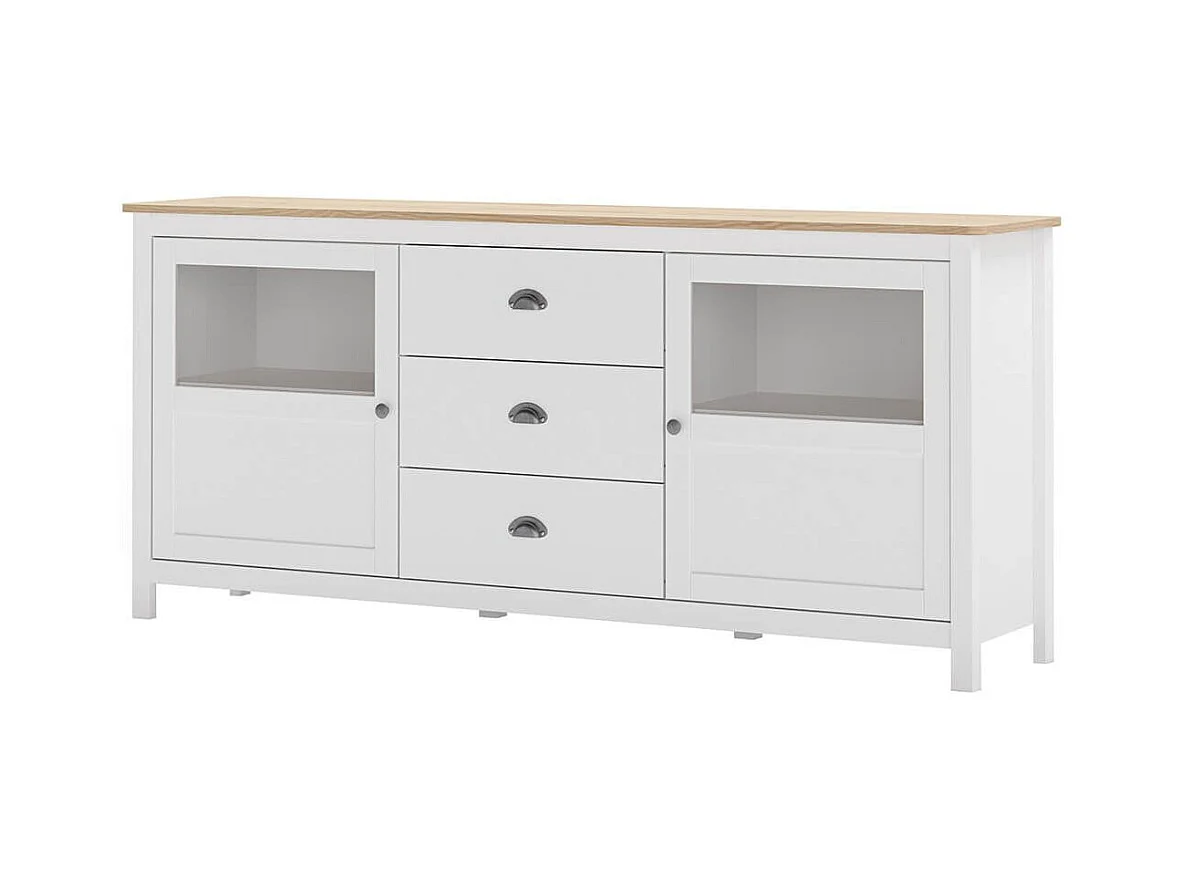MASK - Buffet 2 Portes semi vitrées 3 Tiroirs en Pin Massif Naturel et Blanc