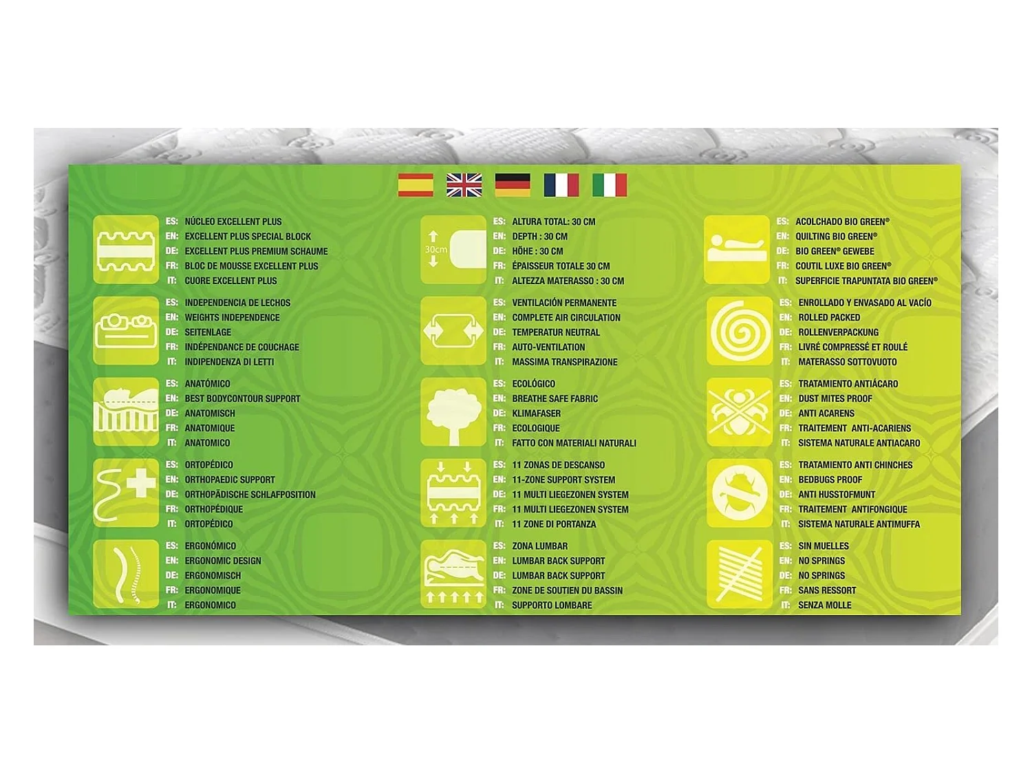 Matelas 120x200 bio green | mousse á memoire de forme bio pur® | épaisseur 30 cm | hypoallergénique | anatomique | certifié oeko-tex®
