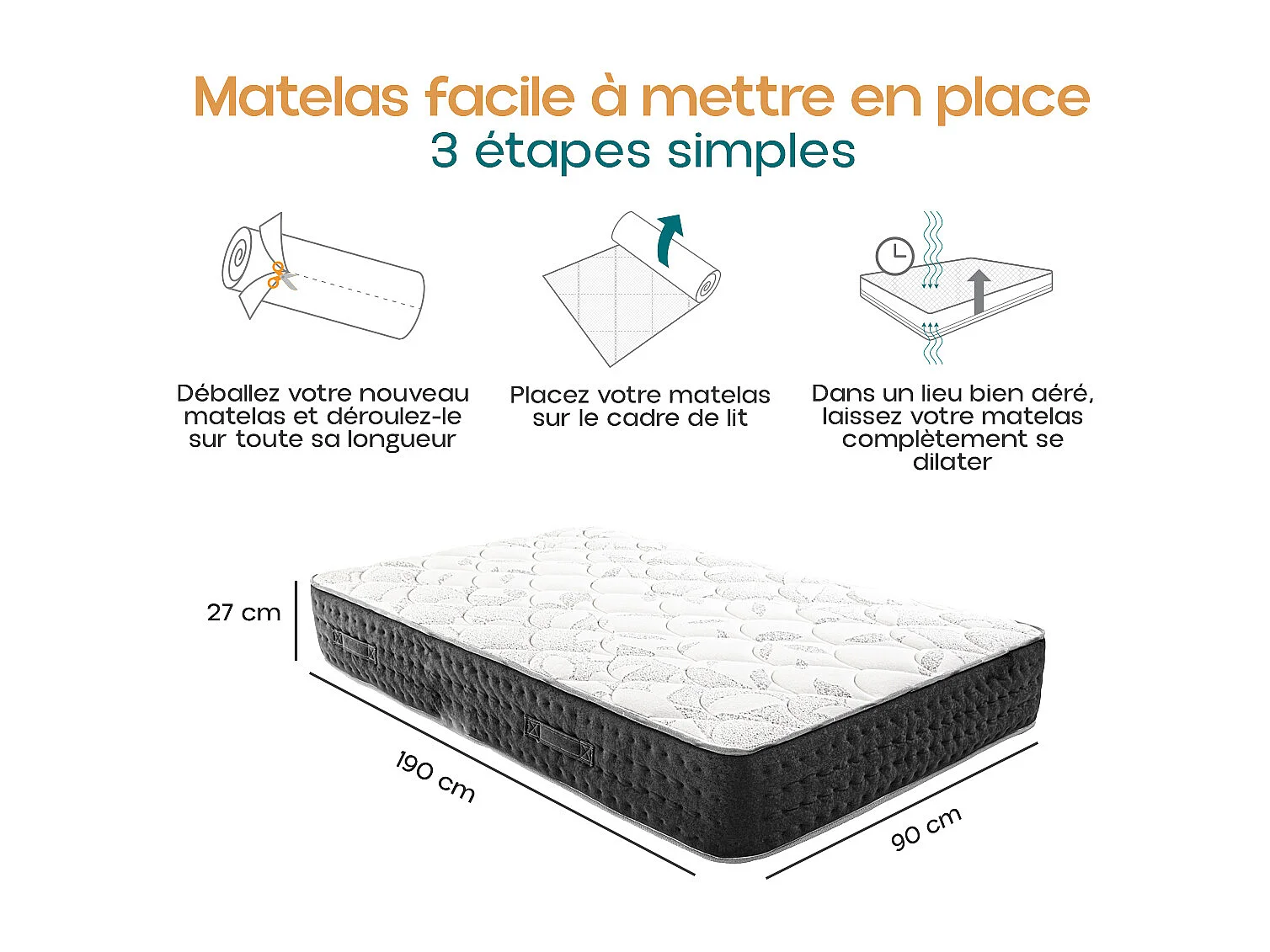 Matelas à ressorts ensachés MIERA , 90x190 cm, en mousse haute densité, Soutien très ferme, face été/hiver, épaisseur 27 cm
