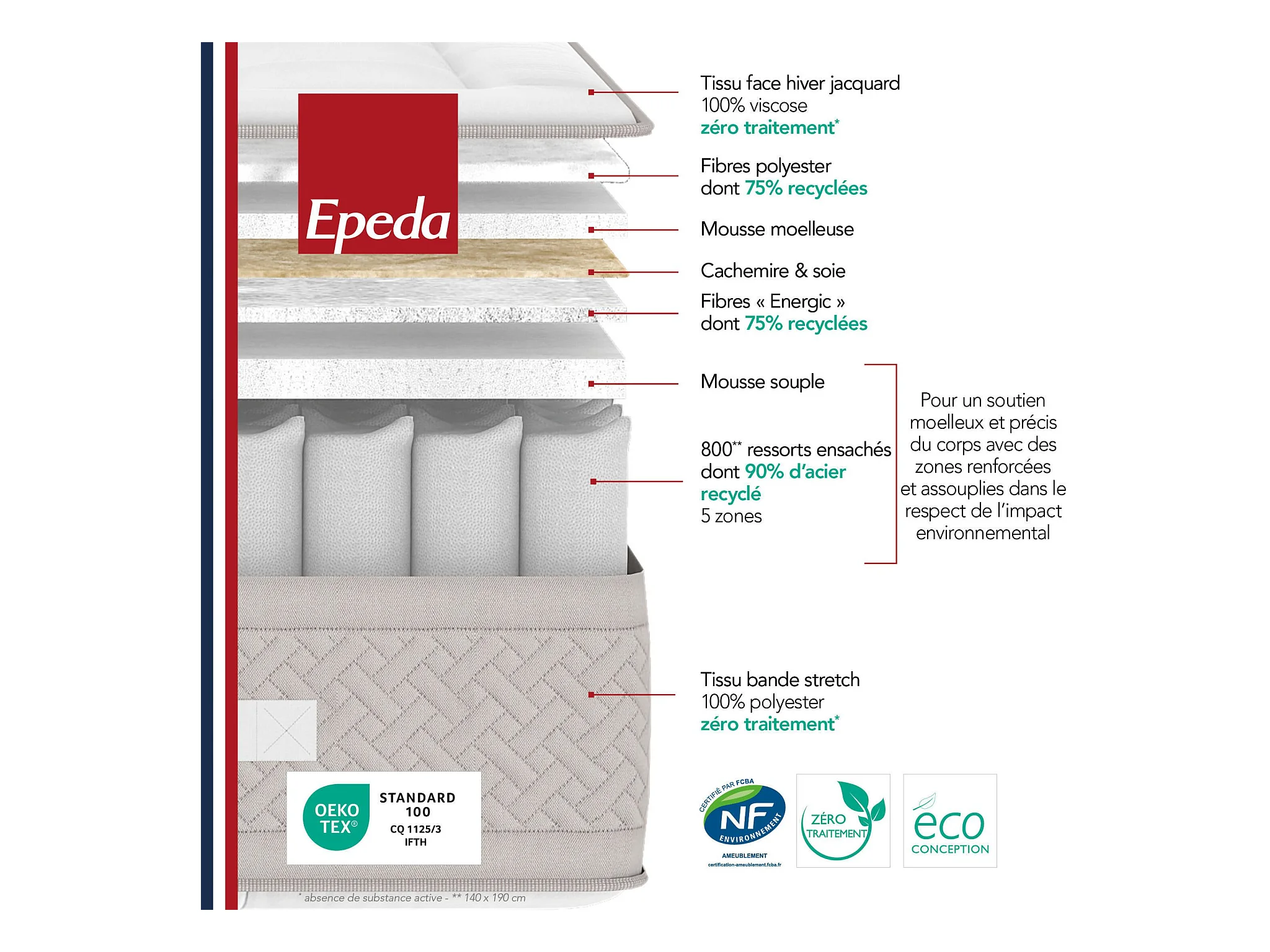Matelas capitonné Epeda ressorts ensachés, cachemire et soie Le Majestueux 200x200