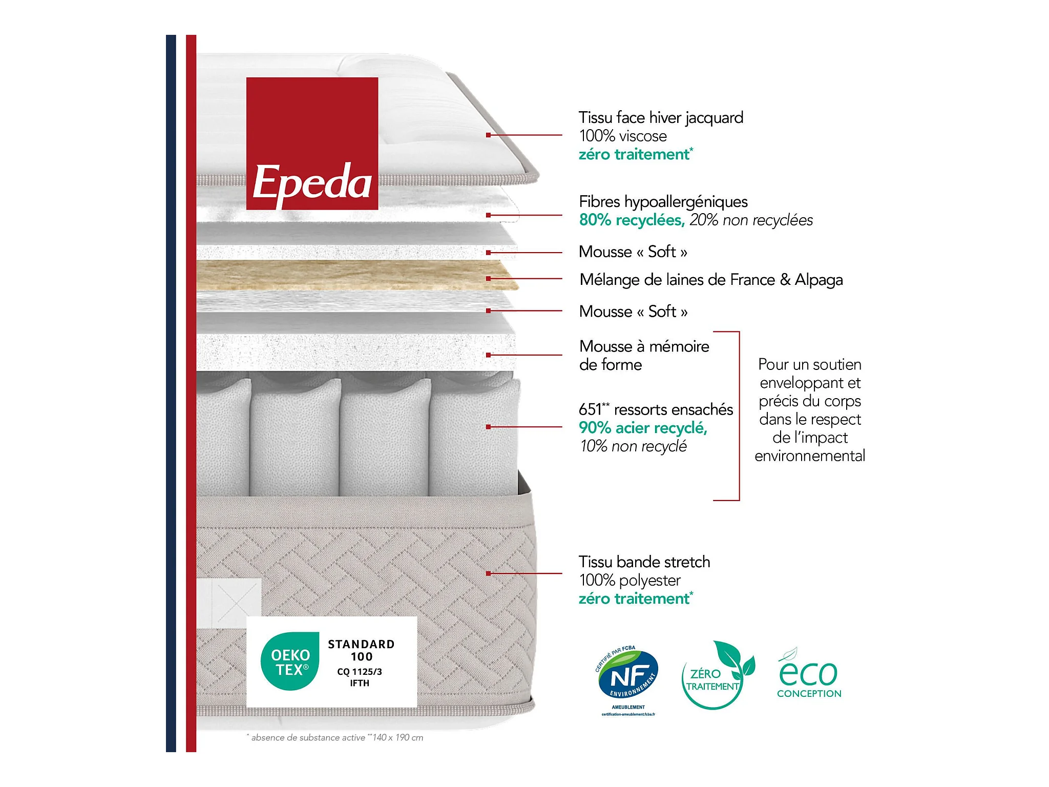 Matelas Epeda ressorts ensachés, mémoire de forme et laine L’Escapade 140x190