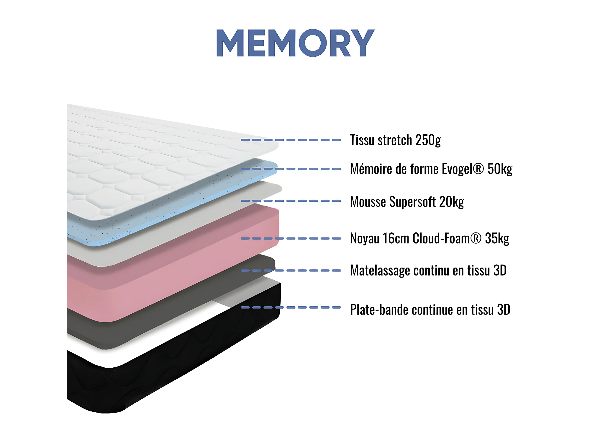 Matelas mousse Memory - 140x200cm - accueil mémoire de forme 50kg/m3 - 19 cm