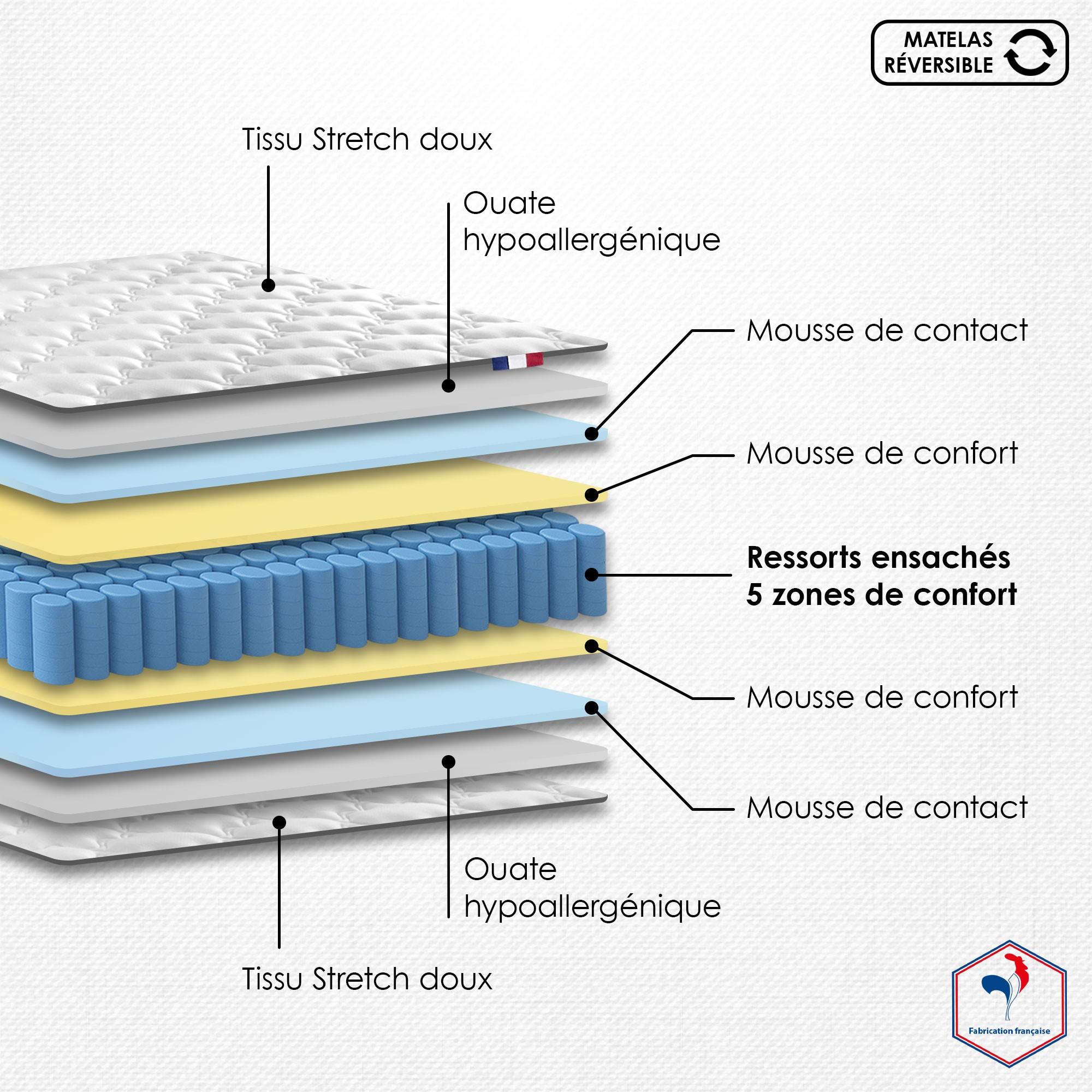 Matelas ressorts 5 zones réversible ETOILE - confort Made in France Dimensions - 90x200