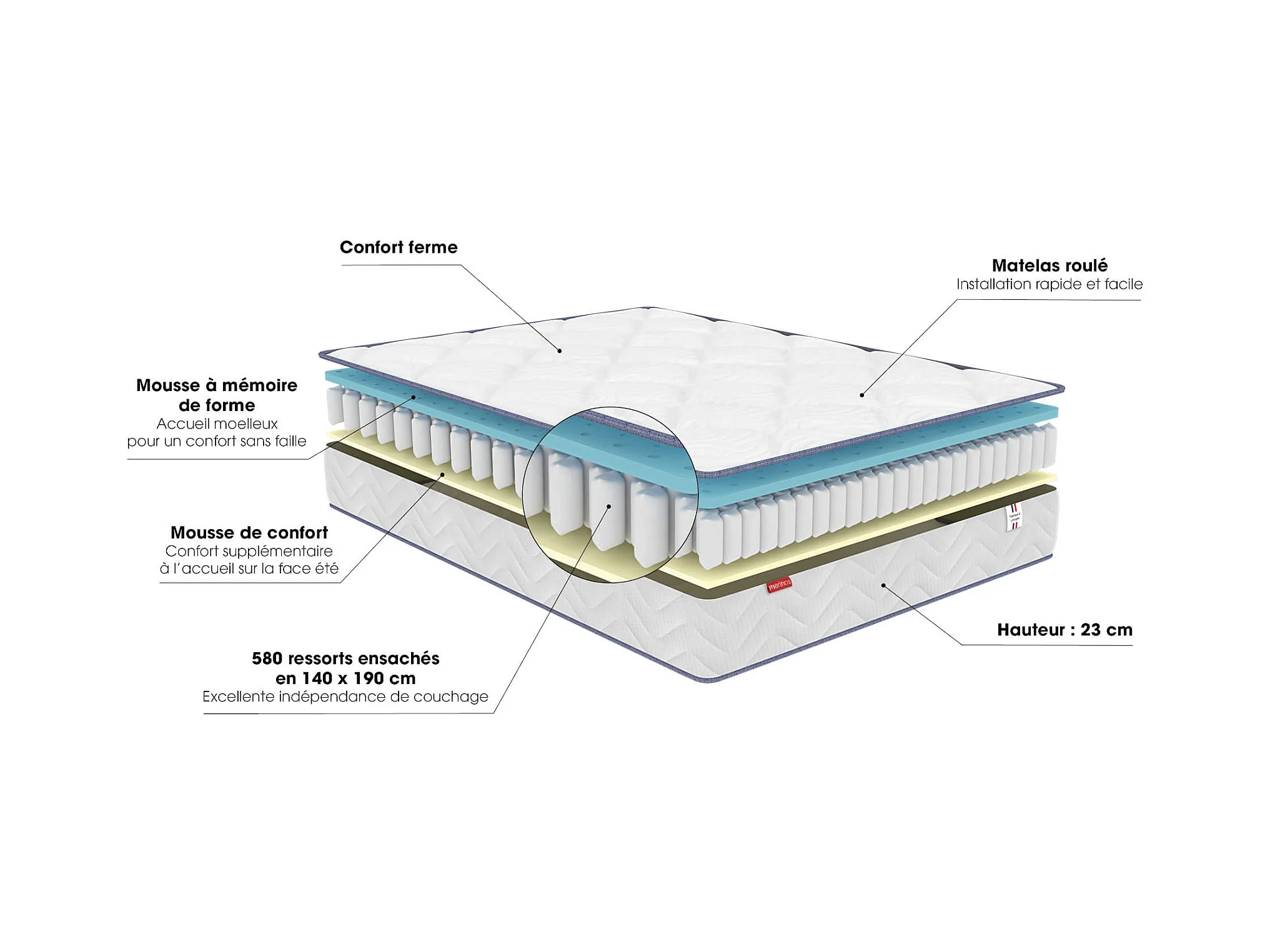 Matelas ressorts ensachés + mousse mémoire Merinos SWEETY 140x190
