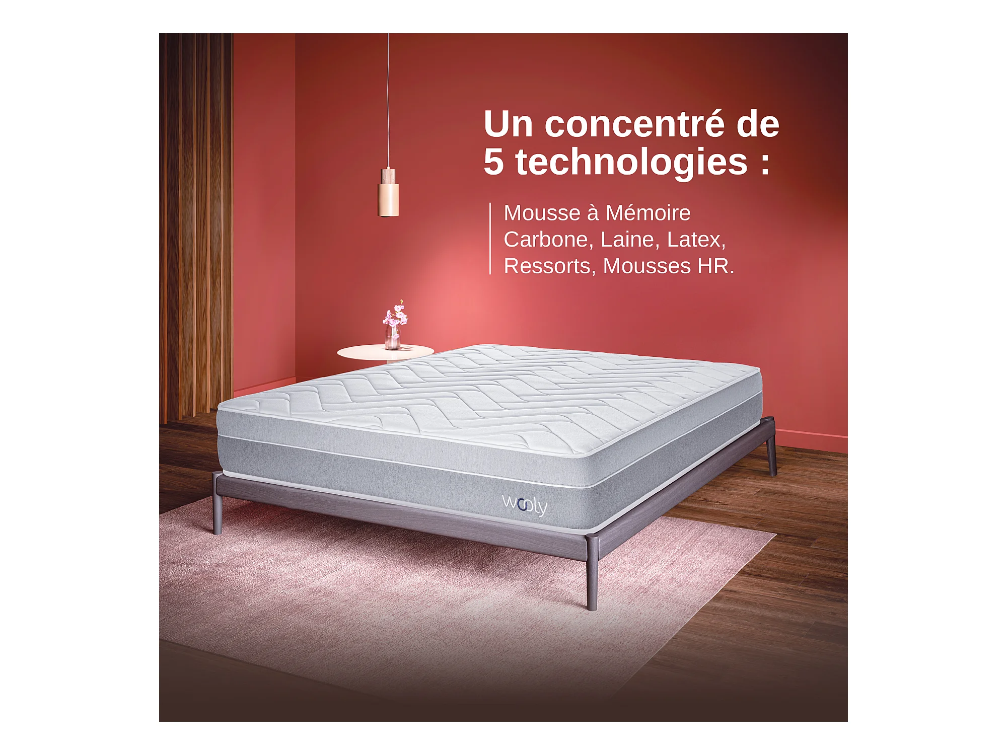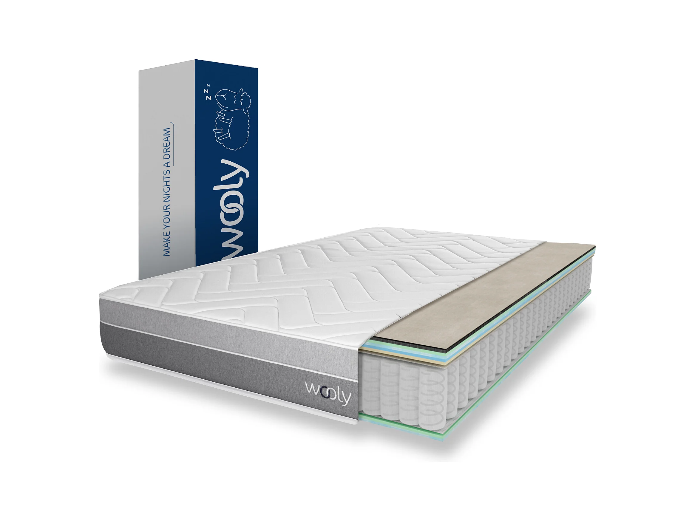 Matelas Wooly Original 135x190 cm - Hybride - Ressorts ensachés - Laine - Latex - Mousse mémoire adaptative - HR - Confort mi-Ferme 7 Zones - 24 cm