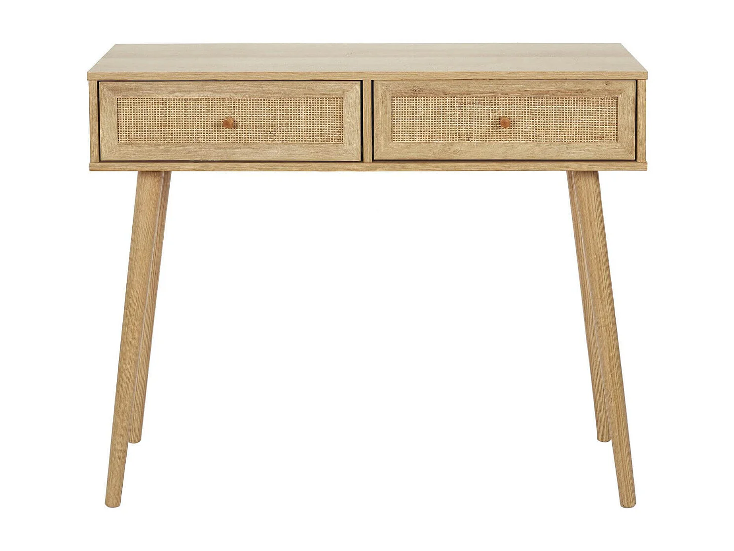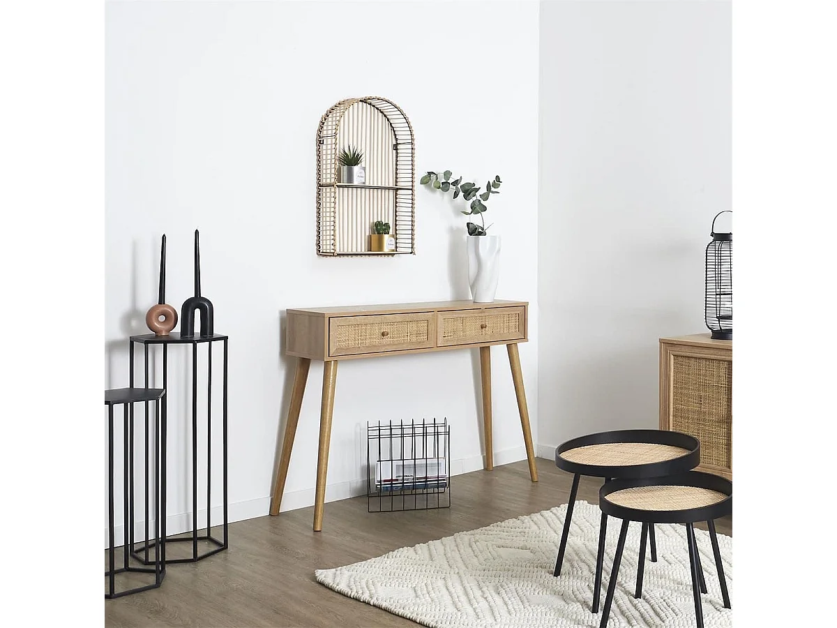 MAYA - Console 2 Tiroirs Effet Bois et Façades Rotin