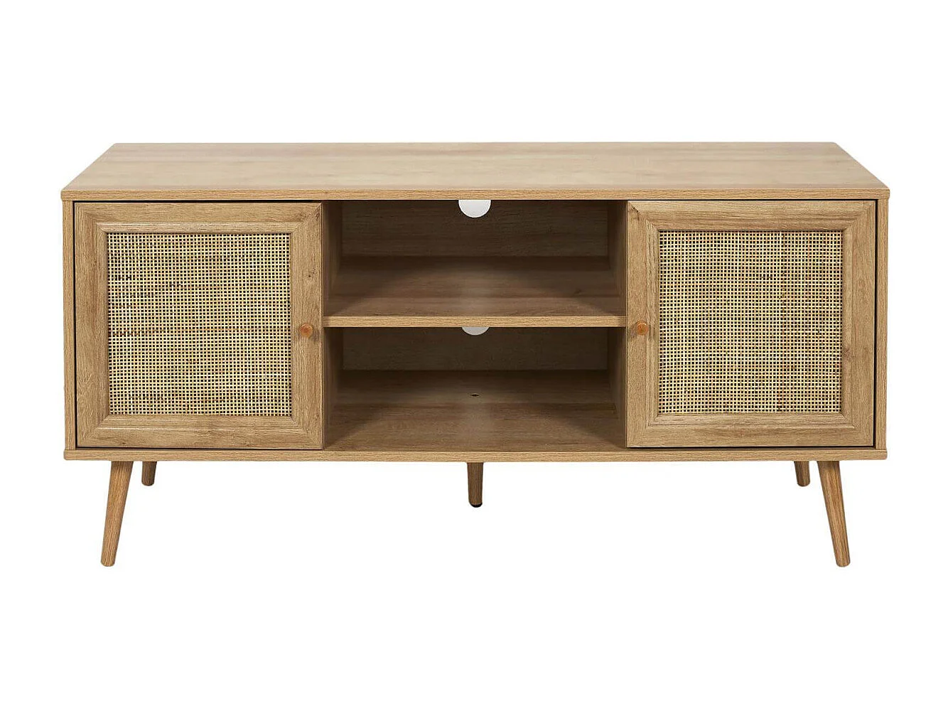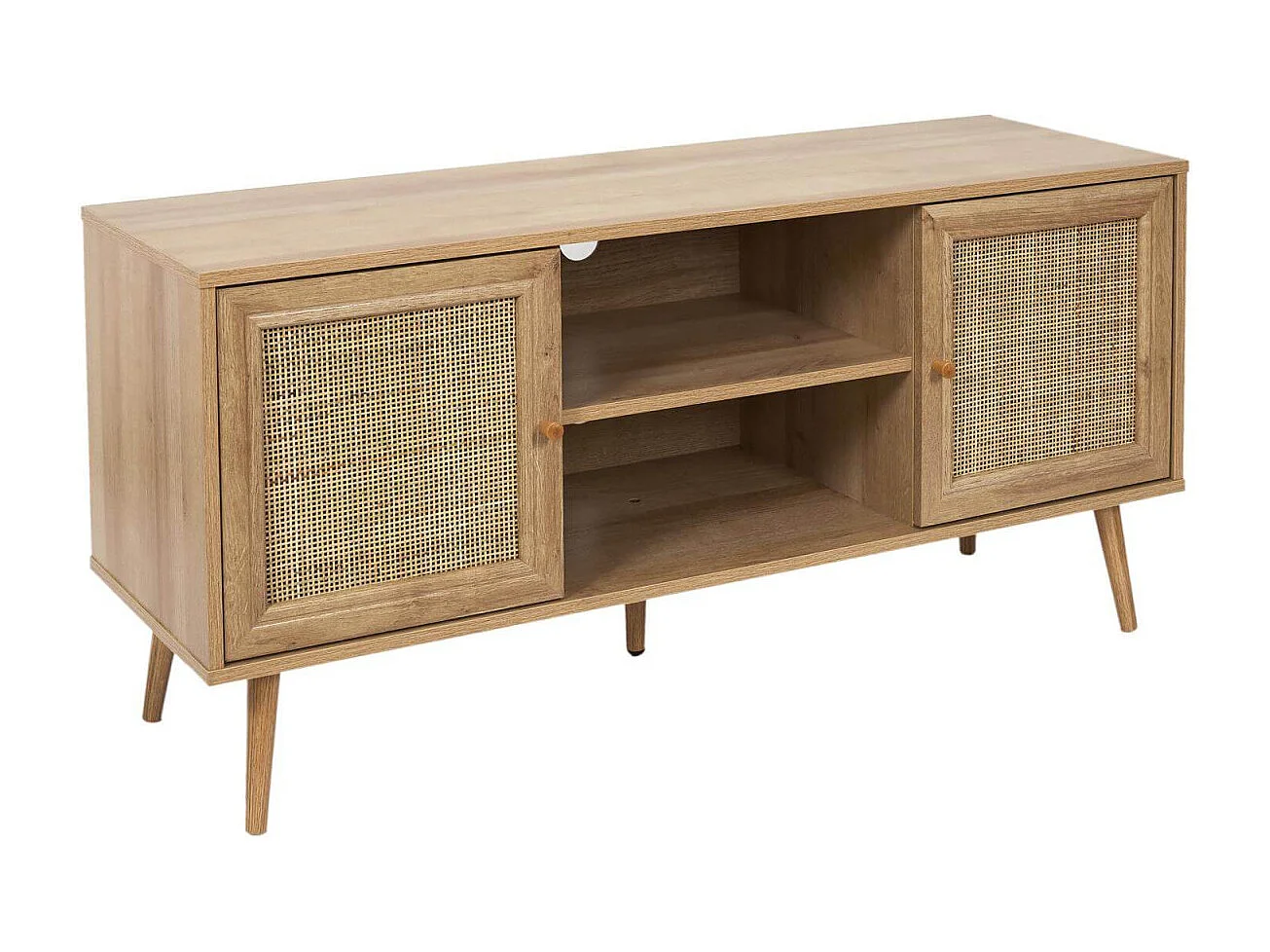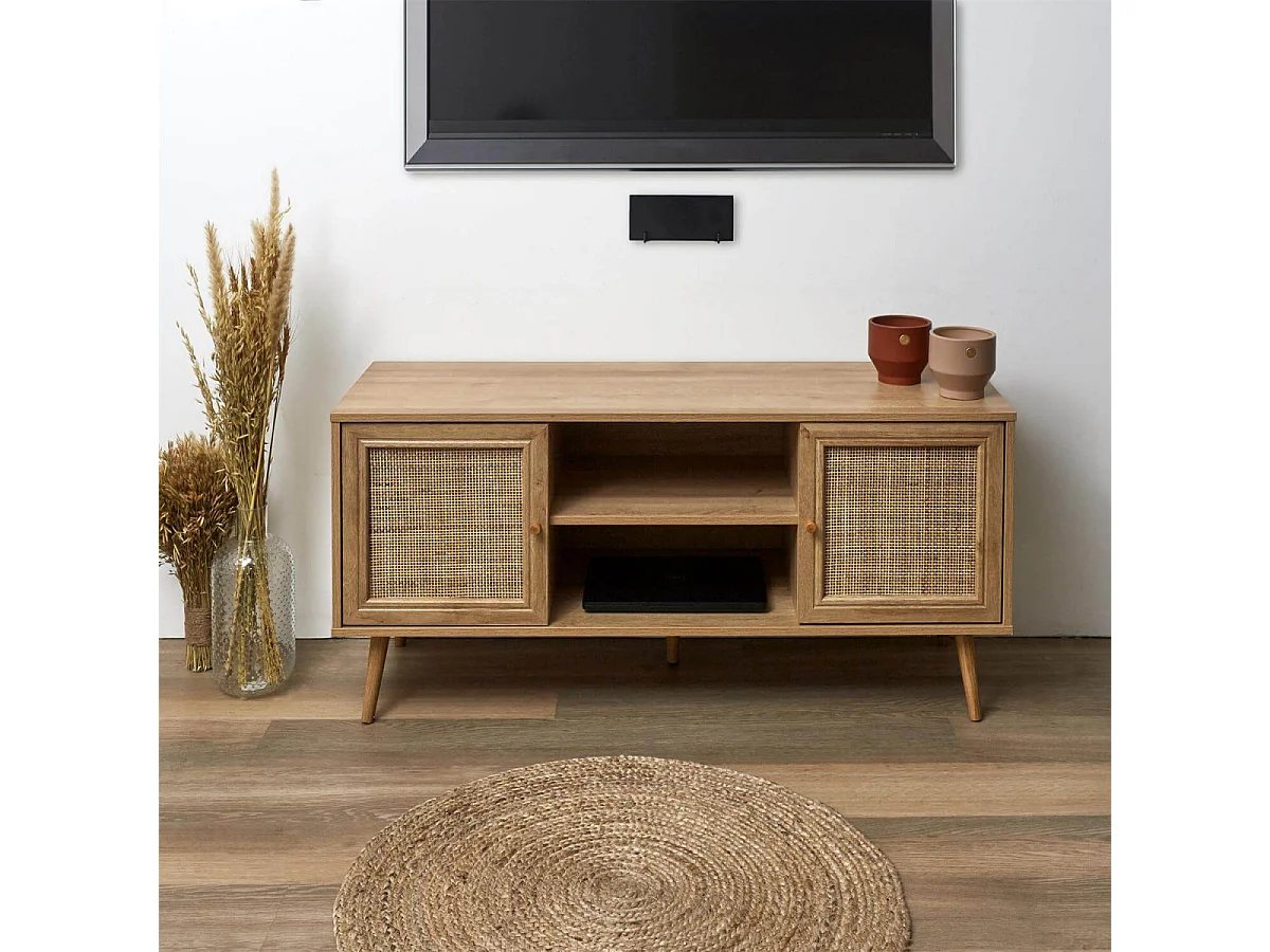 MAYA - Meuble TV 2 Portes Effet Bois et Façades Rotin
