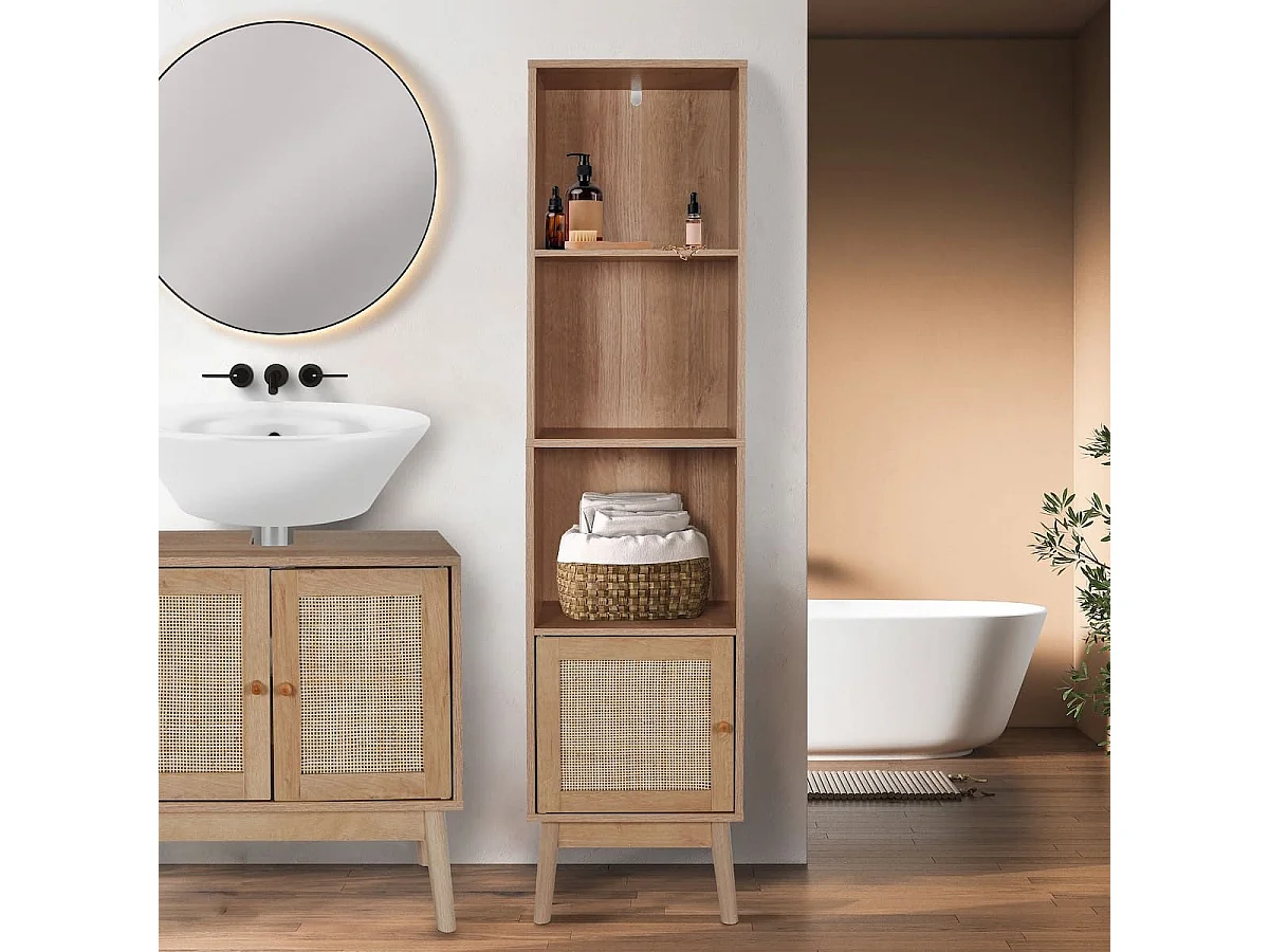MAYA - Rangement Colonne 3 Etagères 1 Porte Effet Bois et Façades Rotin