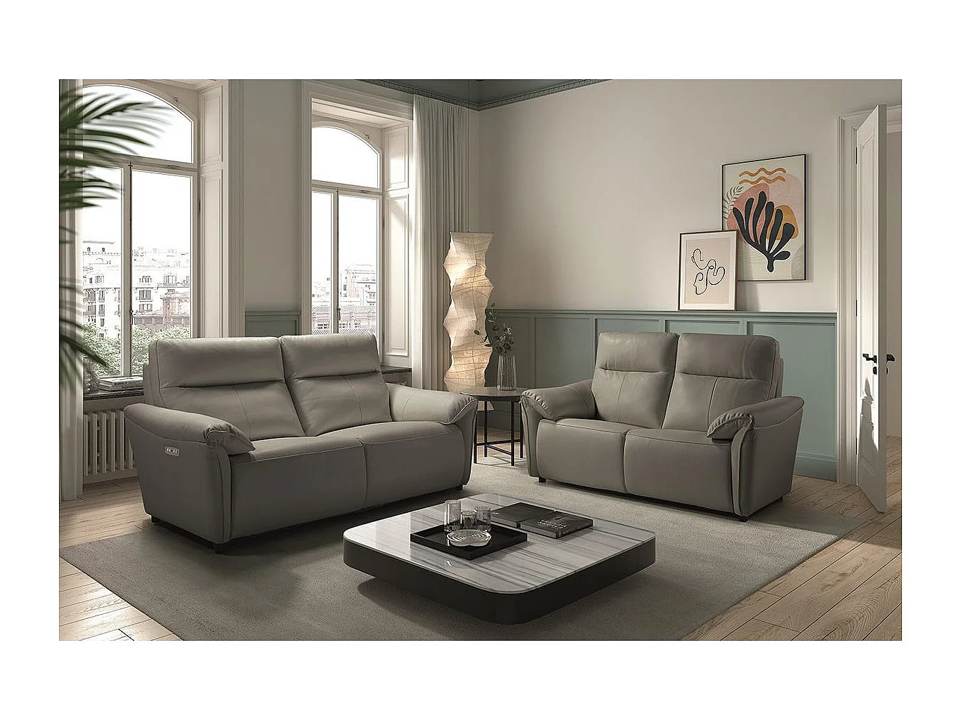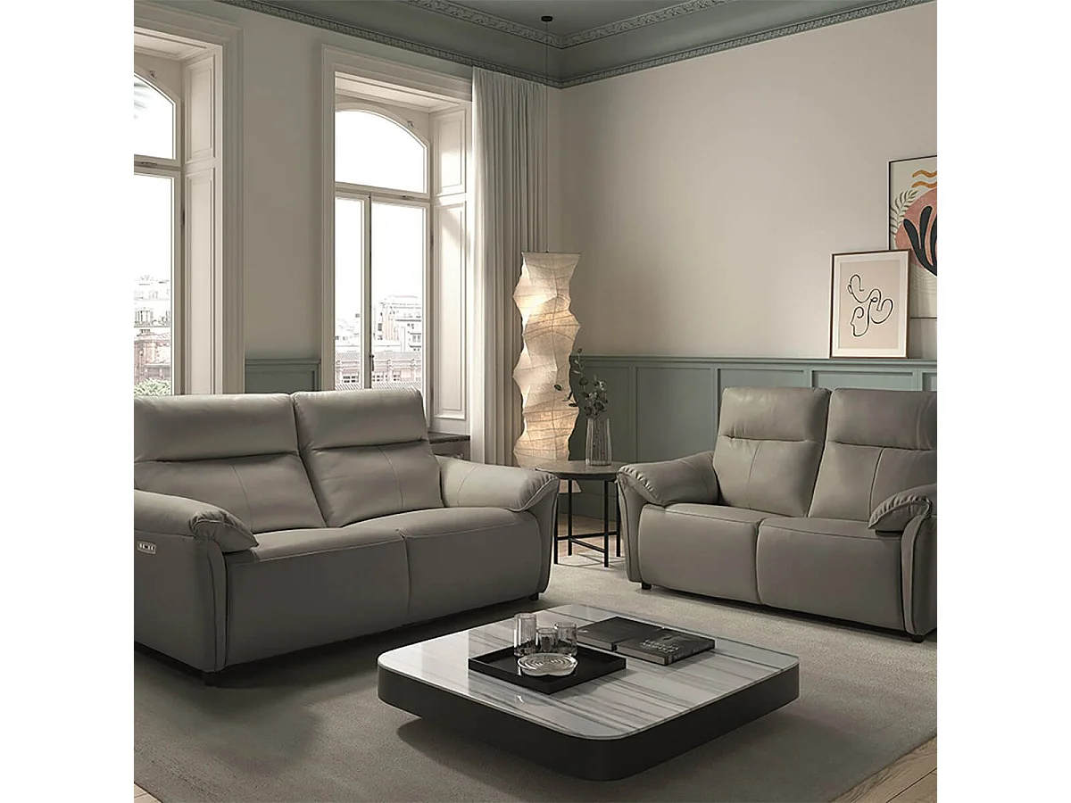 MAZARO - Canapés 3 Places Relax Electrique + 2 Places Fixe Cuir Gris éléphant