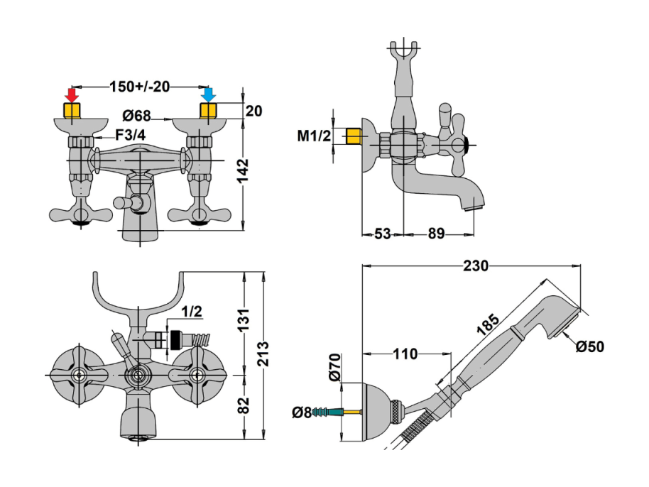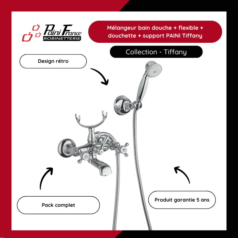 Mélangeur bain douche + flexible + douchette + support PAINI Tiffany Chromé