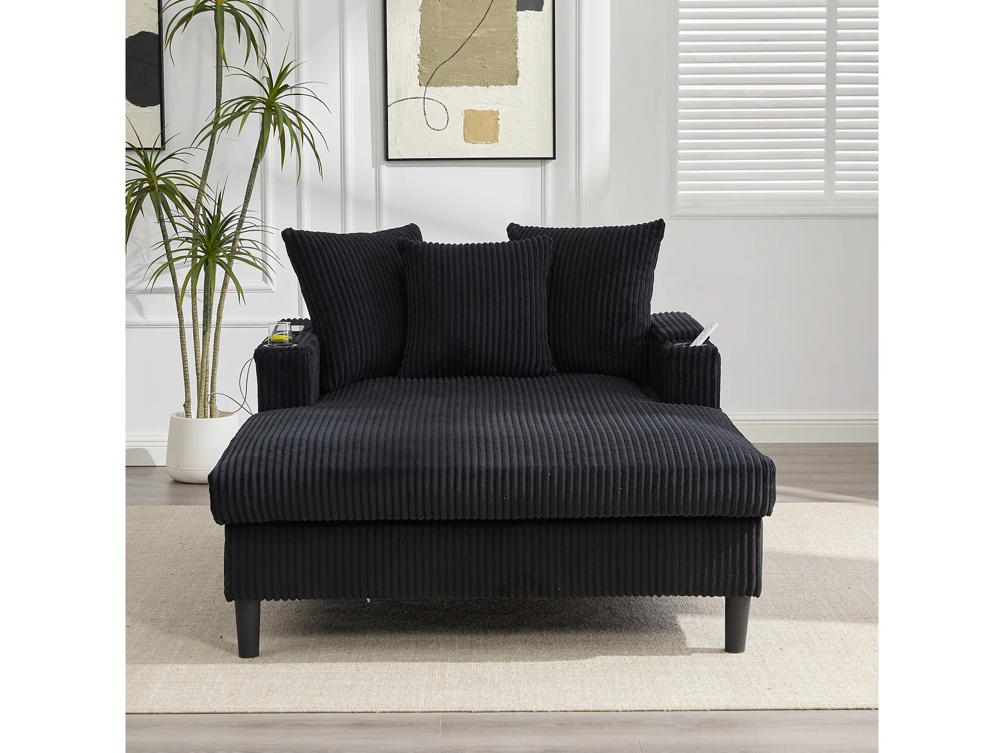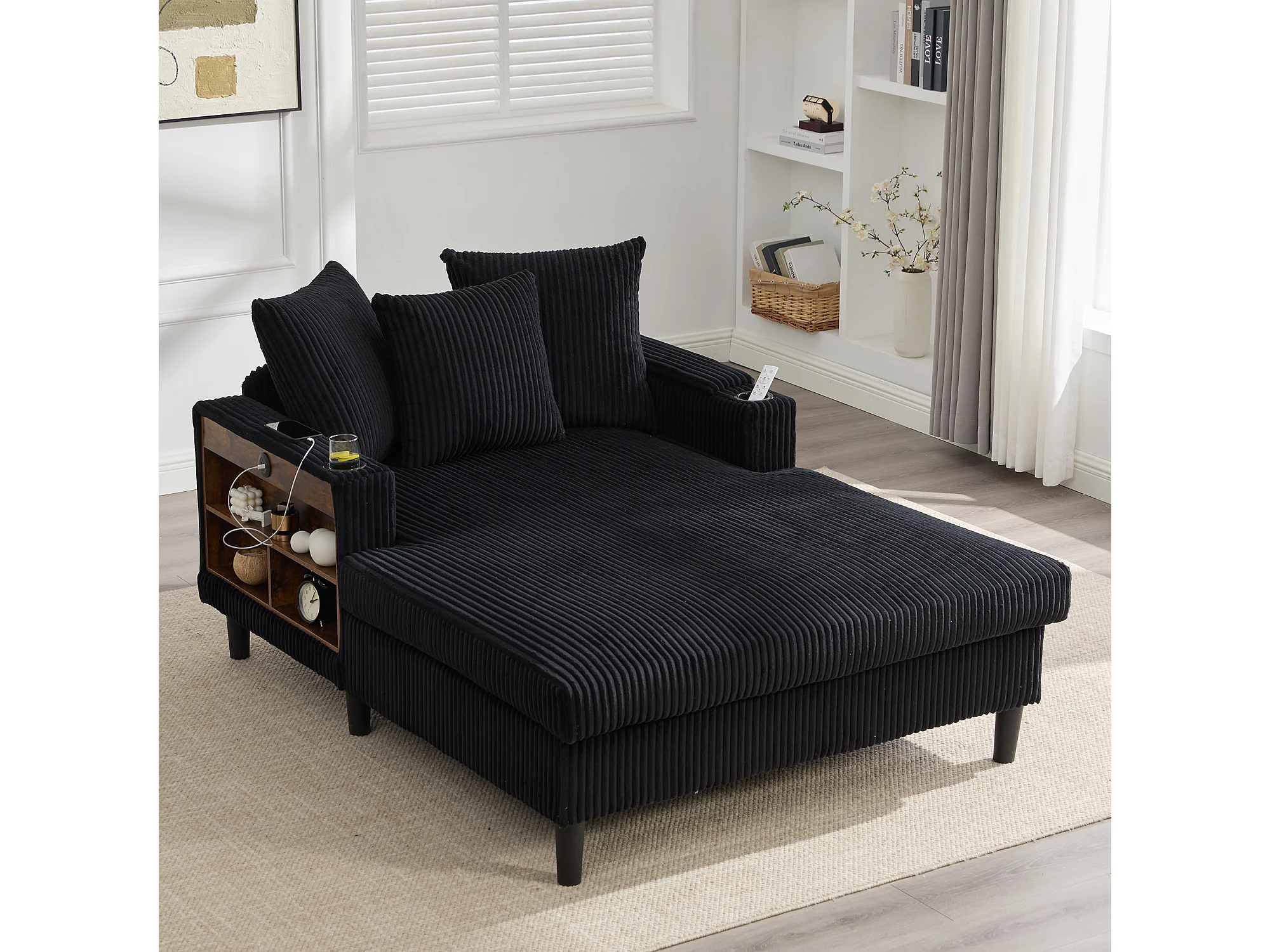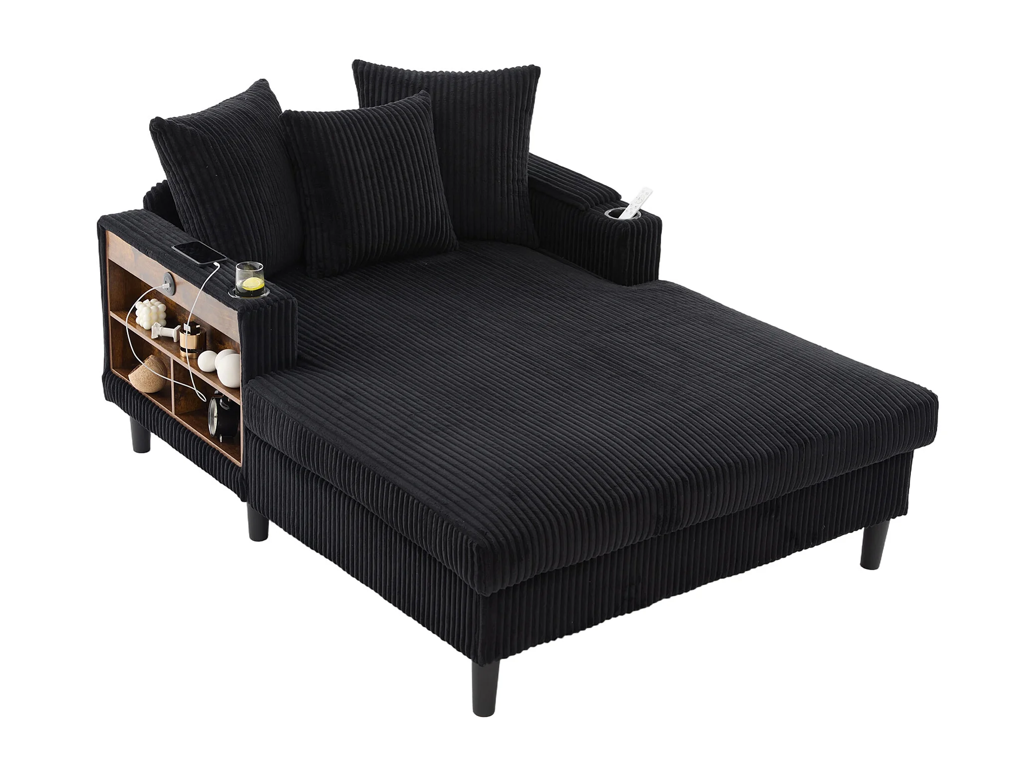 Méridienne 2 places en velours côtelé - 170 x 129 x 70 cm - avec porte-gobelets + Leds + USB + étagères + poche - noir