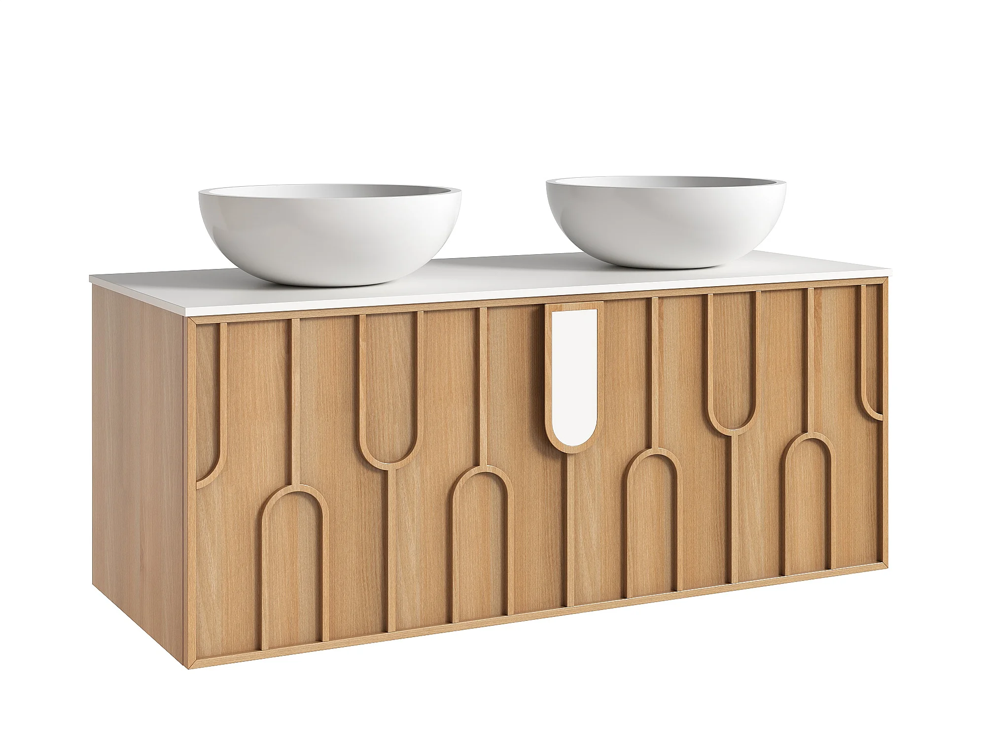 Meuble de salle de bain texturé suspendu avec double vasque à poser ronde en solid surface - Naturel clair - L120 cm - MERKAN