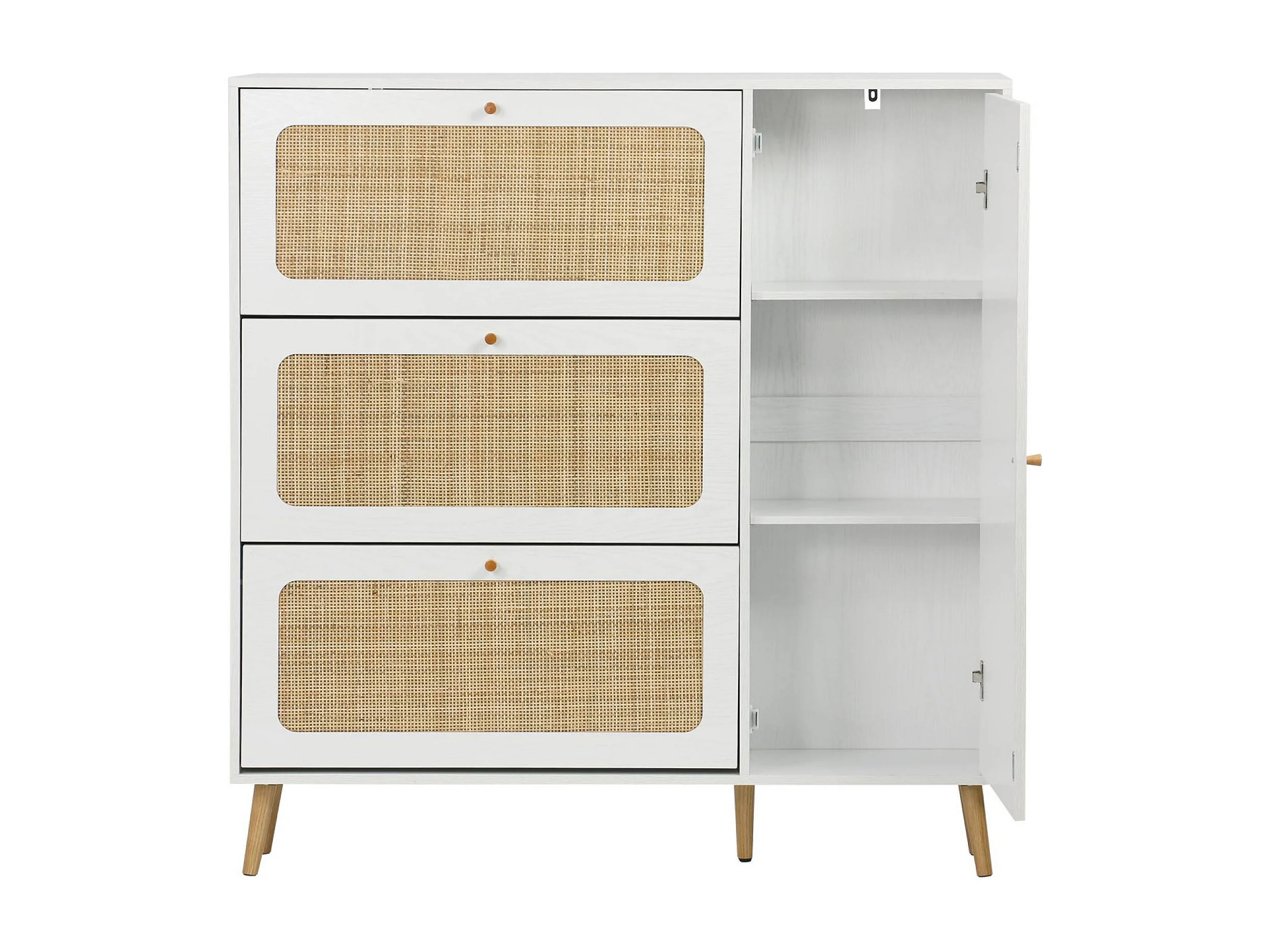Meuble à chaussure cannage Bohème blanc. 3 abattants. 1 porte. 21 paires. 120 x 24 x 125 cm