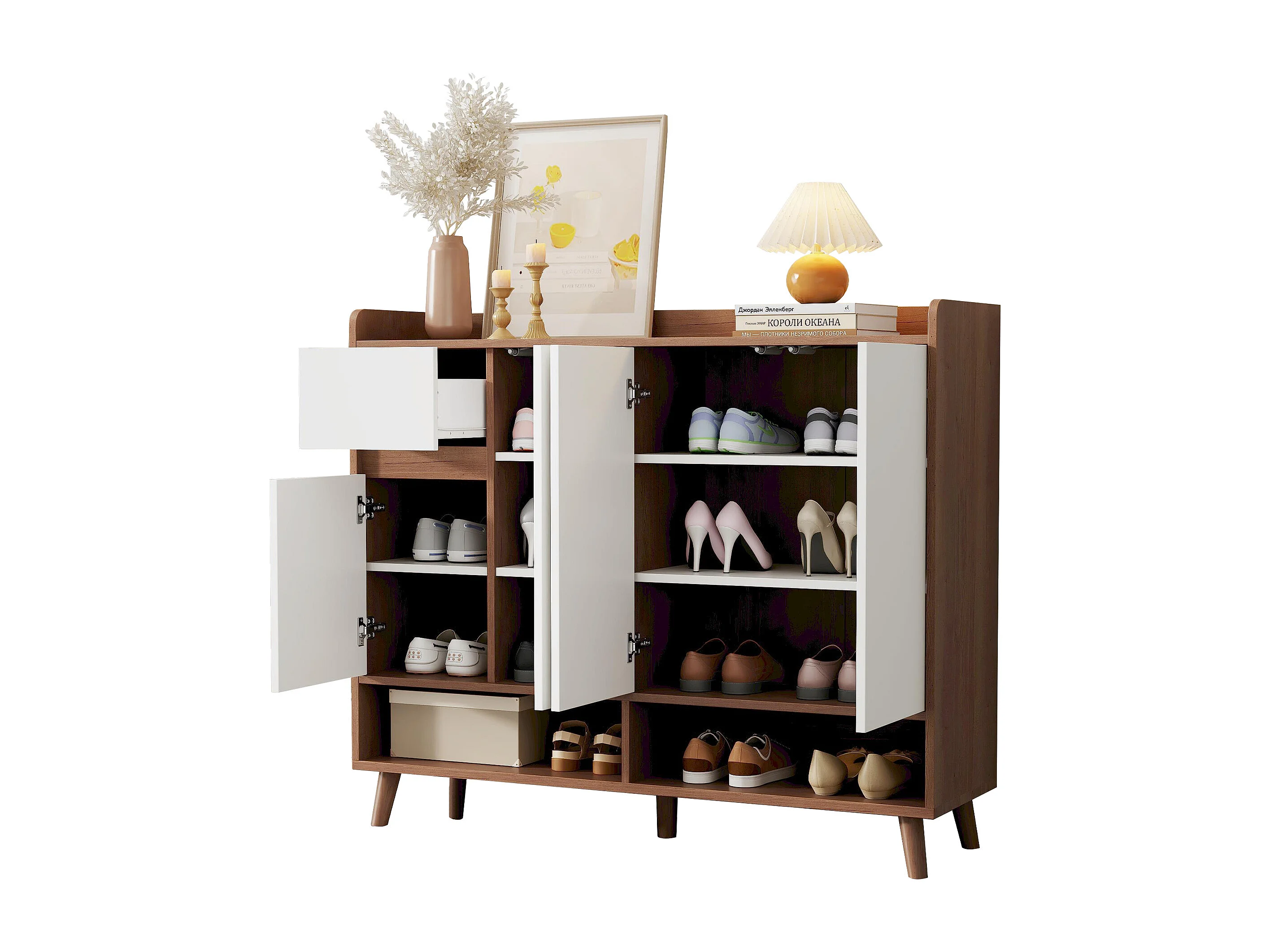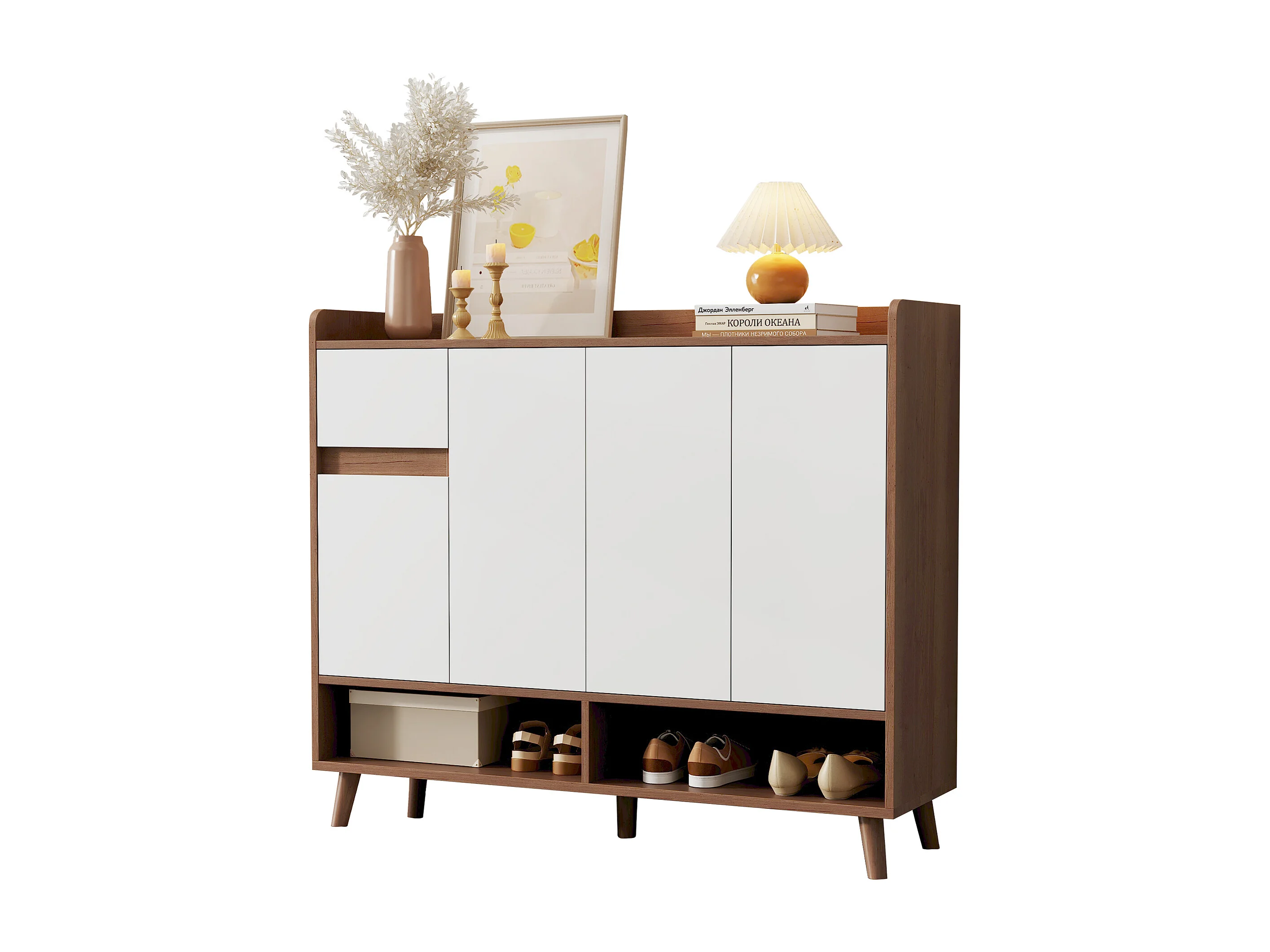 Meuble à chaussures 120x35x90cm - avec 4 portes et 1 tiroir - étagère réglable - Naturel + Blanc