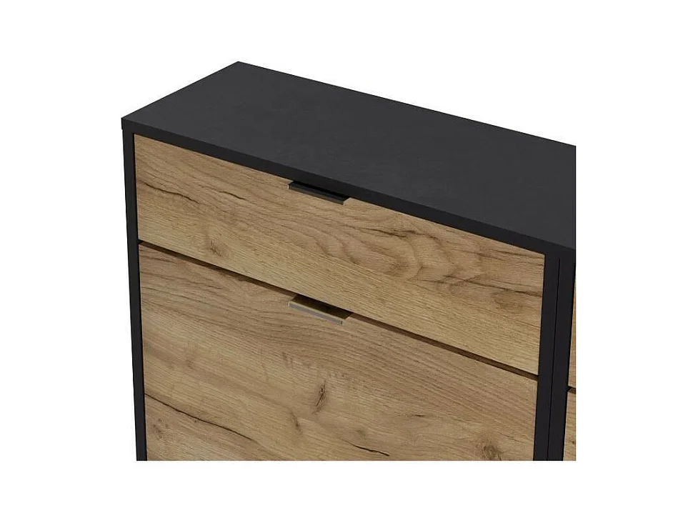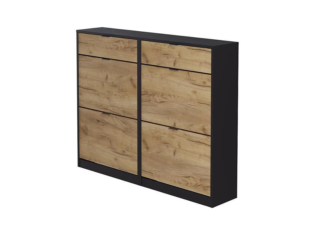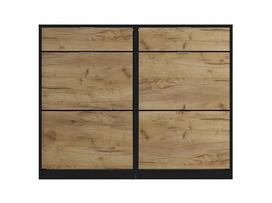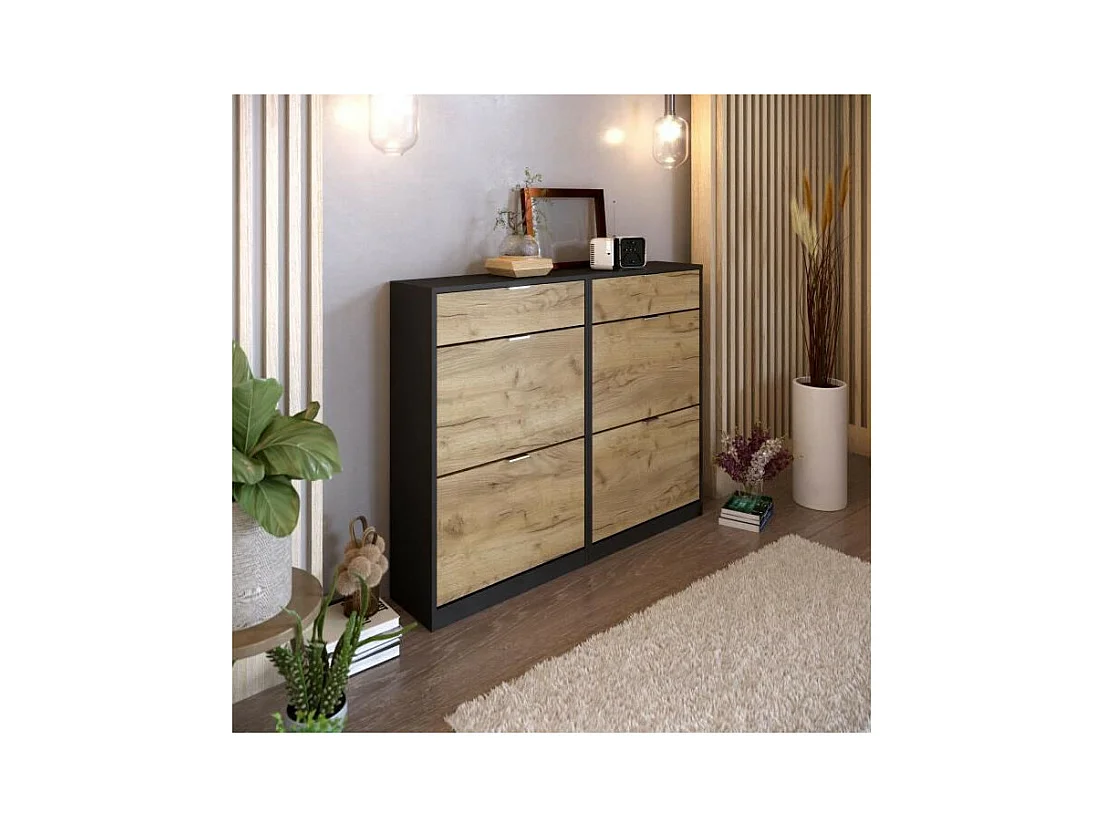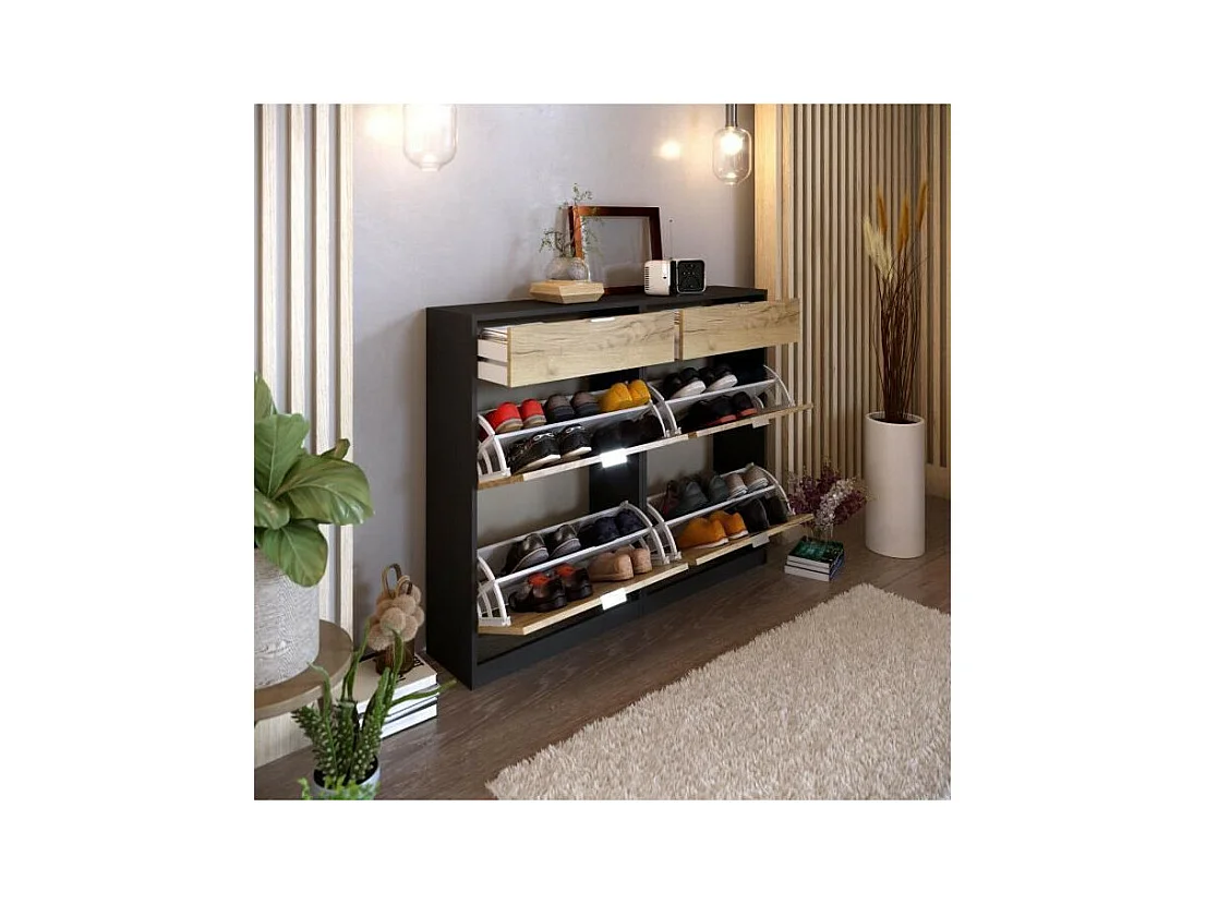 Meuble a chaussures - 4 portes 2 tiroirs - Chene et noir - 124x25x99 cm - Leona