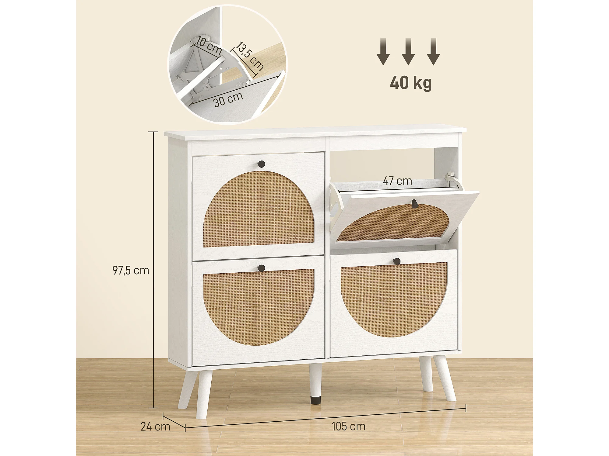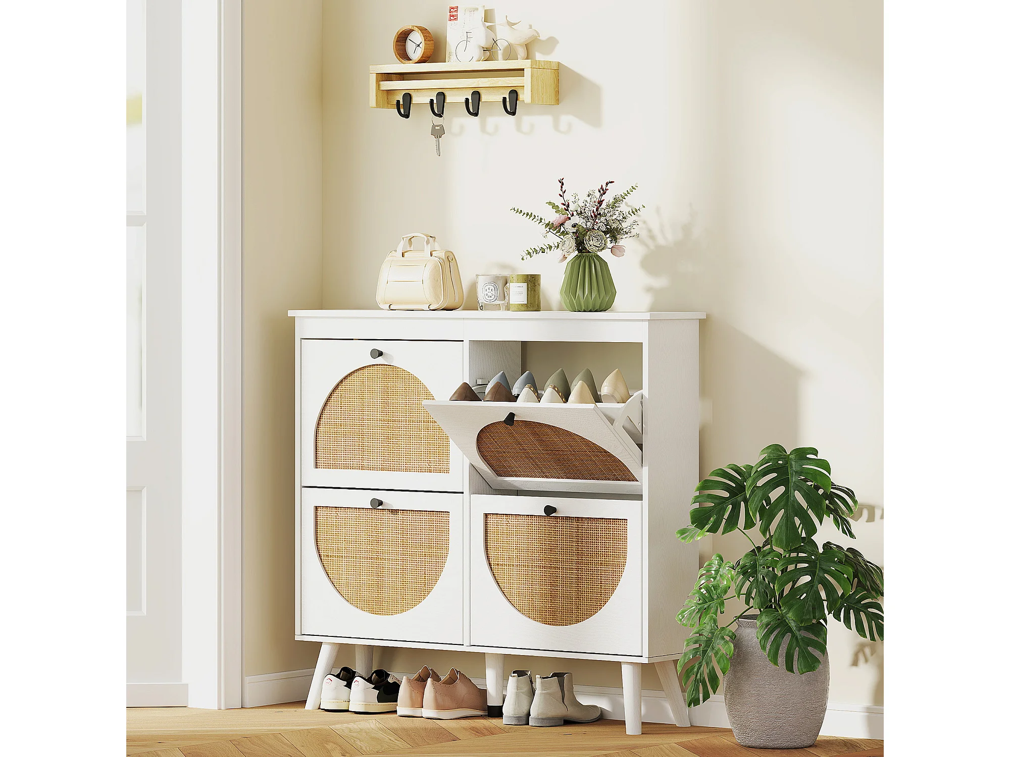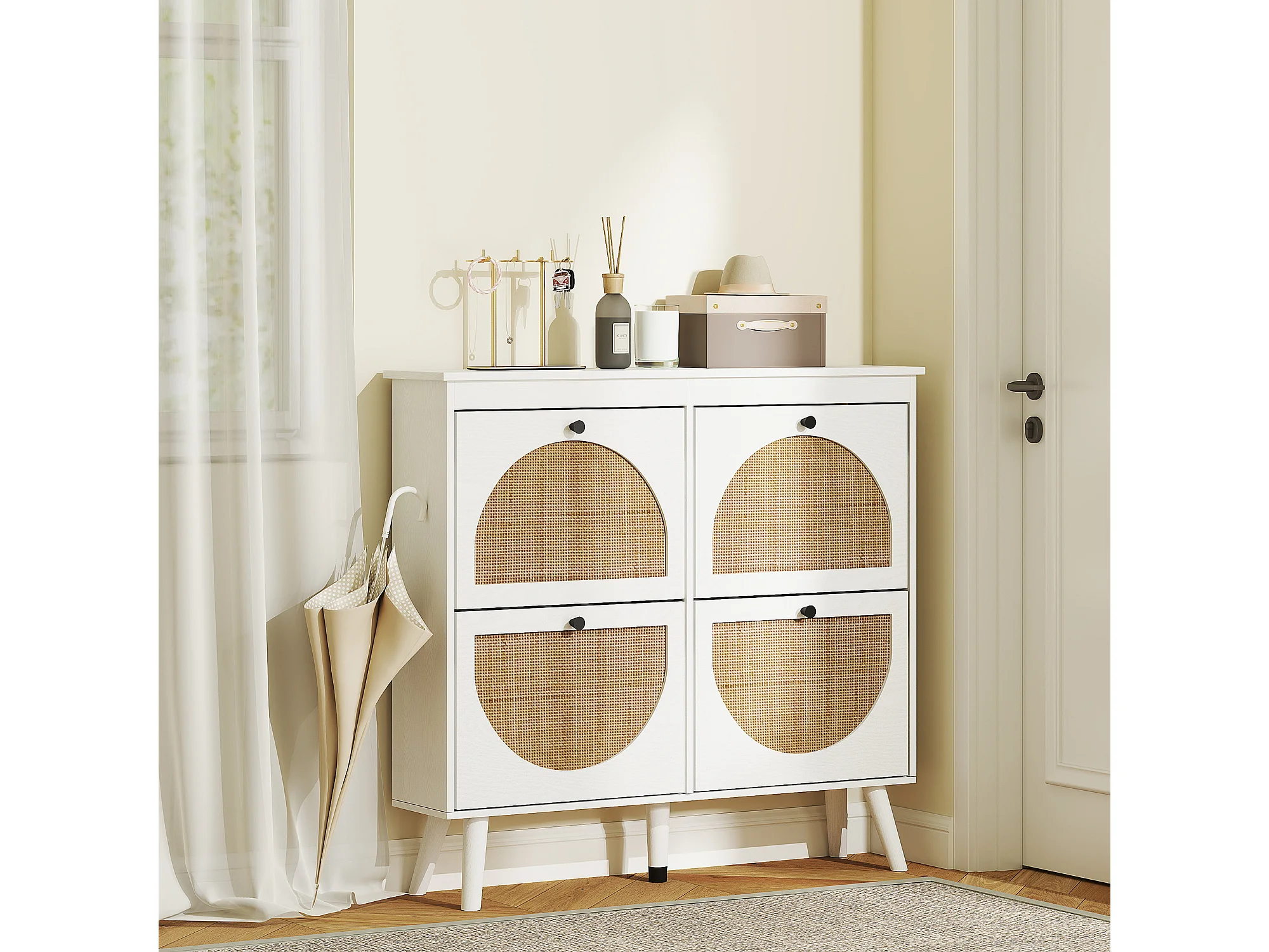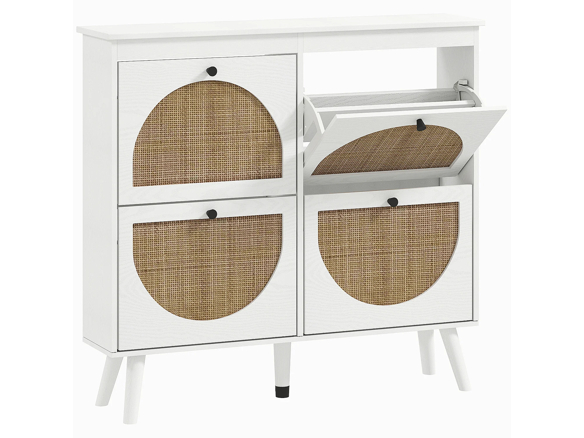 Meuble à chaussures 4 portes abattantes style bohème - façades motif semi-circulaire rotin - pieds bois aspect bois blanc