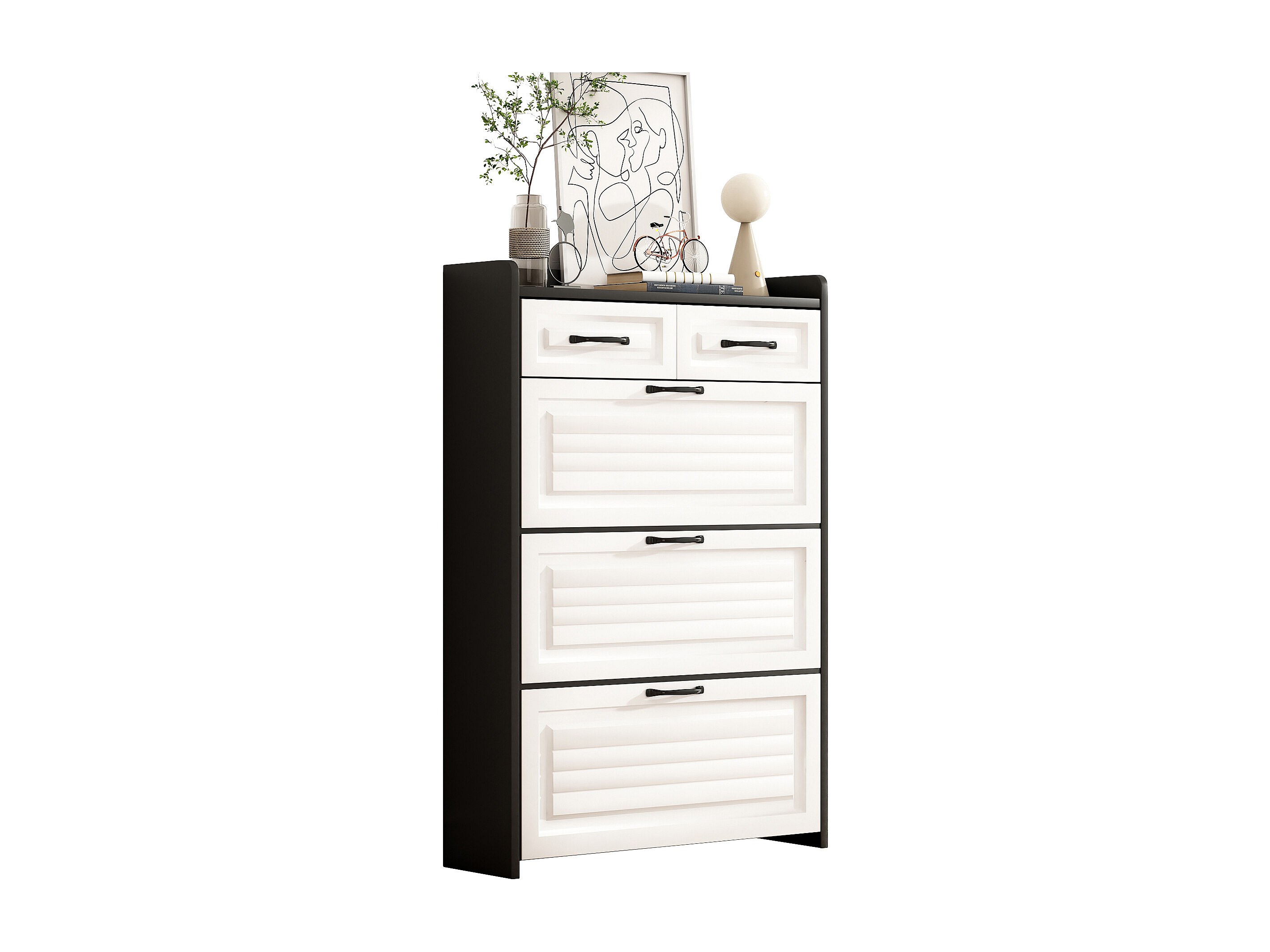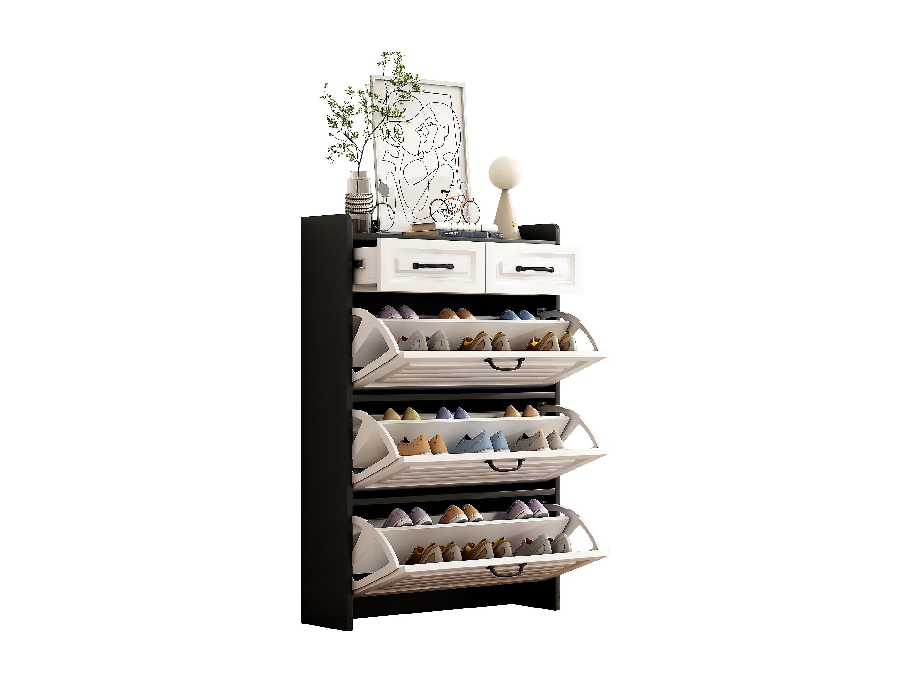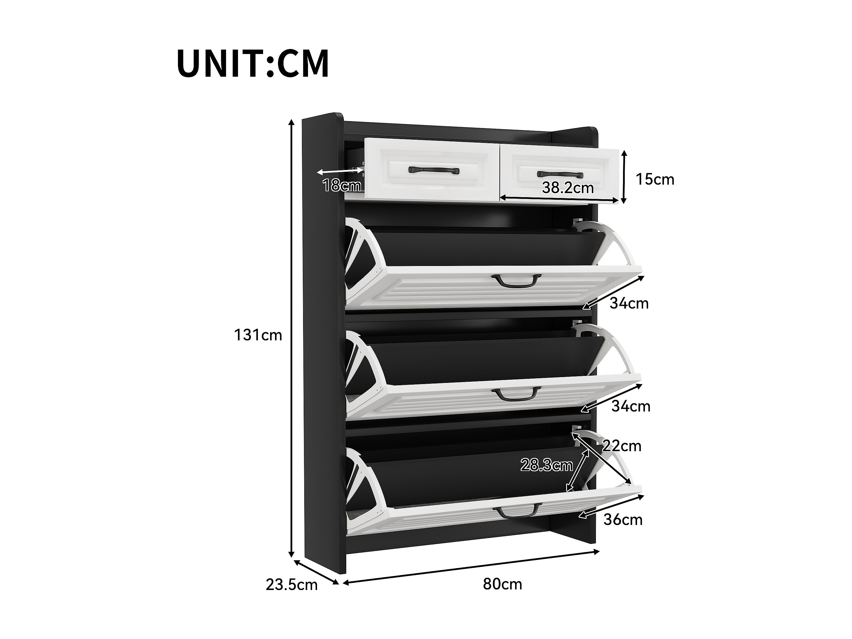 Meuble à chaussures 80x23.5x131cm - avec trois grands abattants - avec 2 tiroirs - noir + blanc