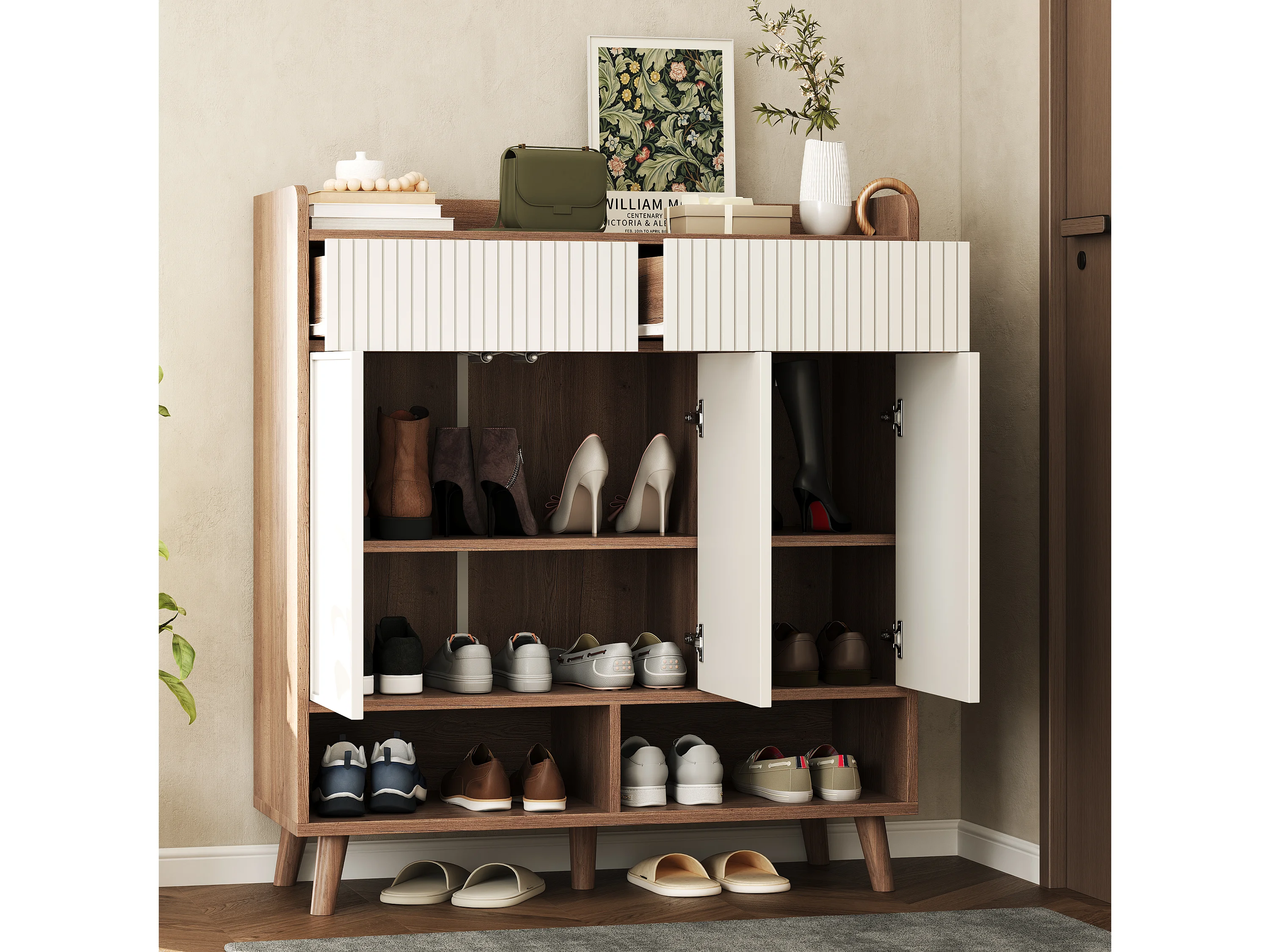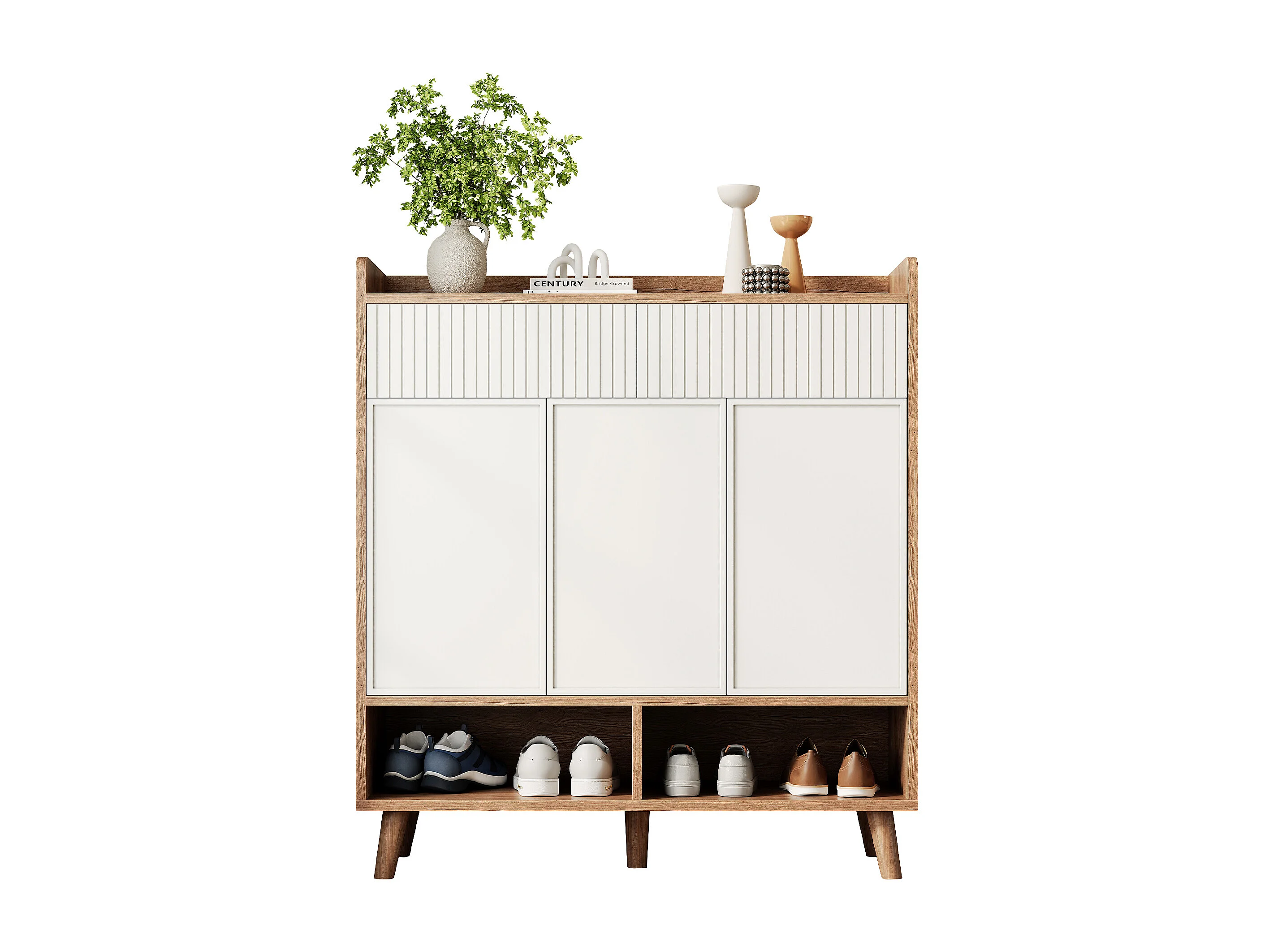Meuble à chaussures 90x35x100cm - avec 2 tiroirs et 3 portes - avec des pieds de meuble en bois - Blanc + Naturel