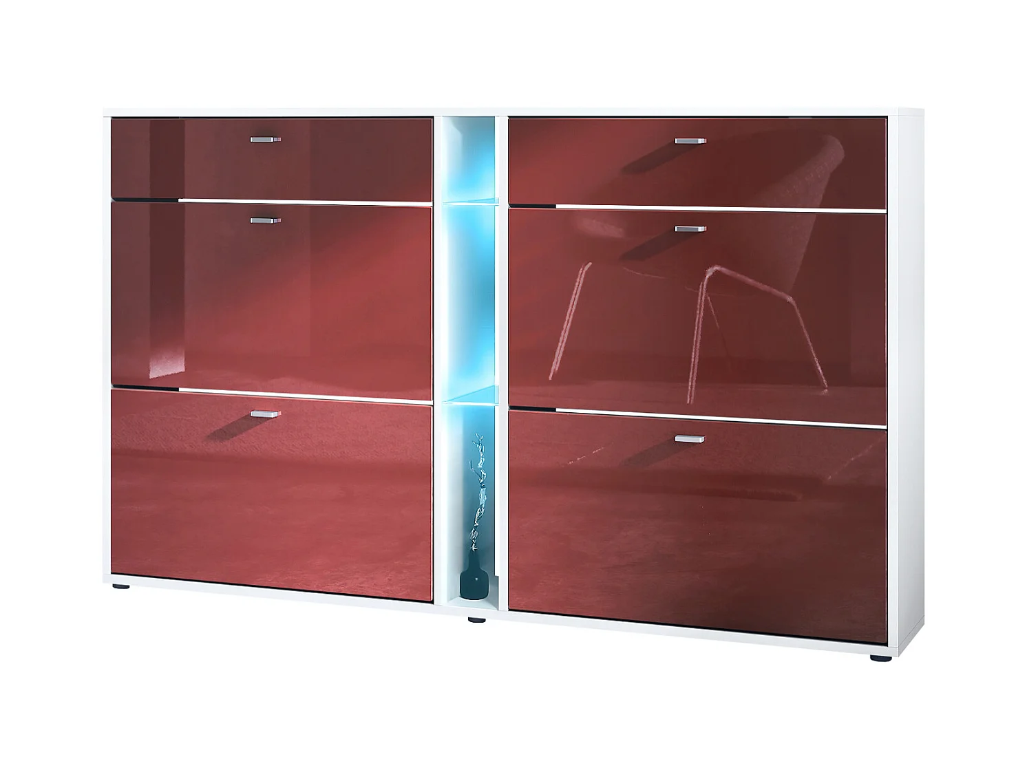Meuble à chaussures à bascule Today 155,5 x 95 x 28 cm, avec un éclairage LED bleu, corps en Blanc mat, façades en bordeaux haute brillance