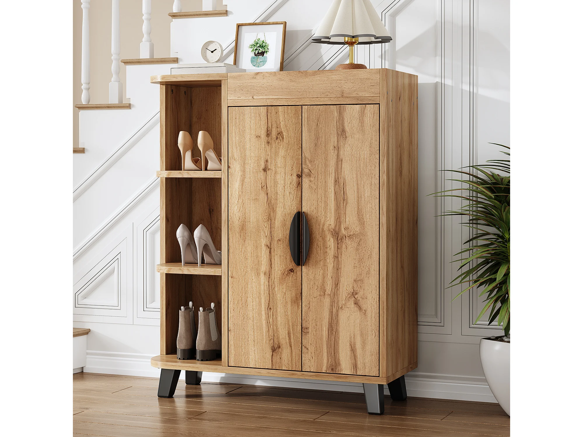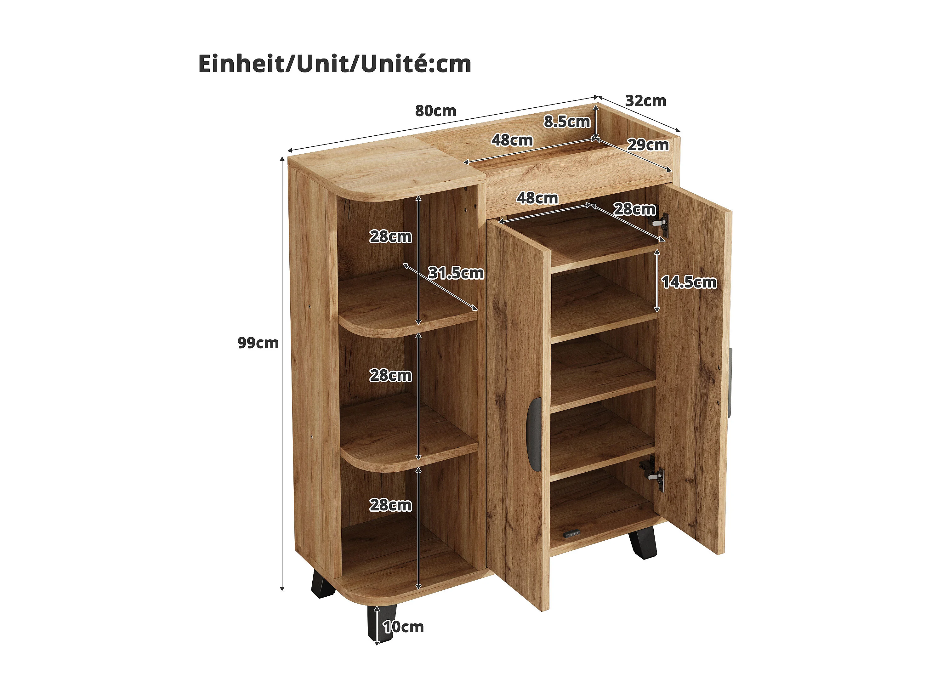 Meuble à chaussures aspect bois pour entrée - 80 x 32 x 99 cm - avec 2 portes + étagères ouverts - aggloméré - naturel