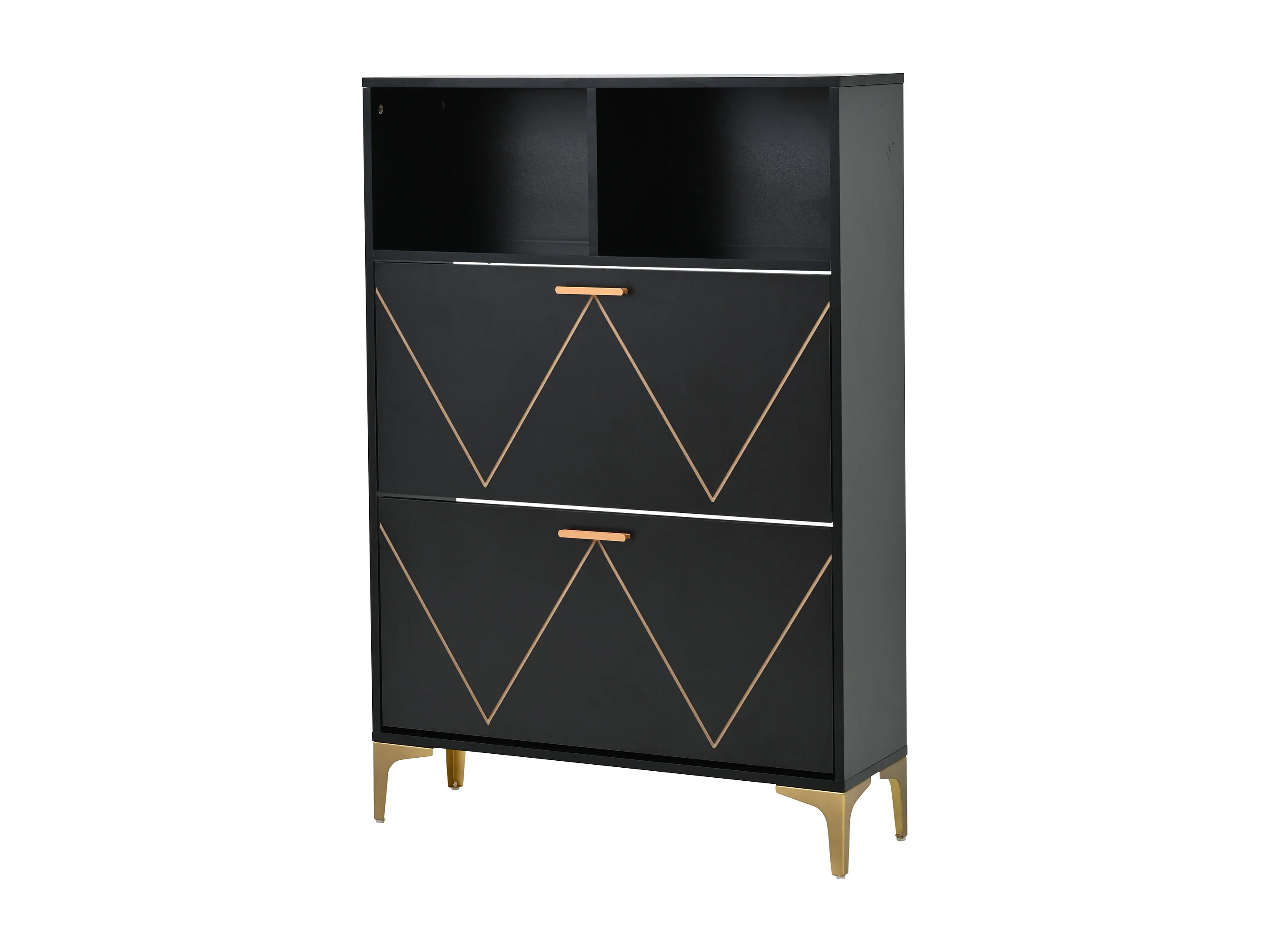 Meuble à chaussures noir avec 2 tiroirs de rangement et 4 portes, poignées et pieds dorés