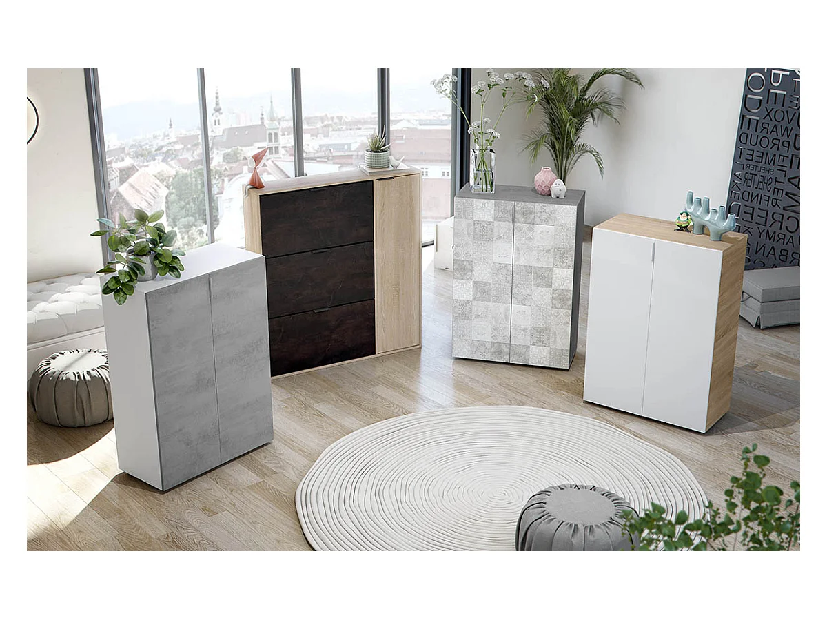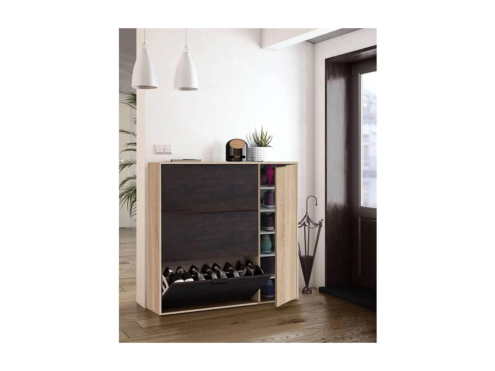 Meuble à Chaussures avec 3 abattants et 1 porte coloris chêne canadien / effet industriel - H115 x Longueur 106 x P22 cm