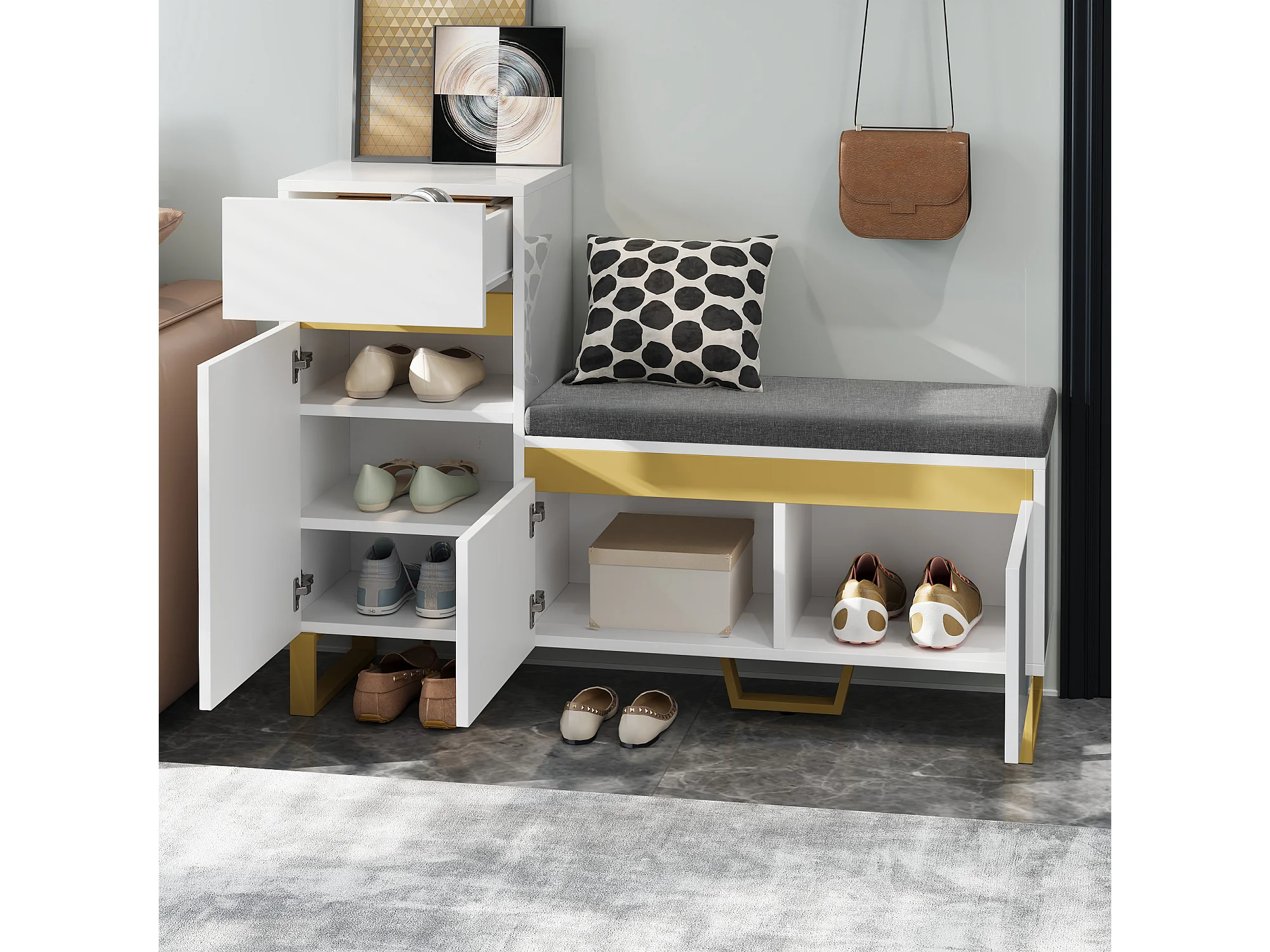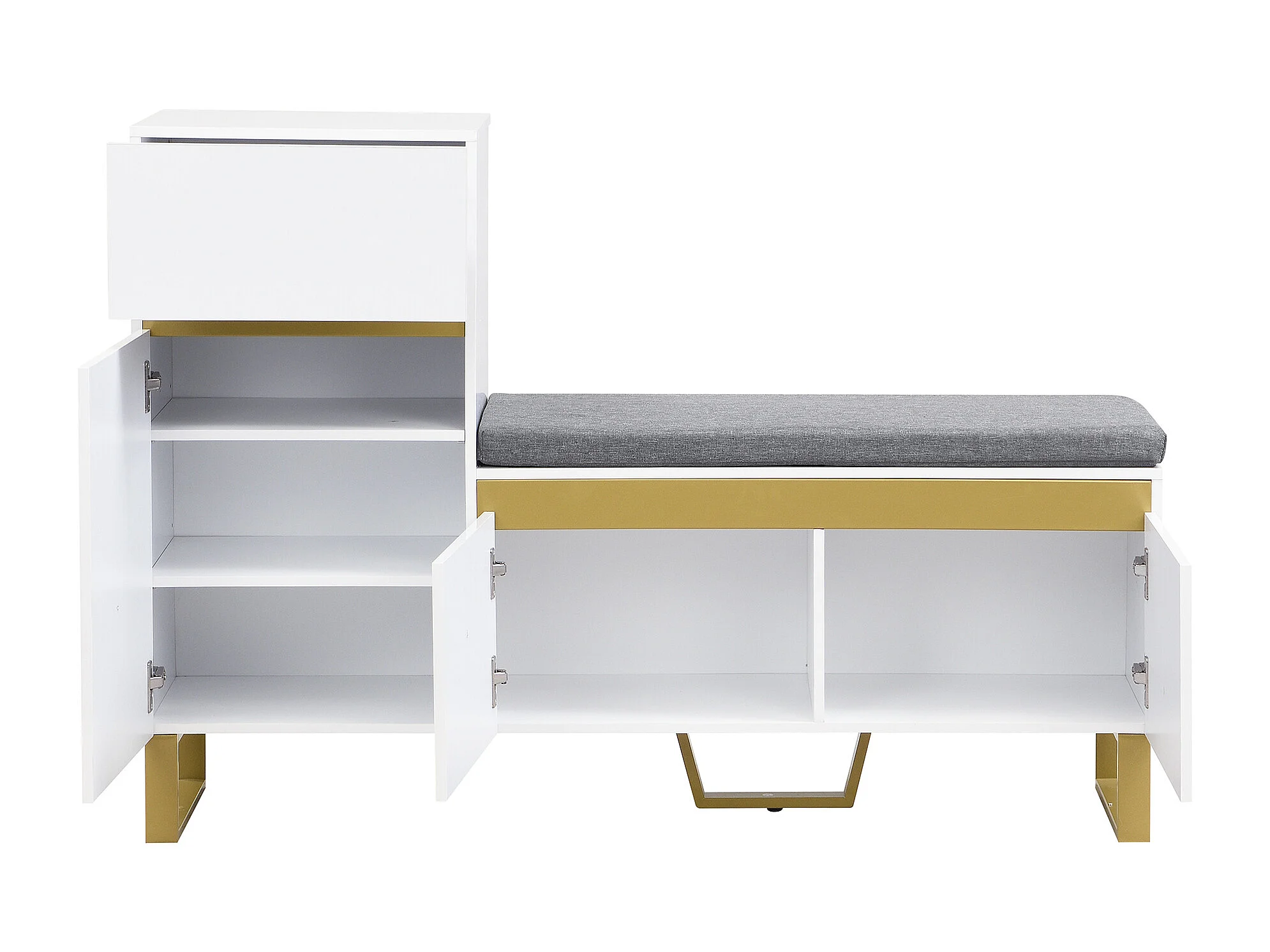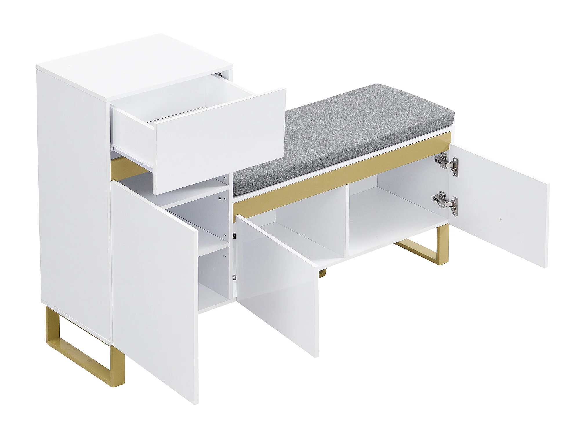 Meuble à chaussures avec 3 portes, 1 tiroir et coussin - Blanc et doré