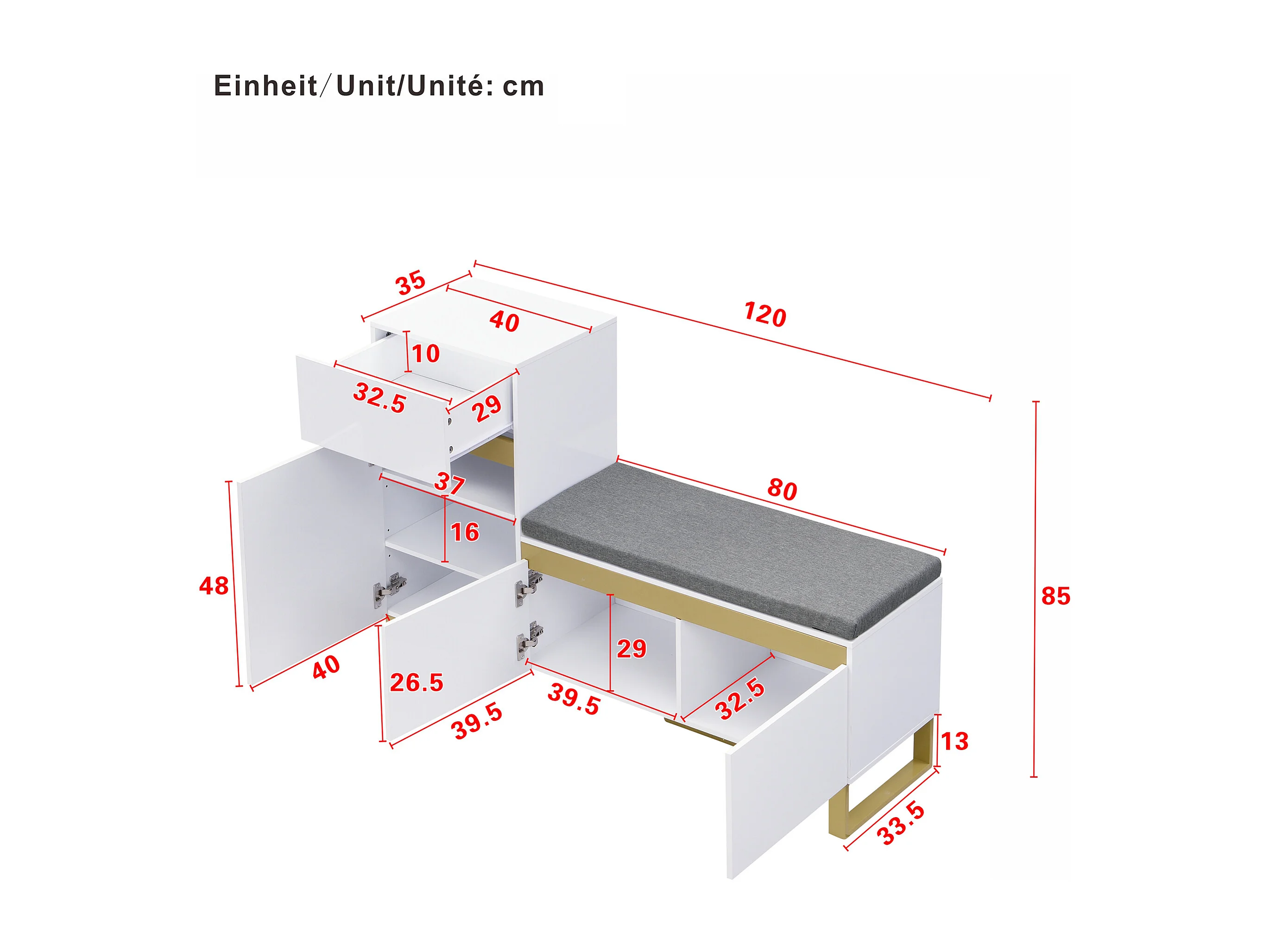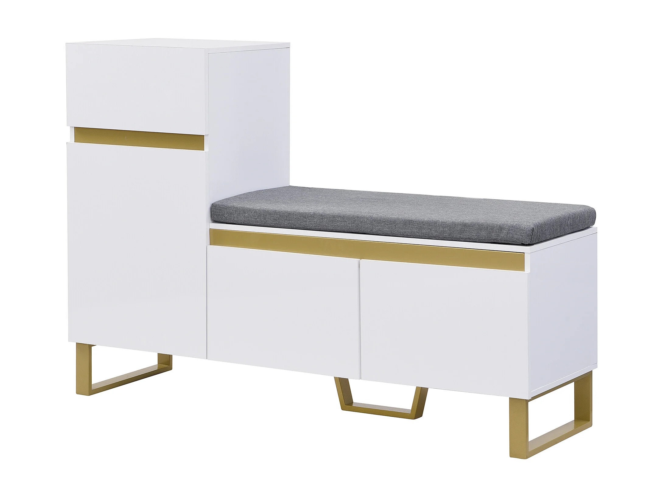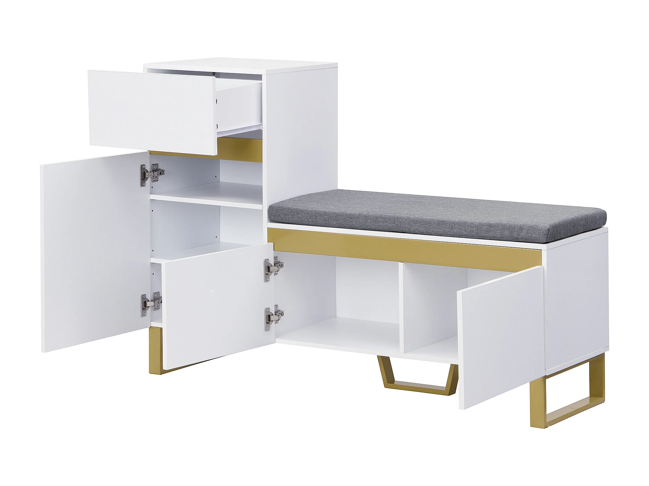 Meuble à chaussures avec 3 portes, 1 tiroir et coussin - Blanc et doré