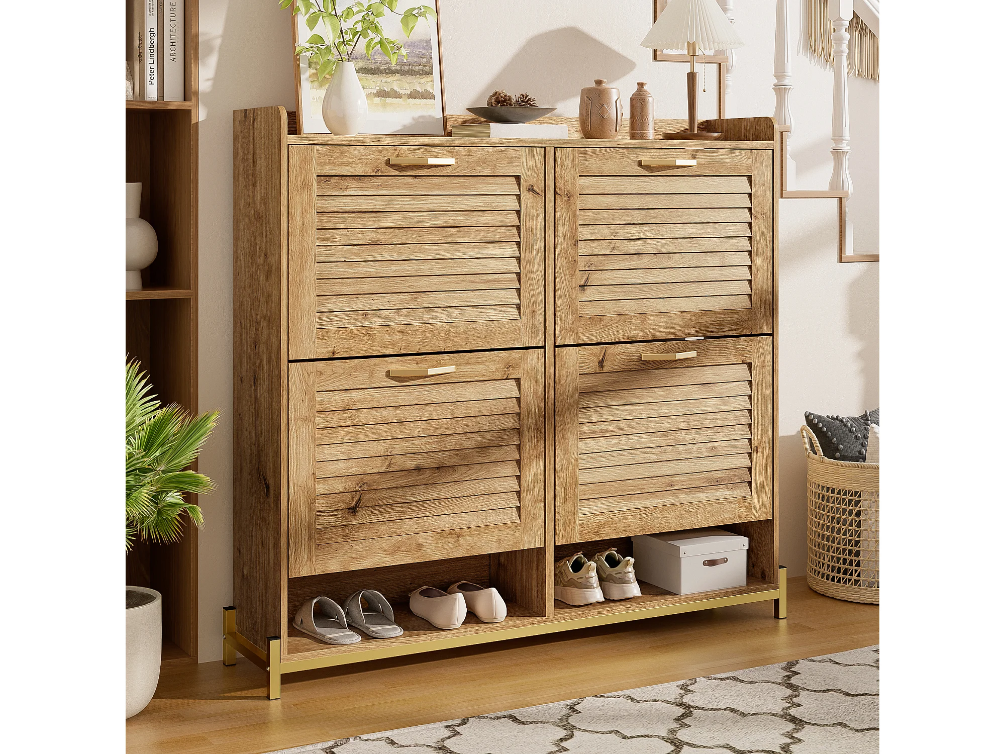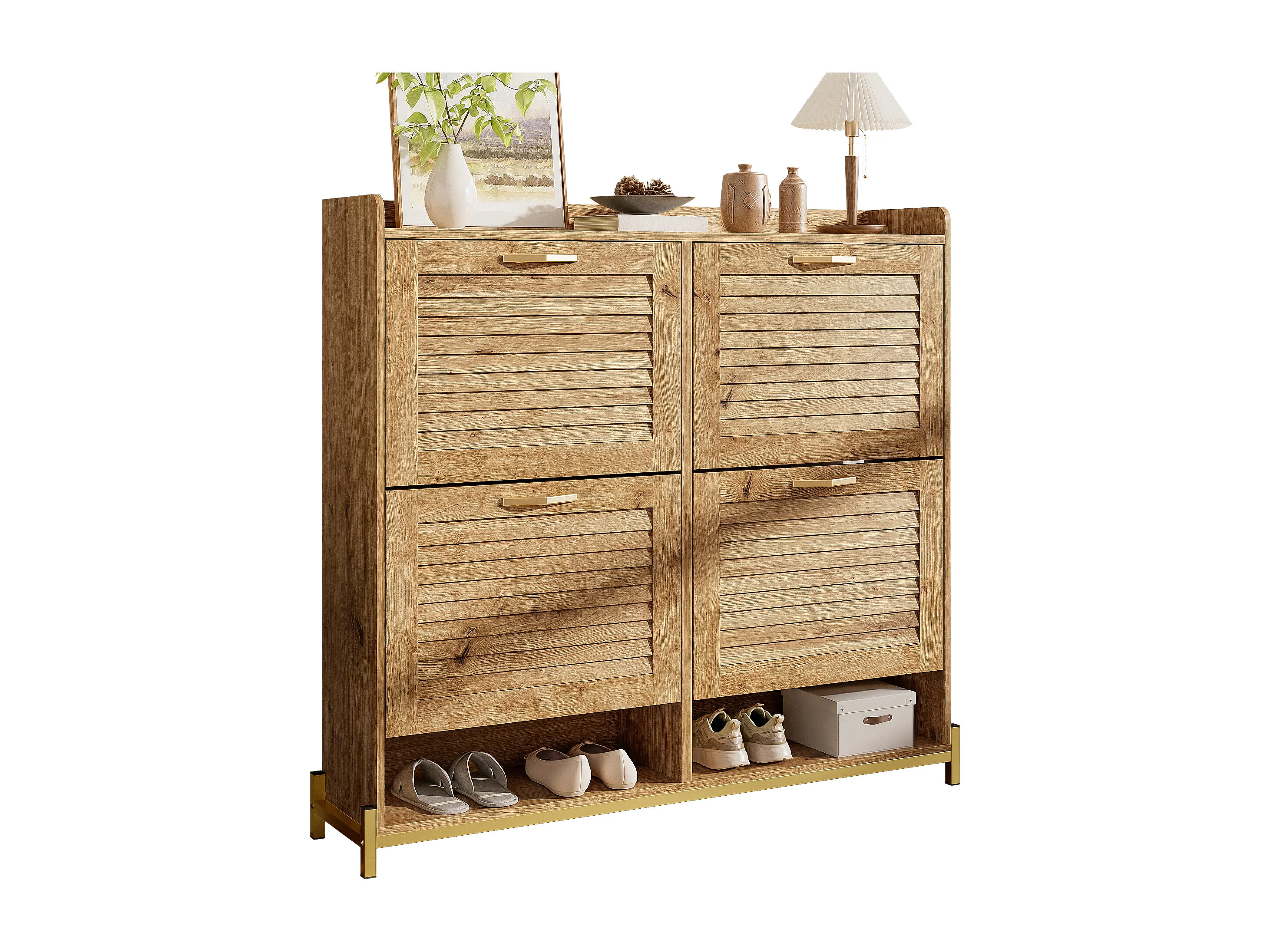Meuble à chaussures avec 4 portes à lattes en bois - 108.5 x 24 x 100 cm - structure métallique et étagère - MDF - bois