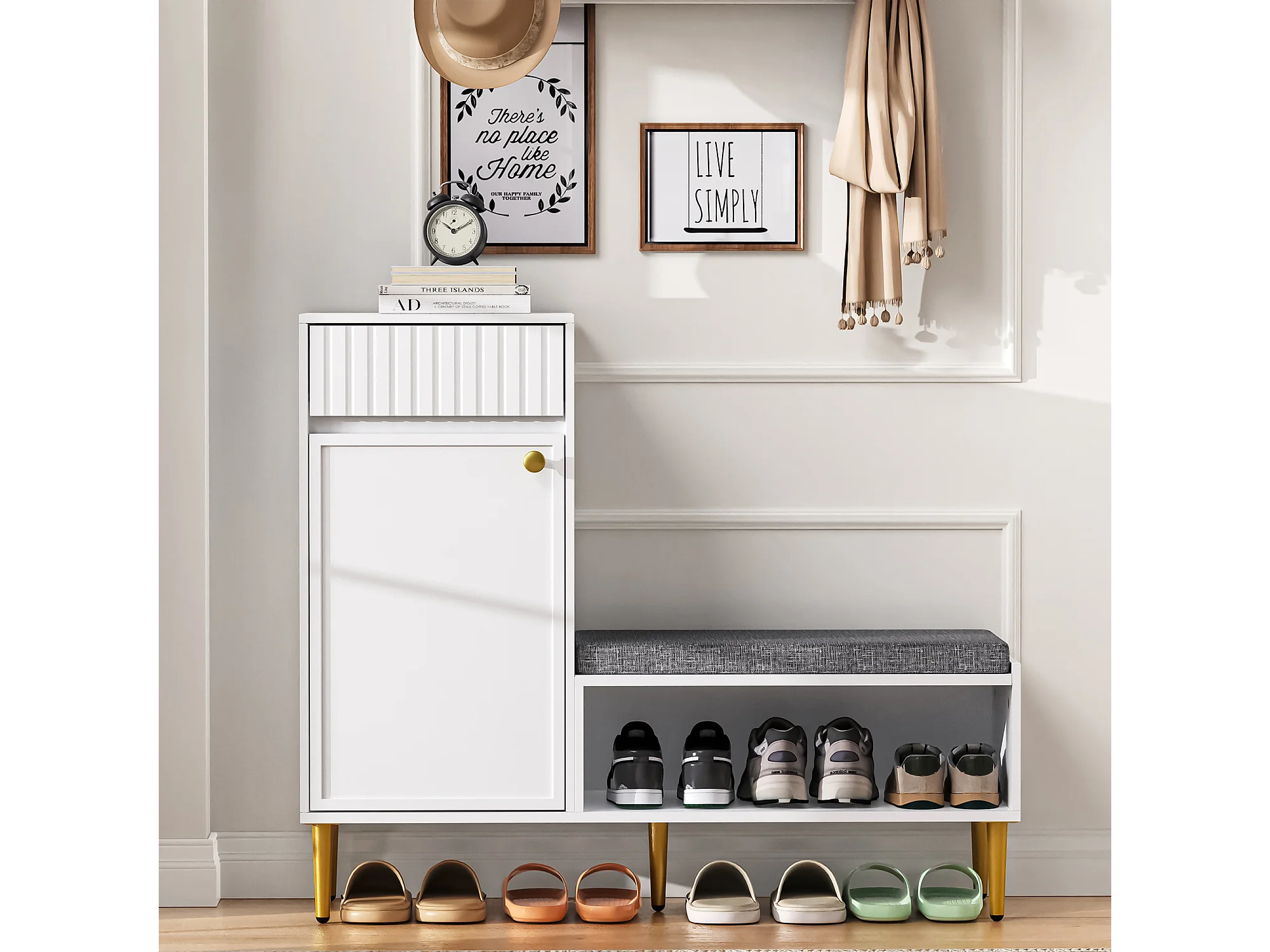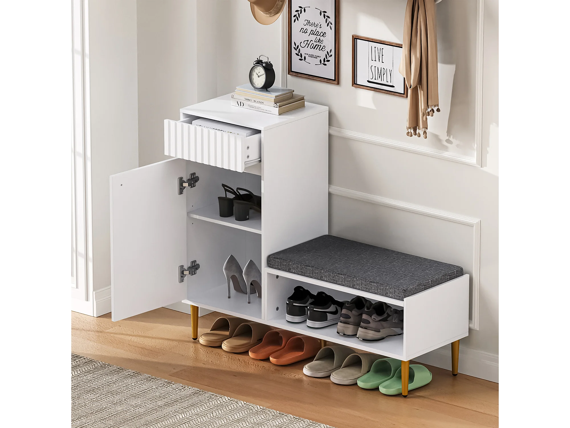 Meuble à chaussures avec banc + 1 porte + 1 tiroirs + rangement ouvert - 100 x 35 x 82 cm - aggloméré - blanc