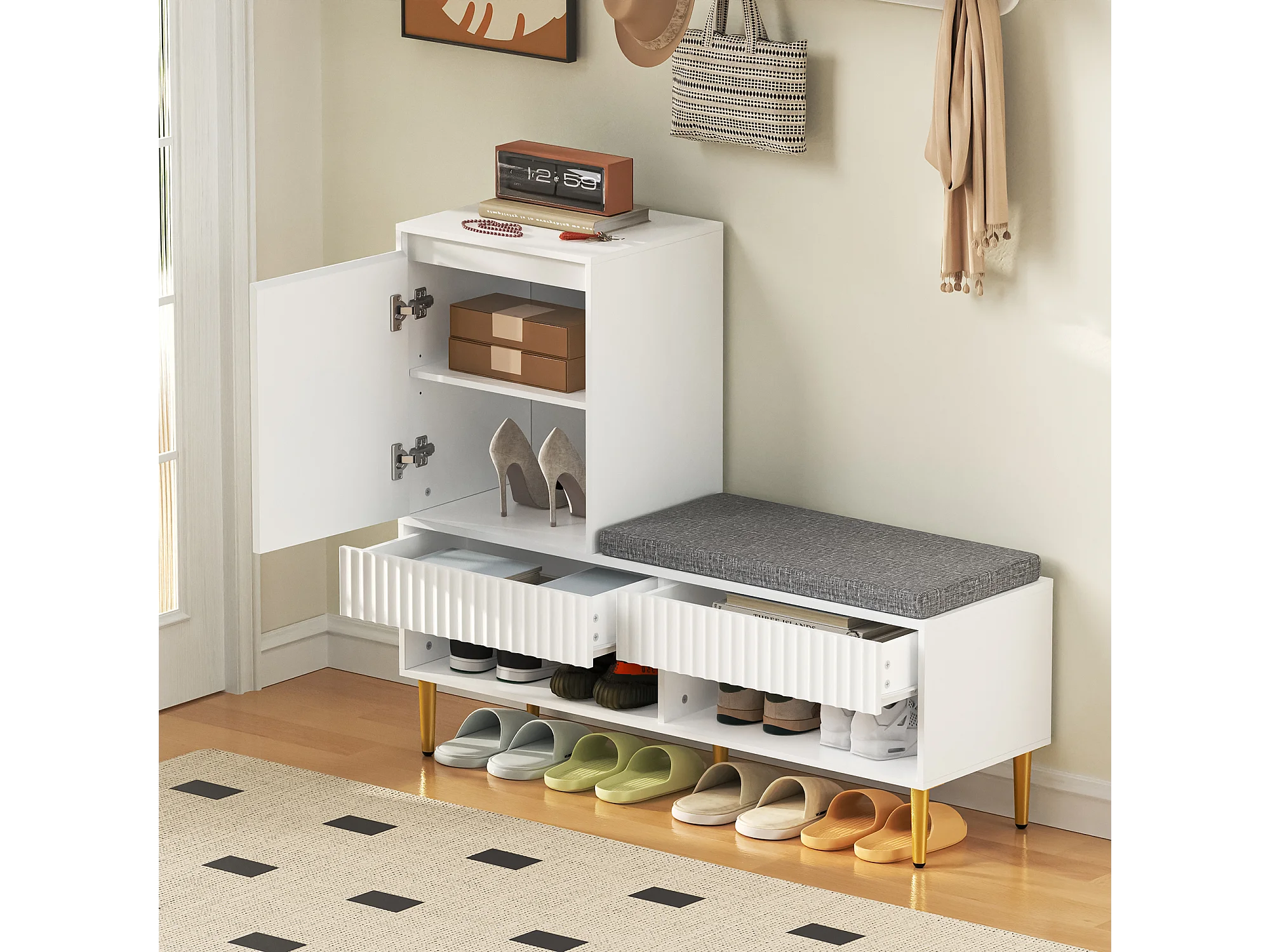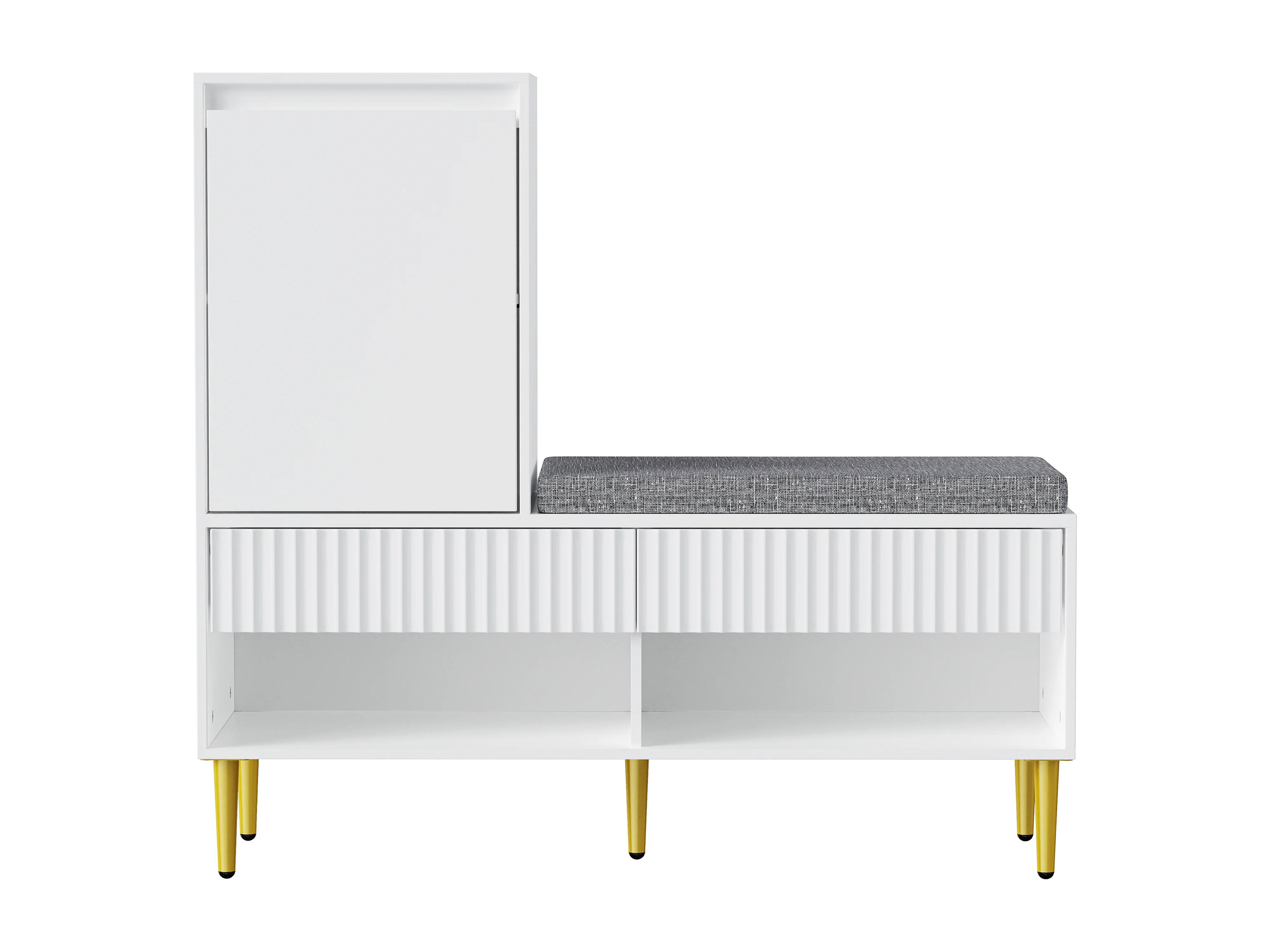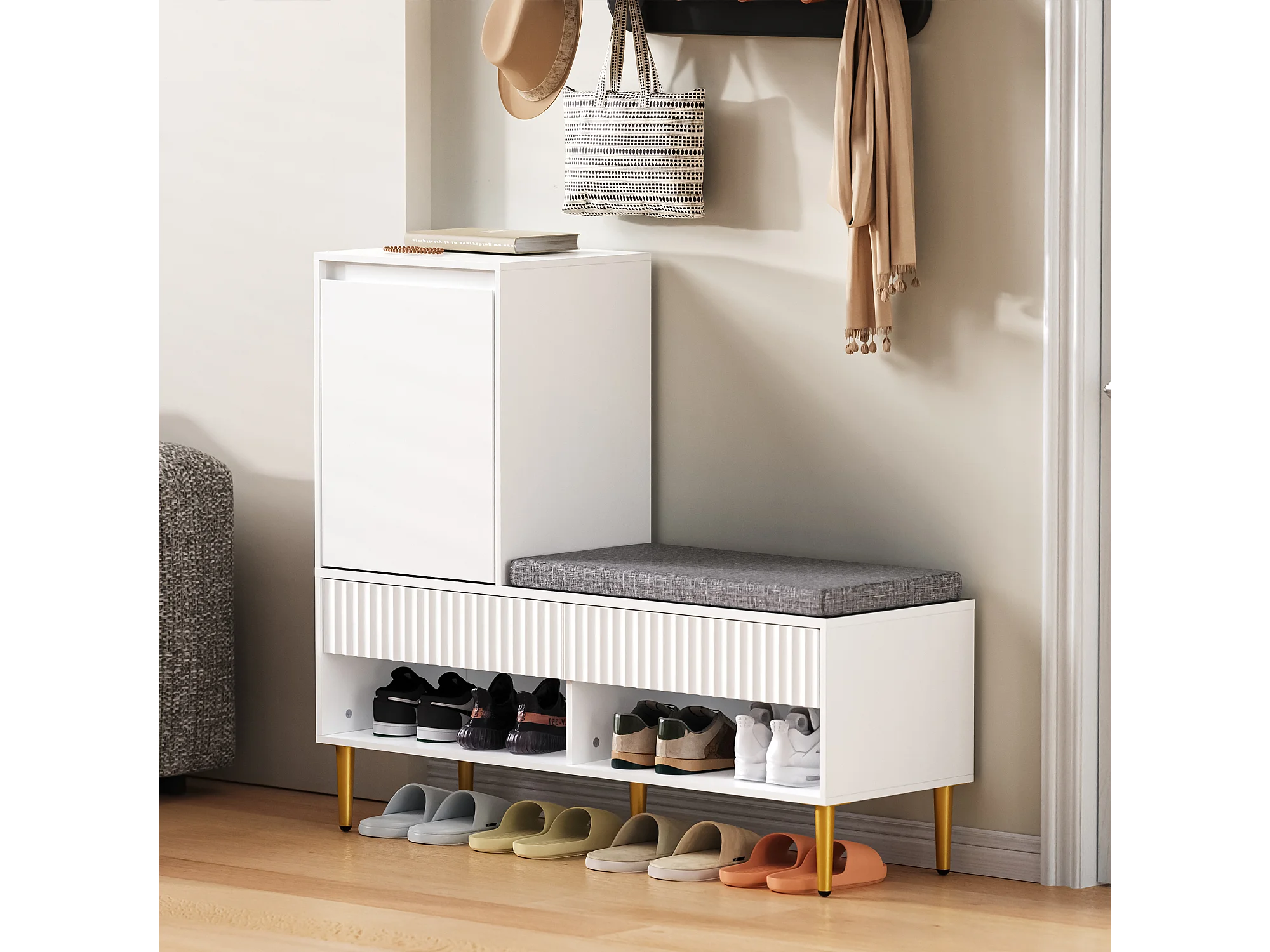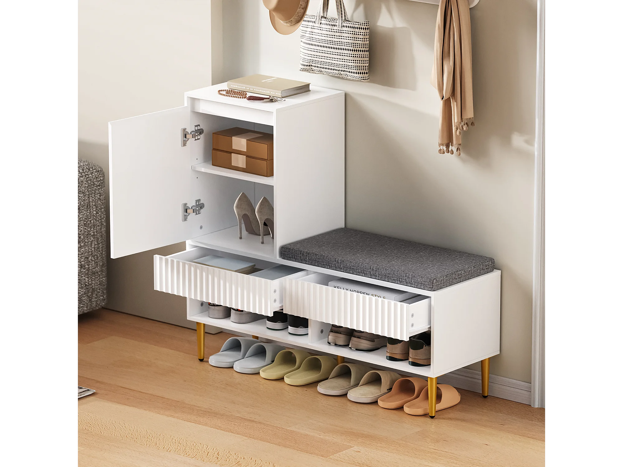 Meuble à chaussures avec banc + 1 porte + 2 tiroirs + 2 étagères ouvertes - 100 x 35 x 90 cm - aggloméré - blanc
