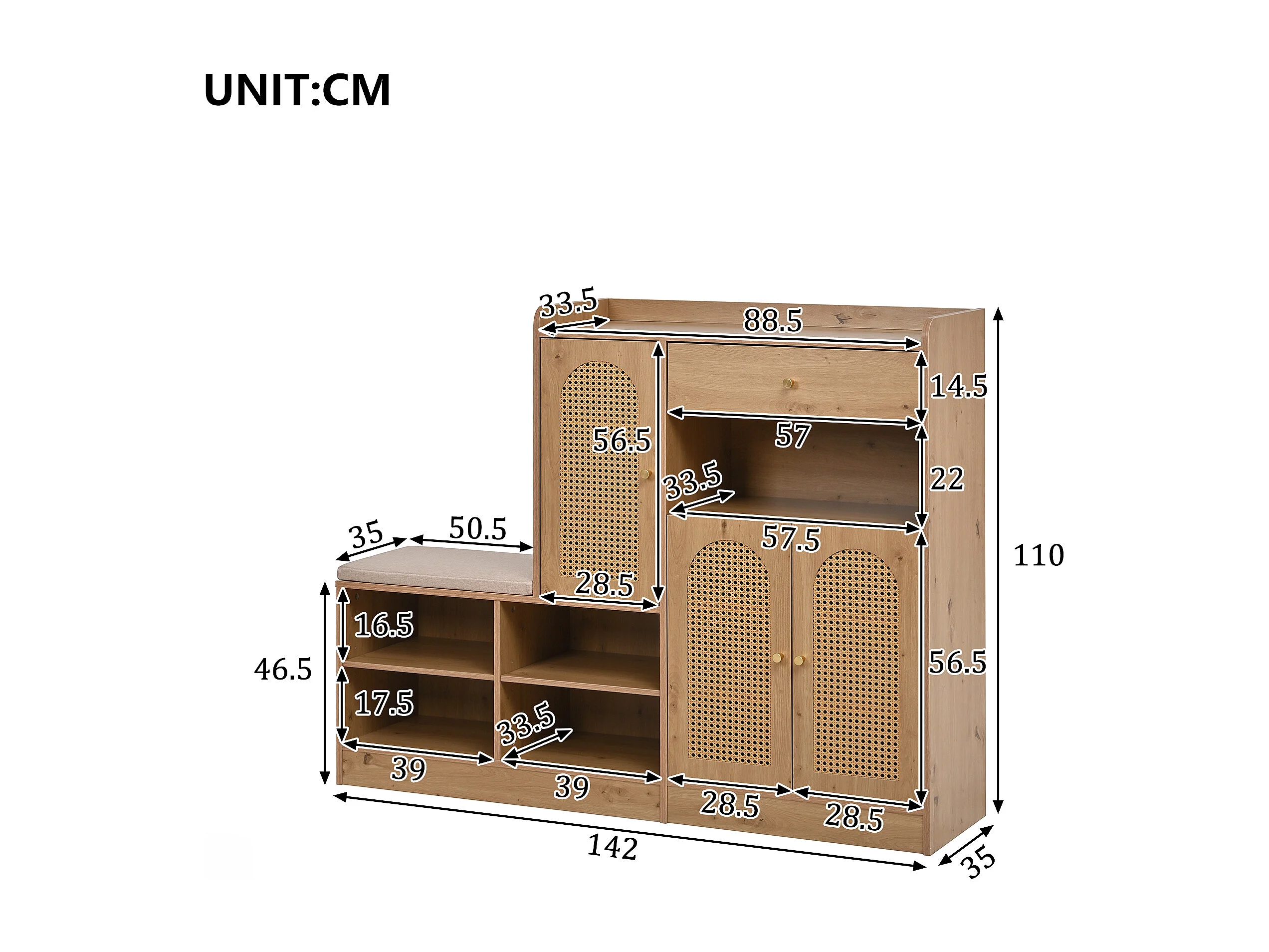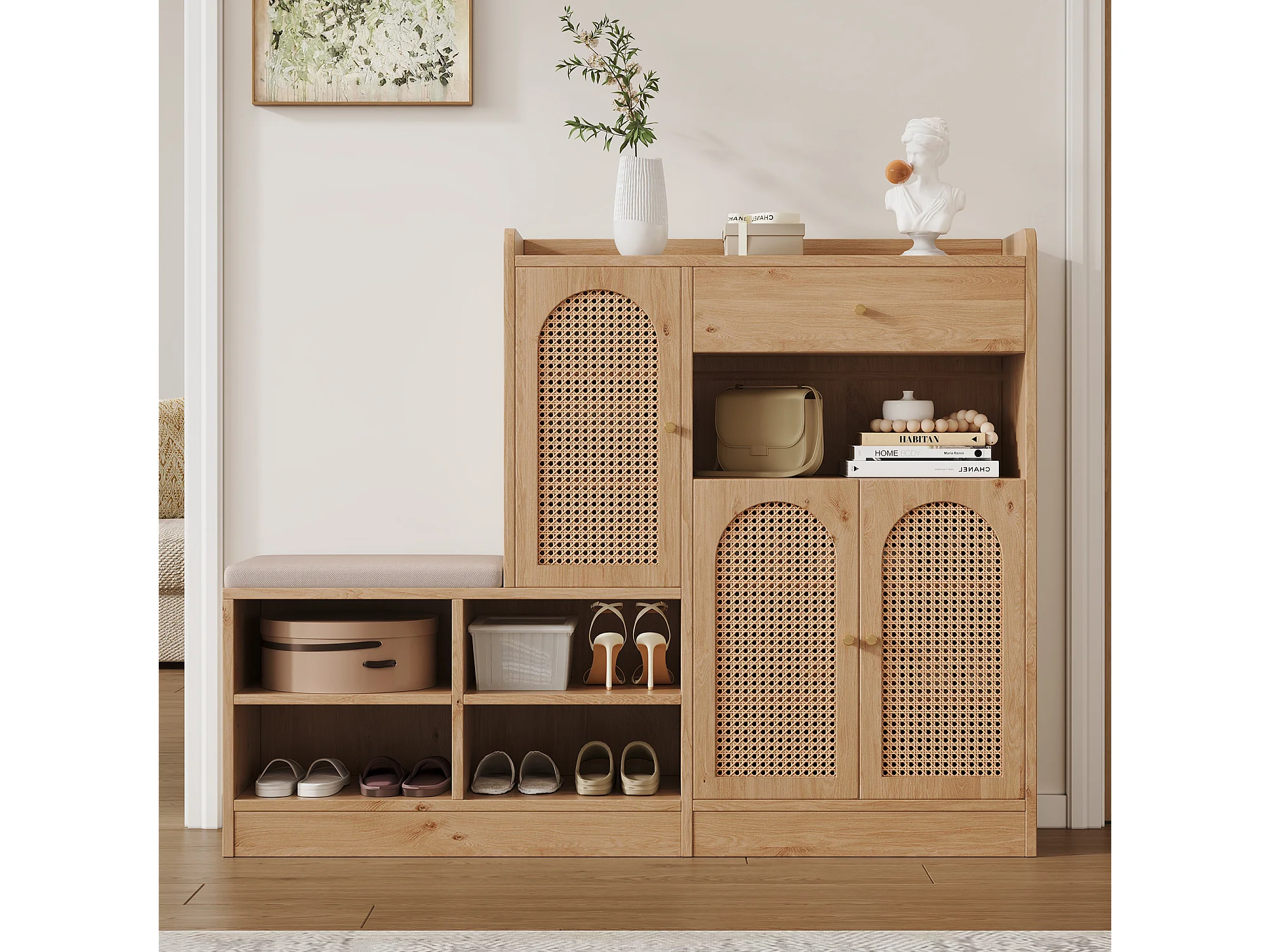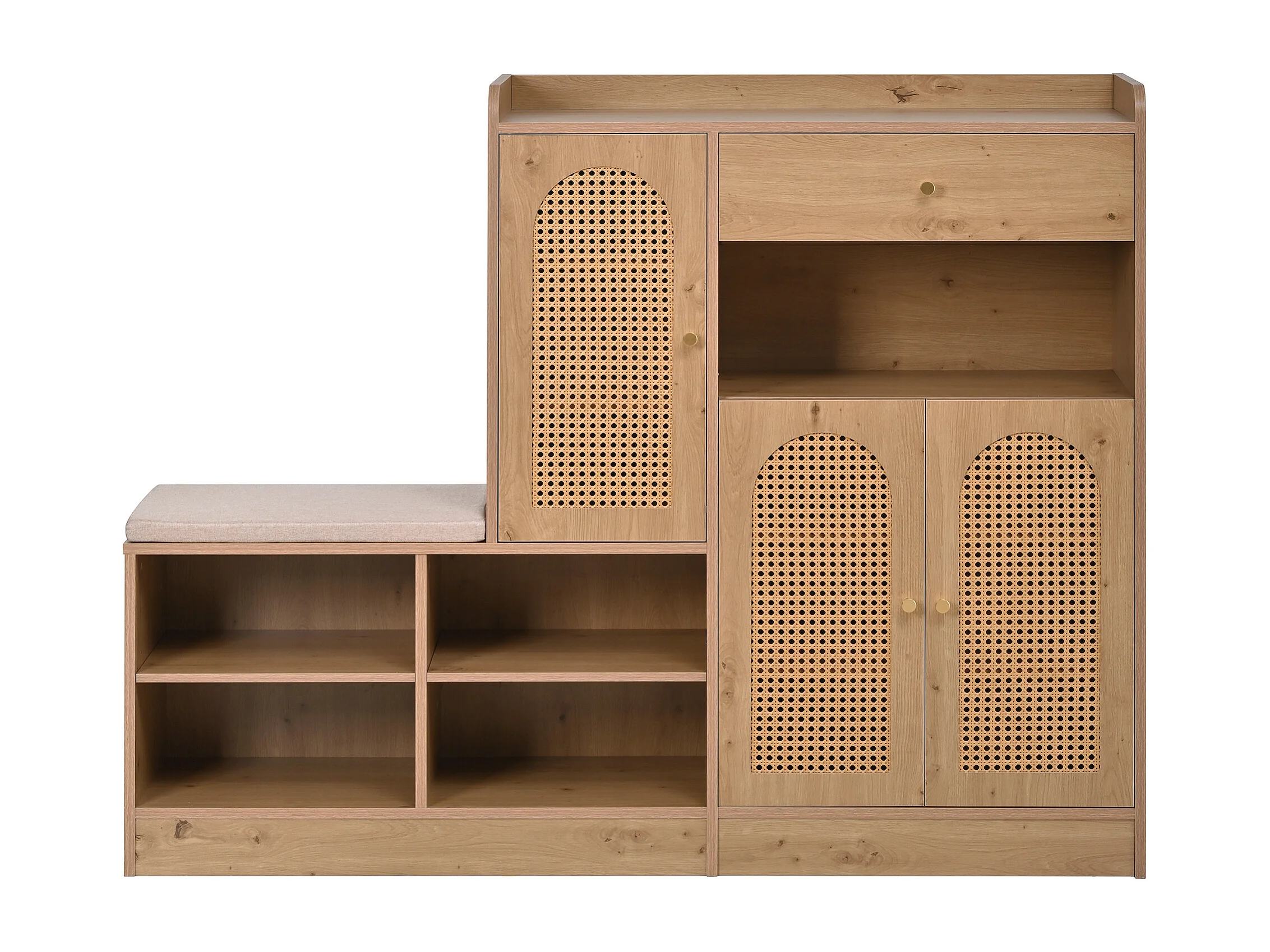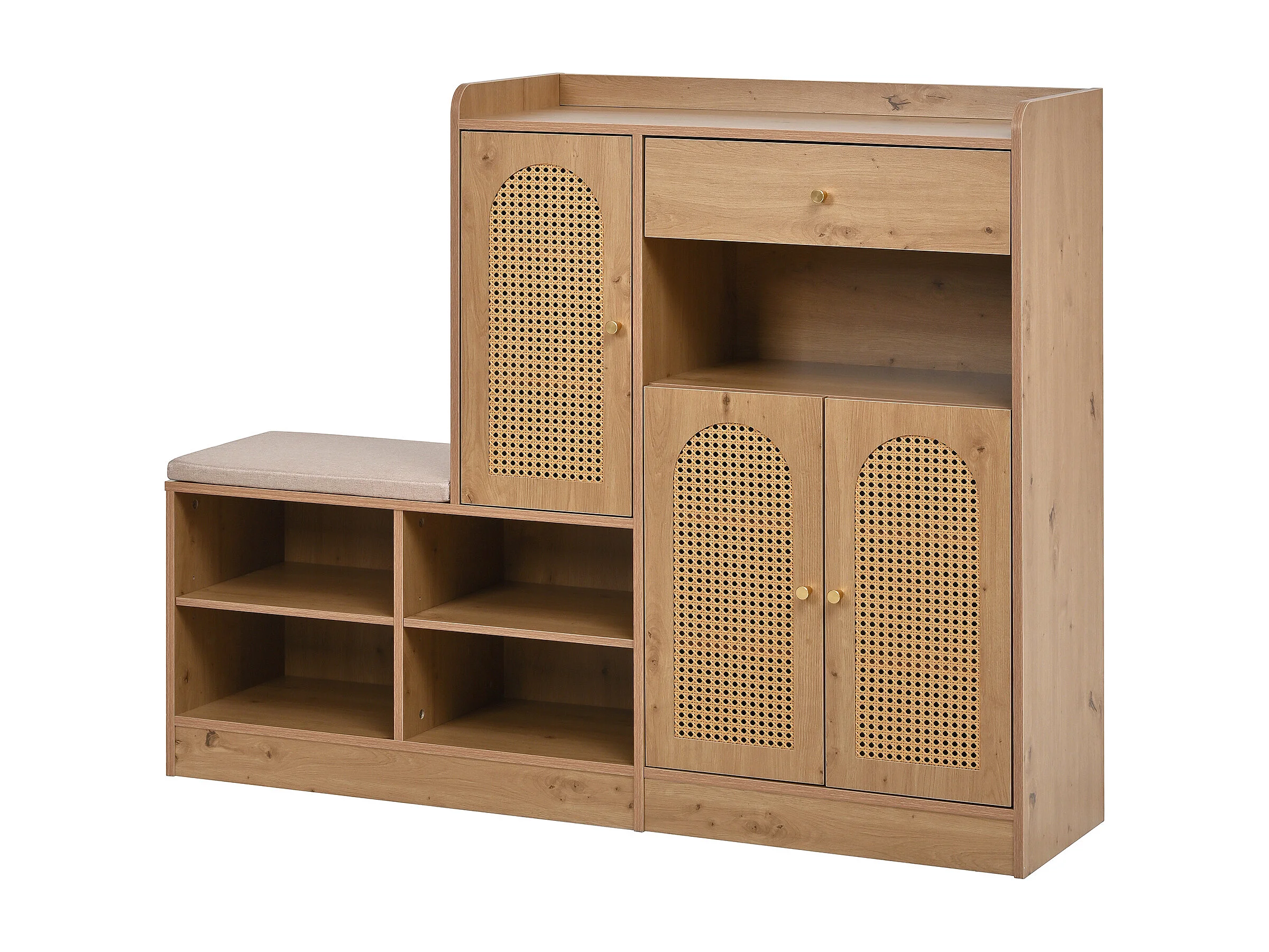 Meuble à chaussures avec banquette rembourrée - 142 x 35 x 110 cm - avec 3 portes en rotin tressé + 1 tiroir - aggloméré - naturel