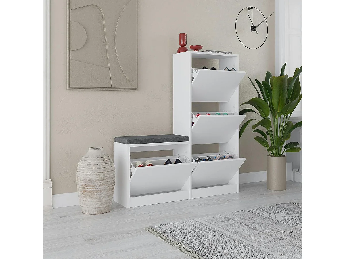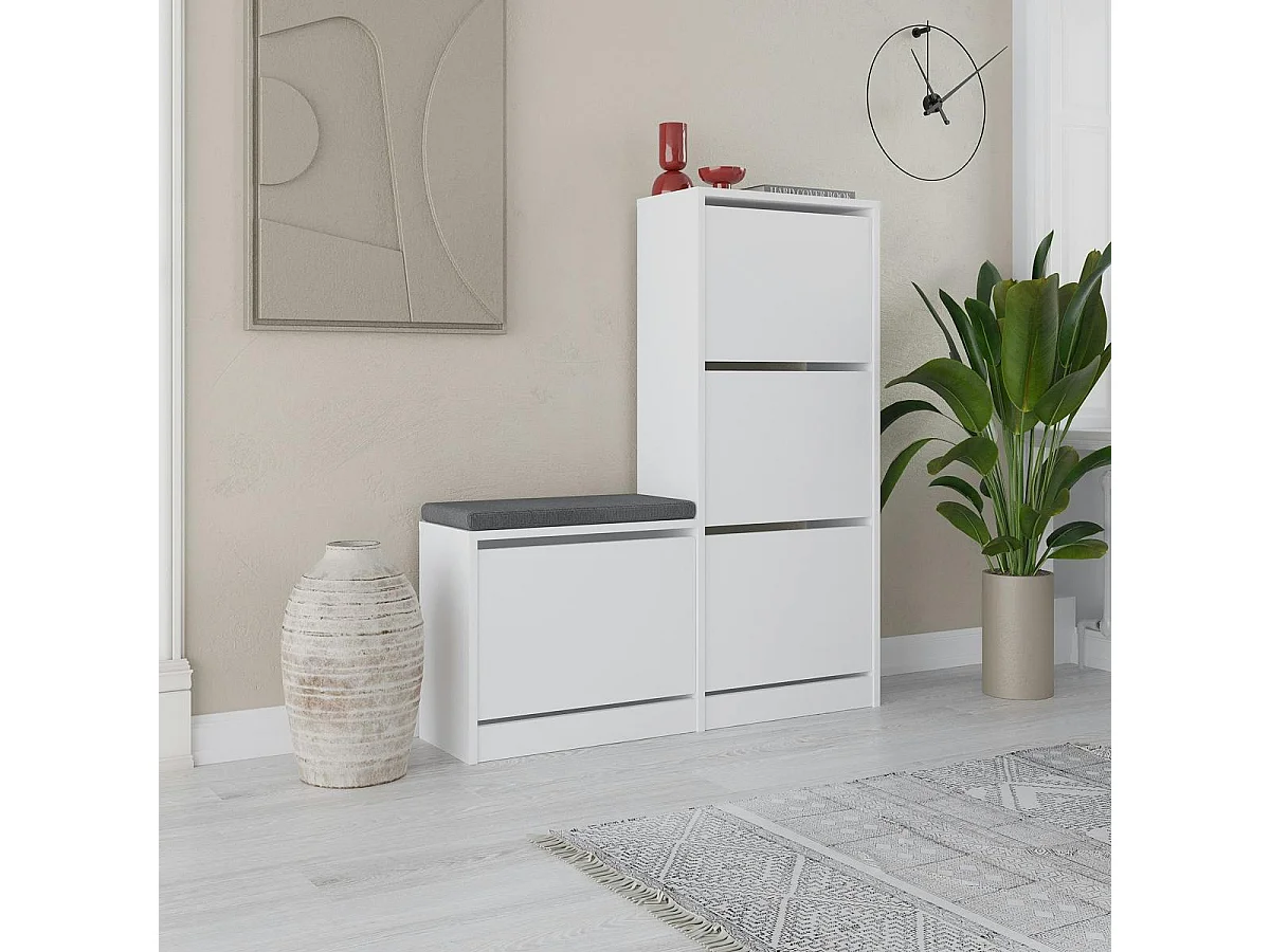 Meuble à chaussures blanc 4 portes et banc gris MARFA