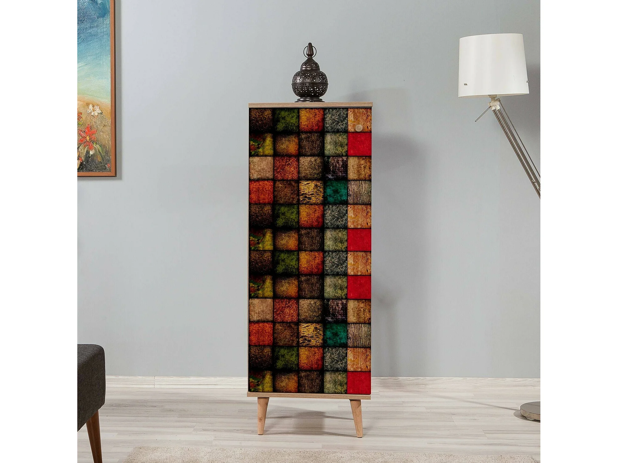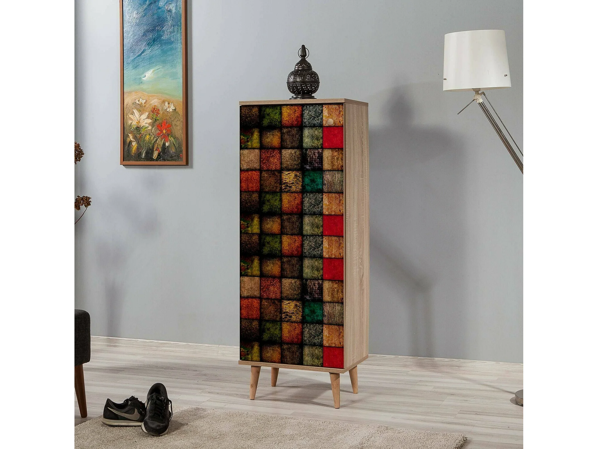 Meuble à chaussures Cebalrai, Meuble à chaussures, Armoire d'entrée polyvalente, Rangement pour chaussures, 50x38h135 cm, Chêne et Multicolore