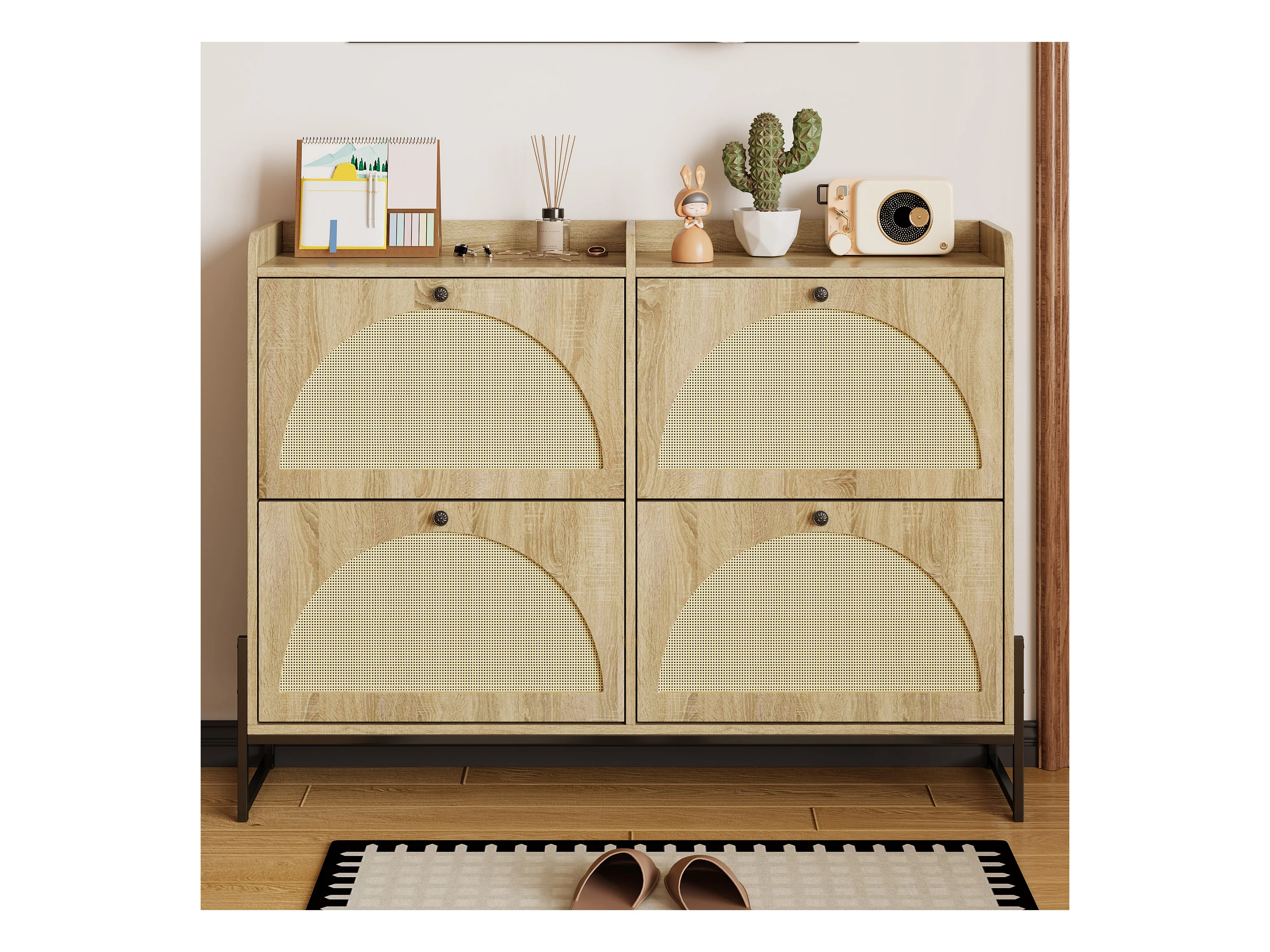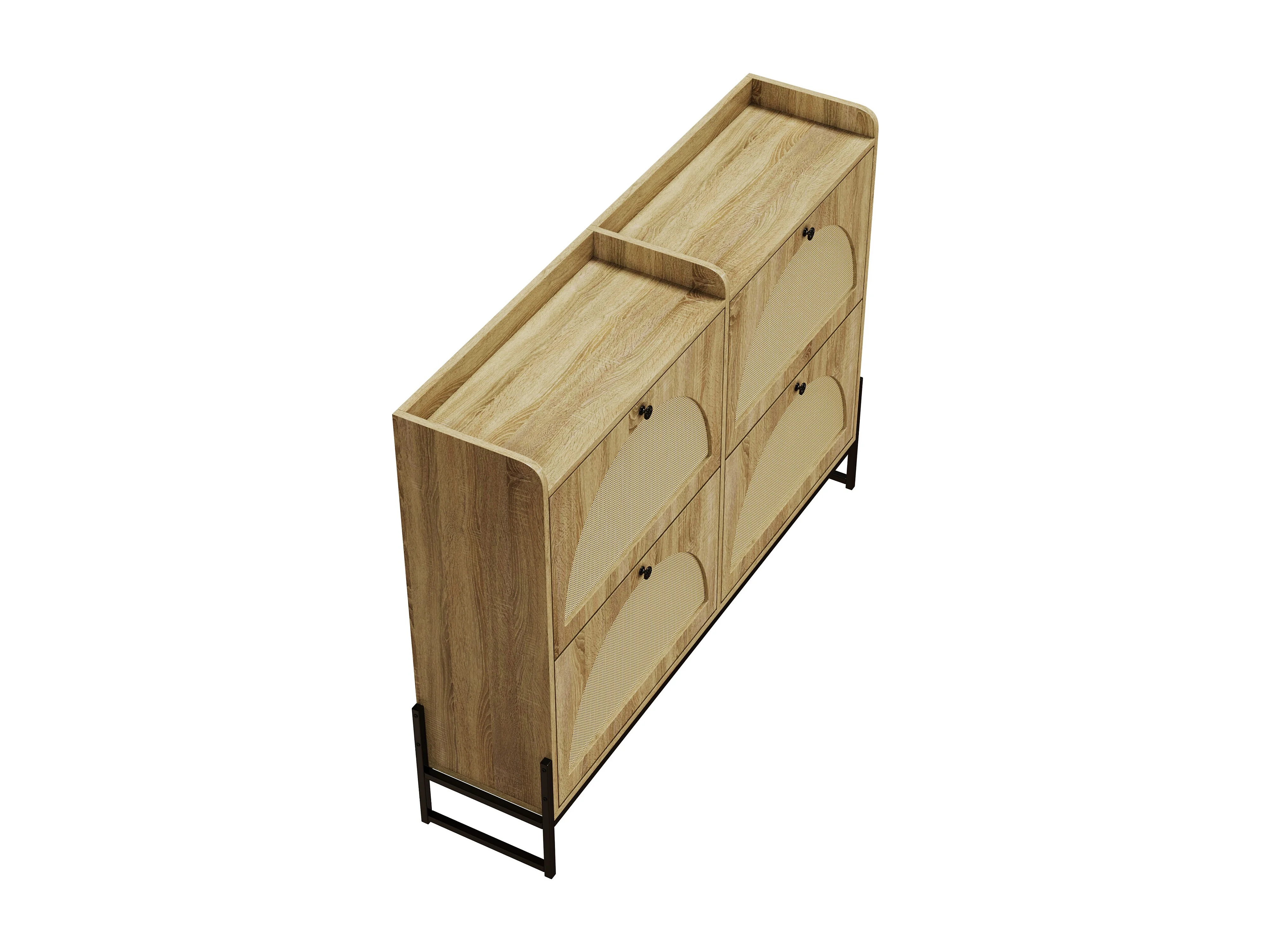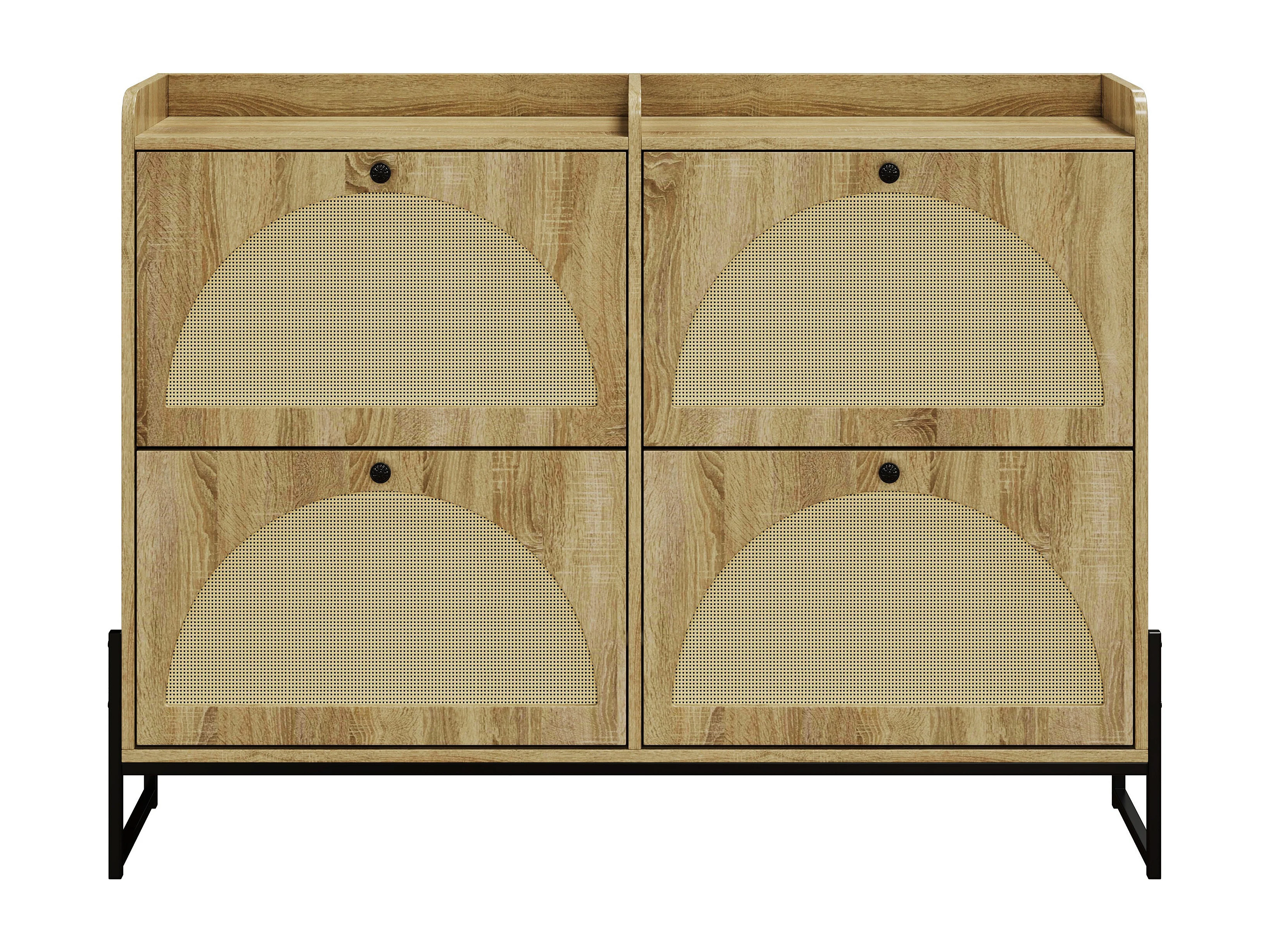 Meuble à chaussures couleur naturelle avec 4 portes en rotin, poignées noires et pieds en métal