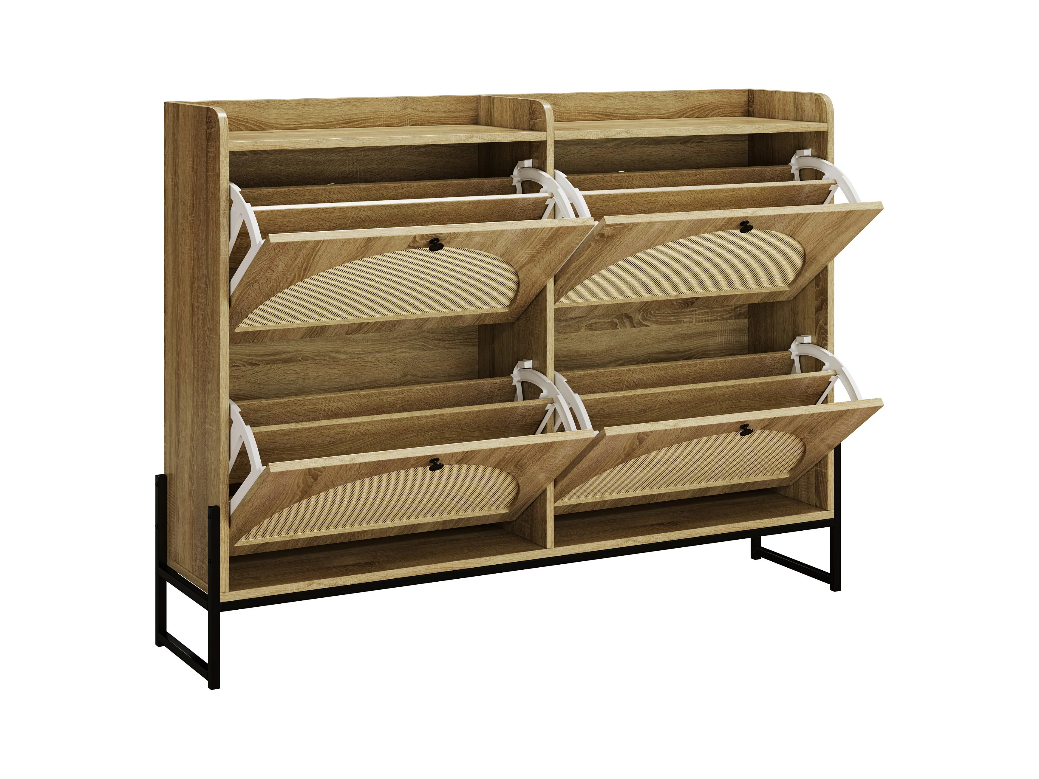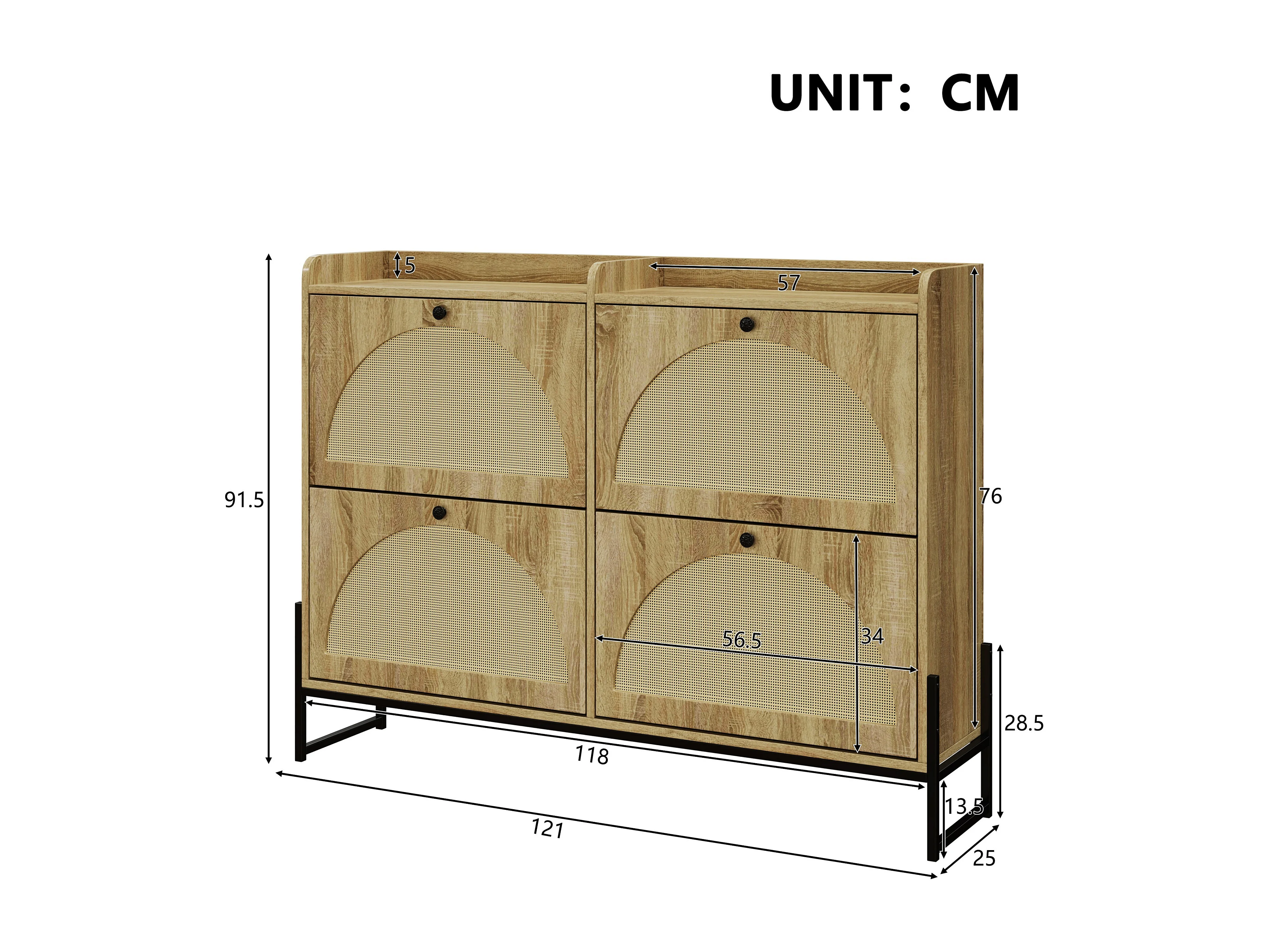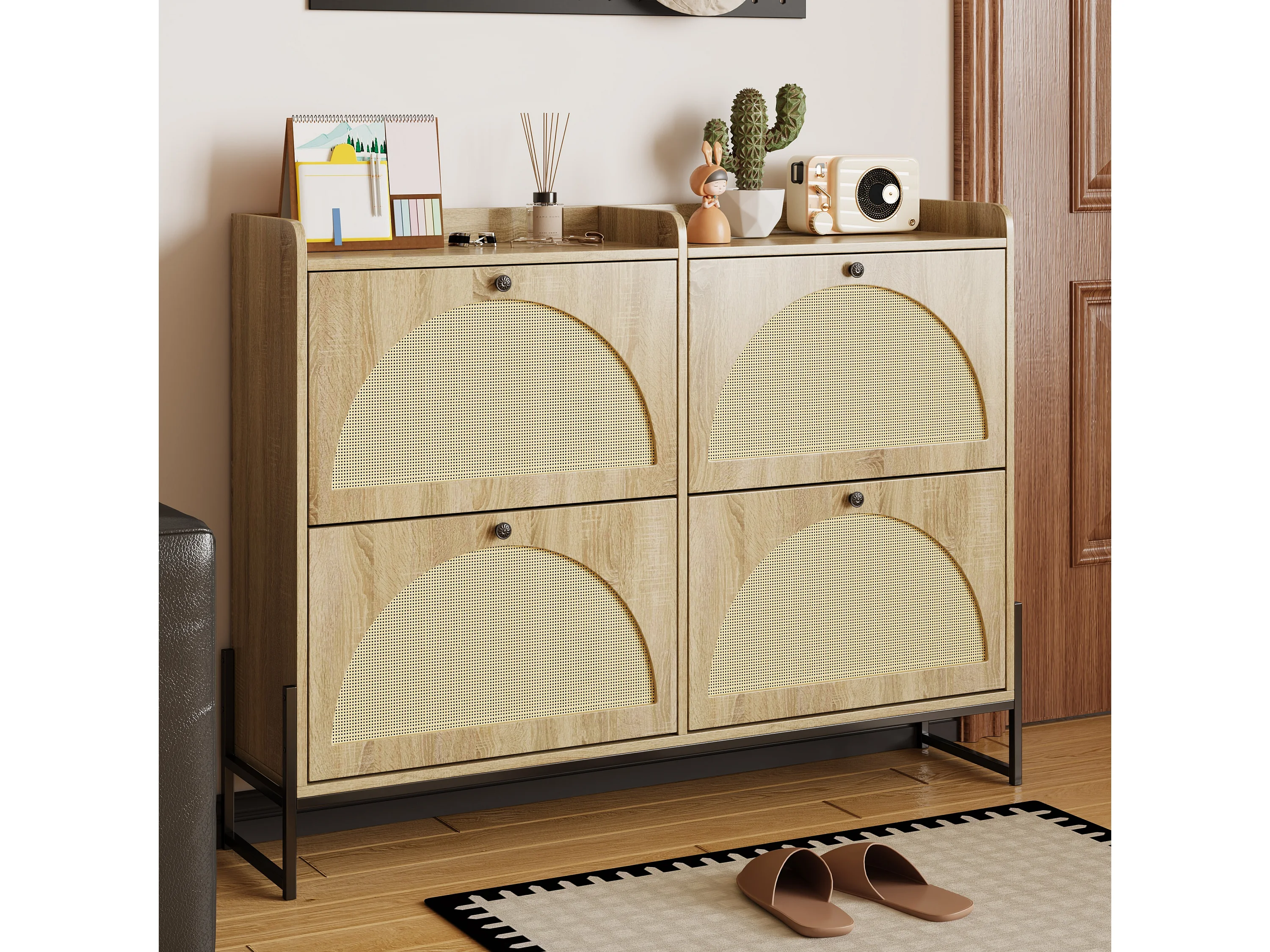 Meuble à chaussures couleur naturelle avec 4 portes en rotin, poignées noires et pieds en métal
