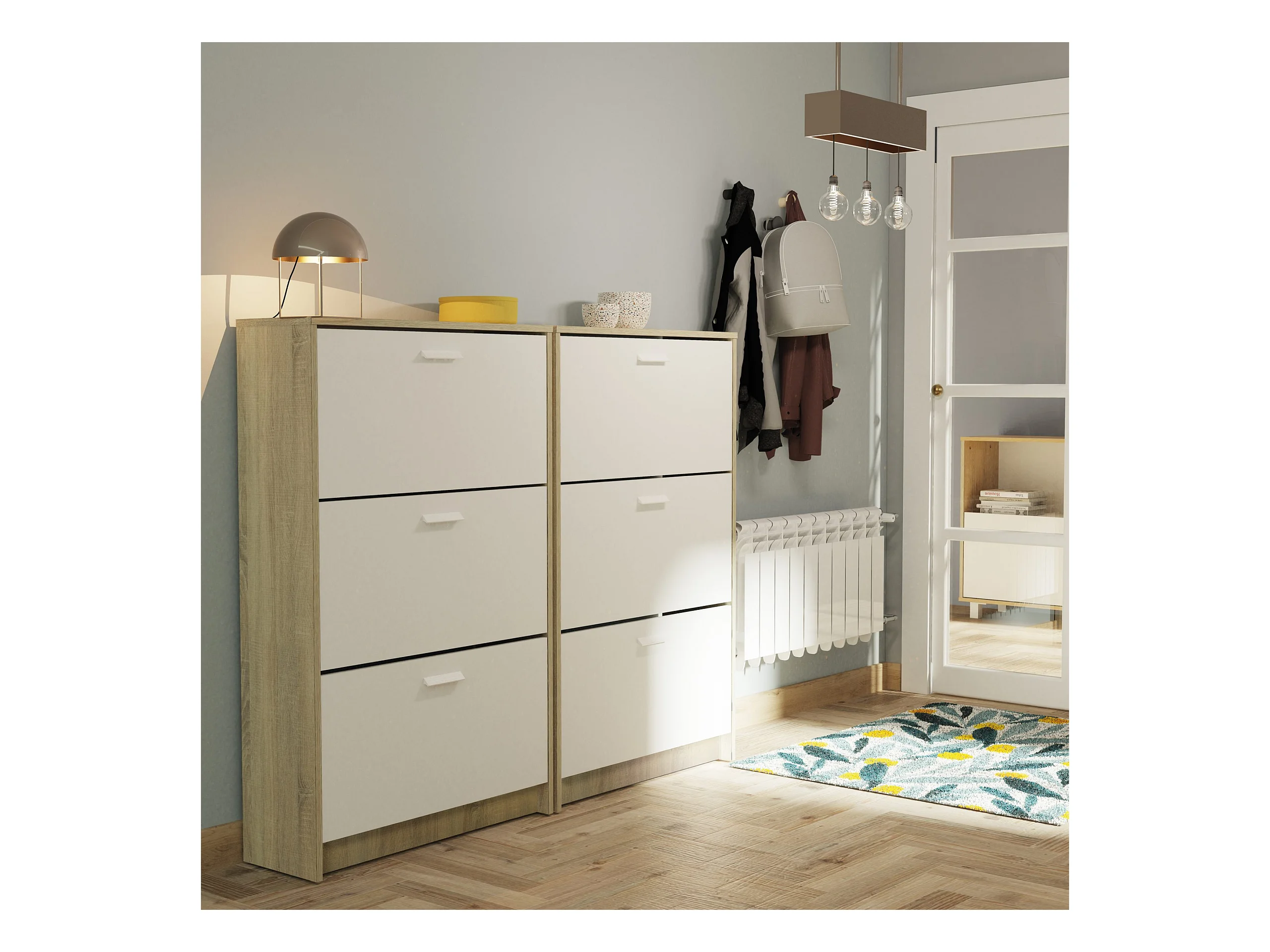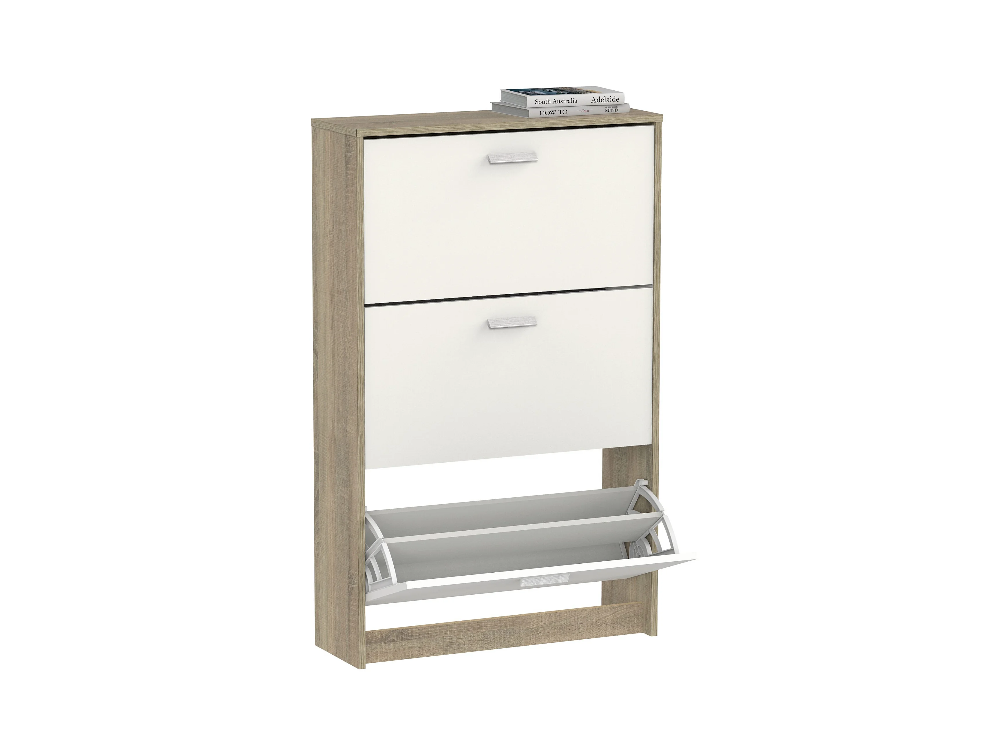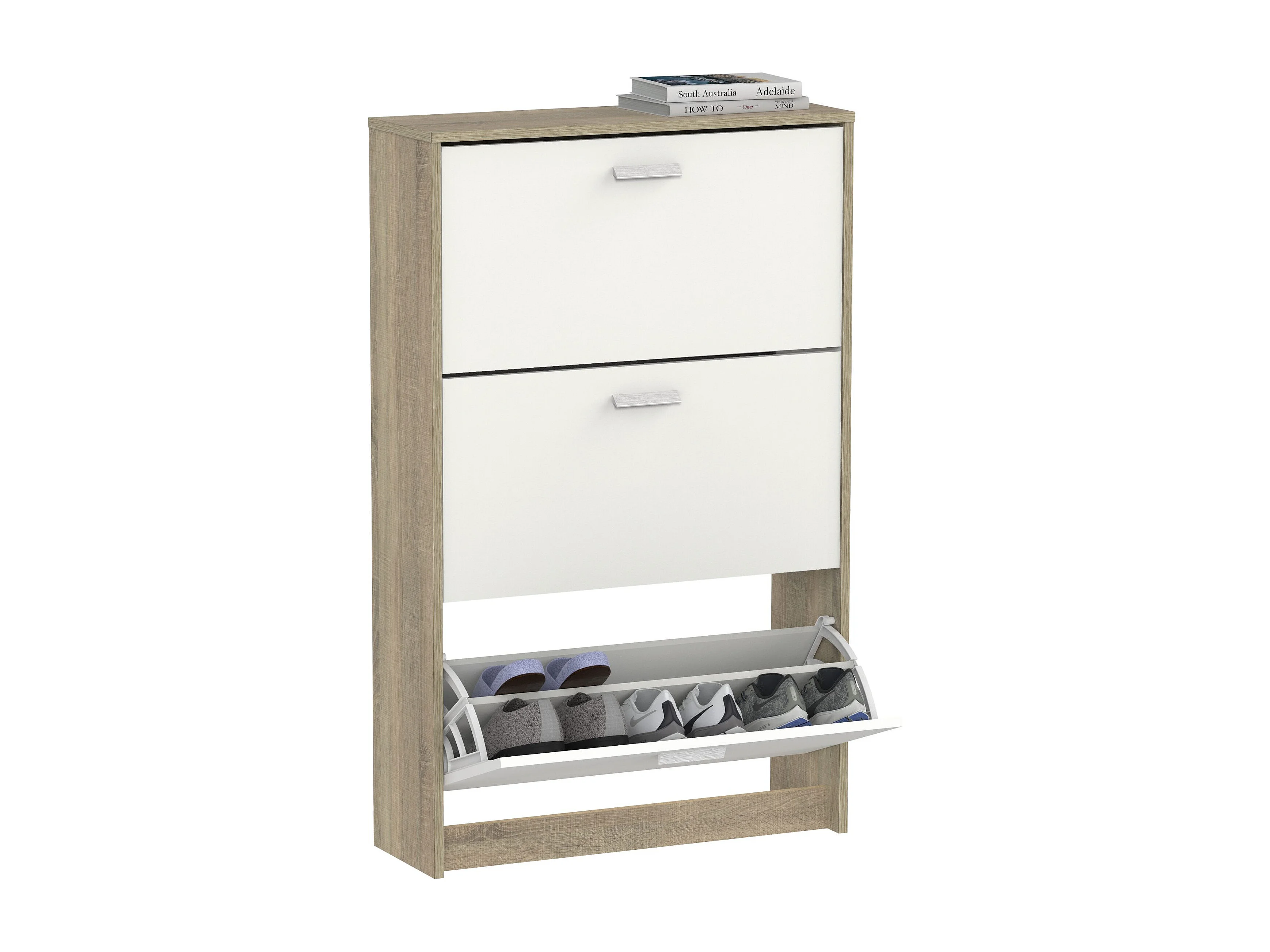 Meuble à chaussures de 3 portes, 18 paires coloris Blanc/Chêne cambrien - Longueur 74 x Profondeur 25 x Hauteur 119,5 cm