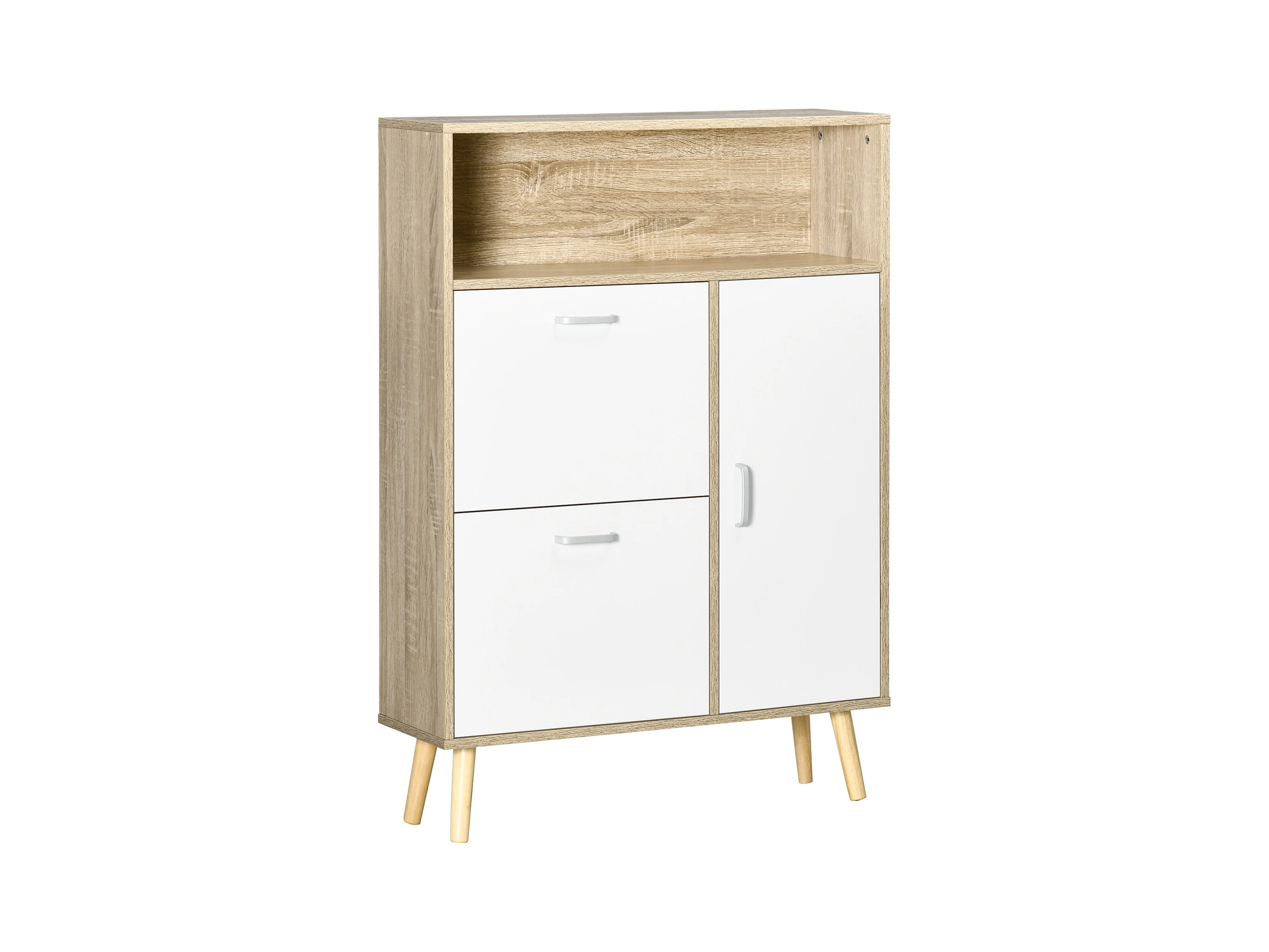 Meuble à chaussures design scandinave placard 3 portes 3 étagères niche piètement effilé incliné bois panneaux aspect chêne clair