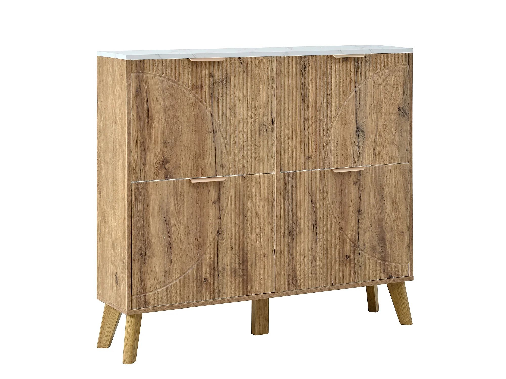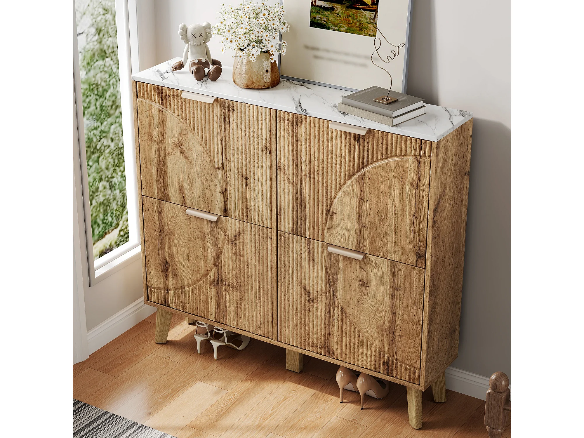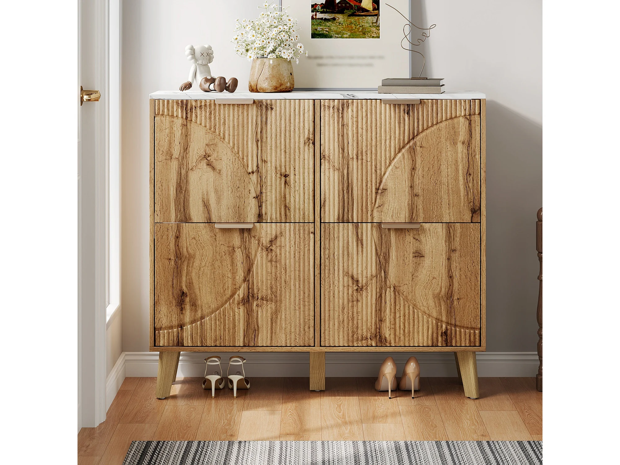 Meuble à chaussures effet blanc marbre et bois naturel 4 portes battantes details dorés