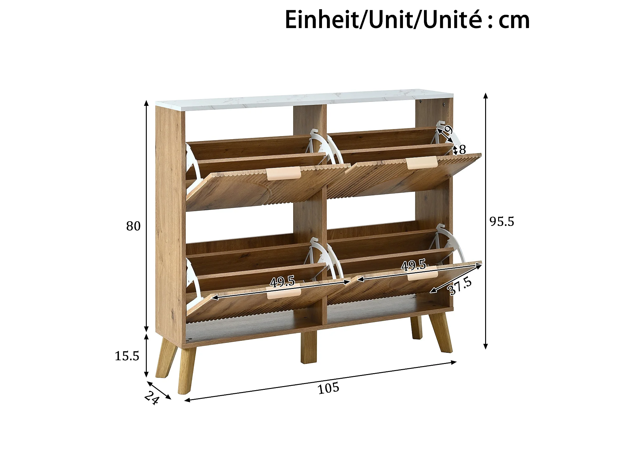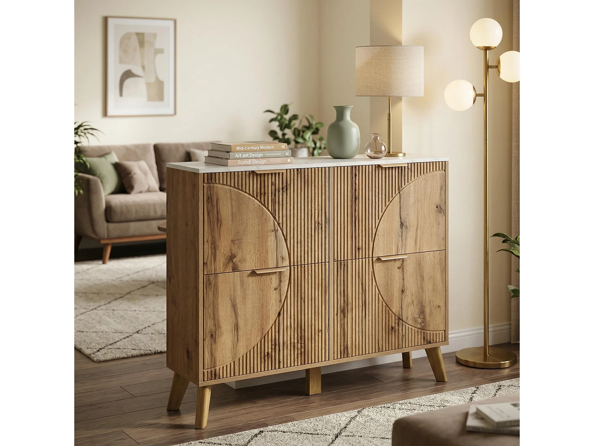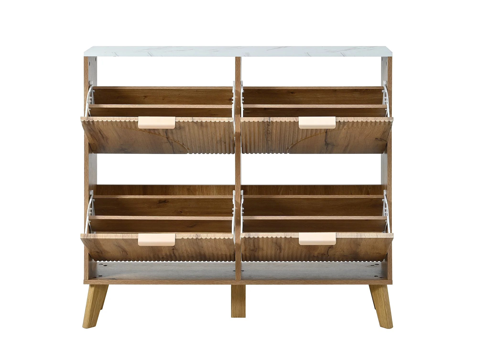Meuble à chaussures effet blanc marbre et bois naturel 4 portes battantes details dorés