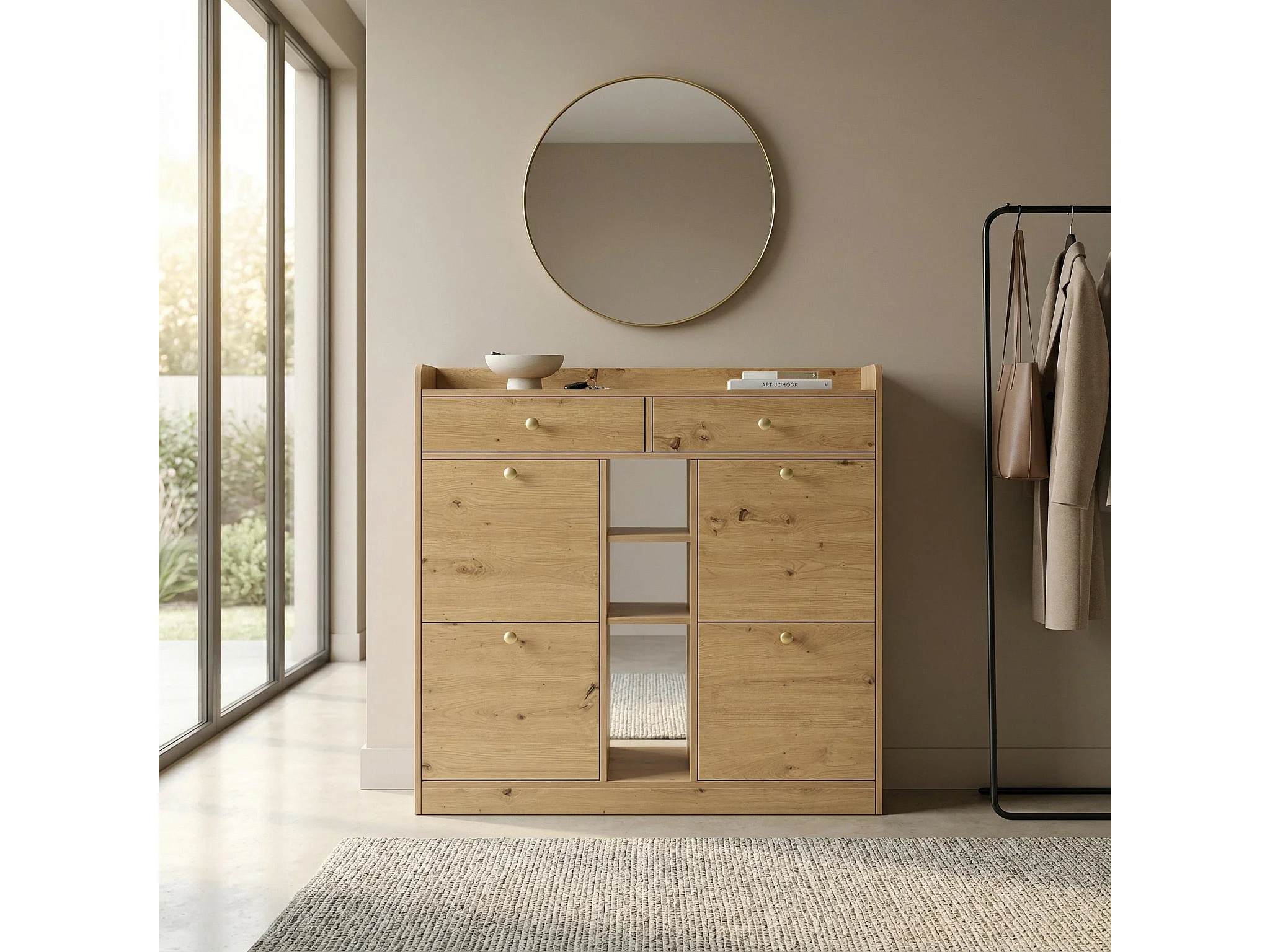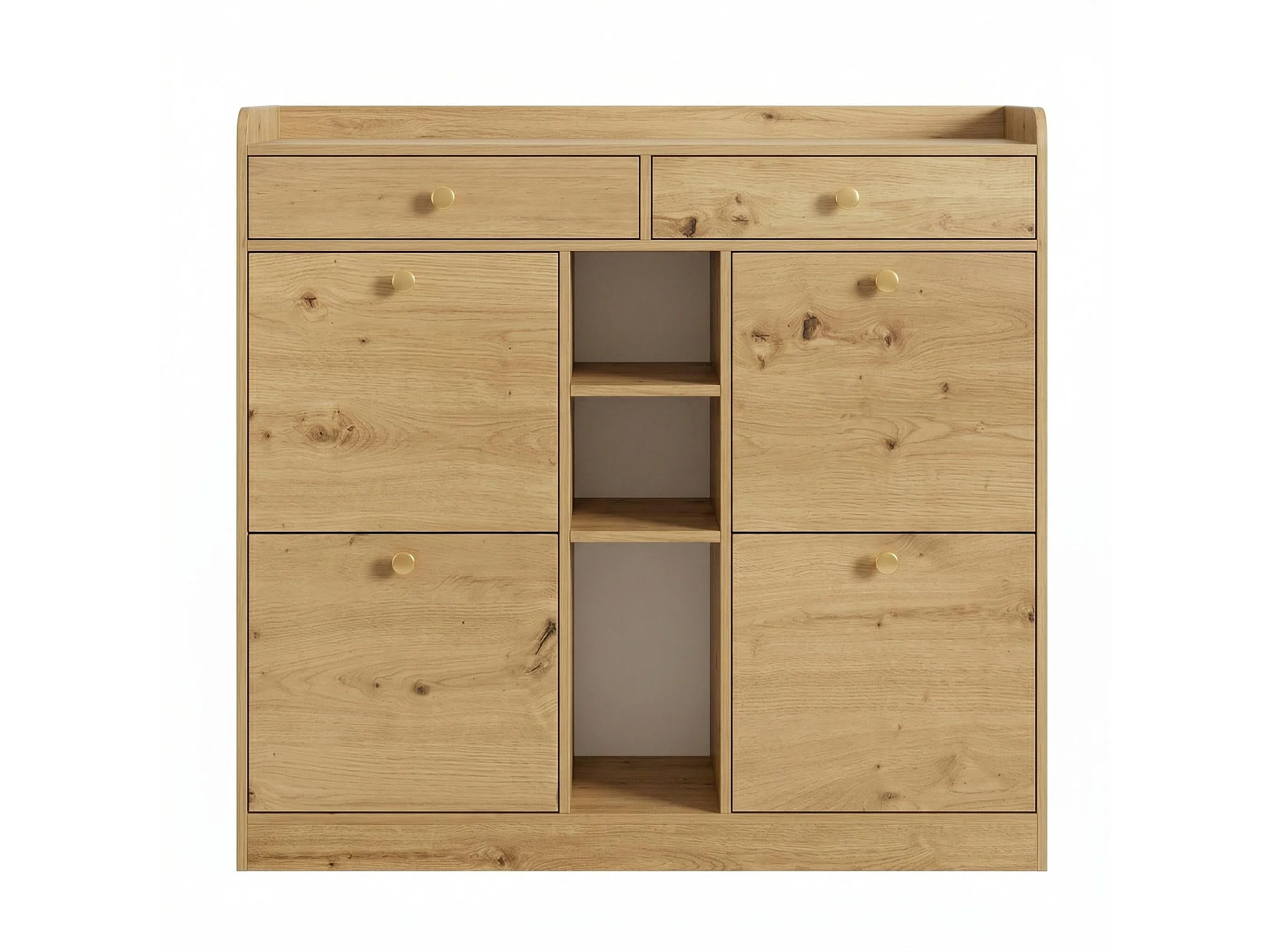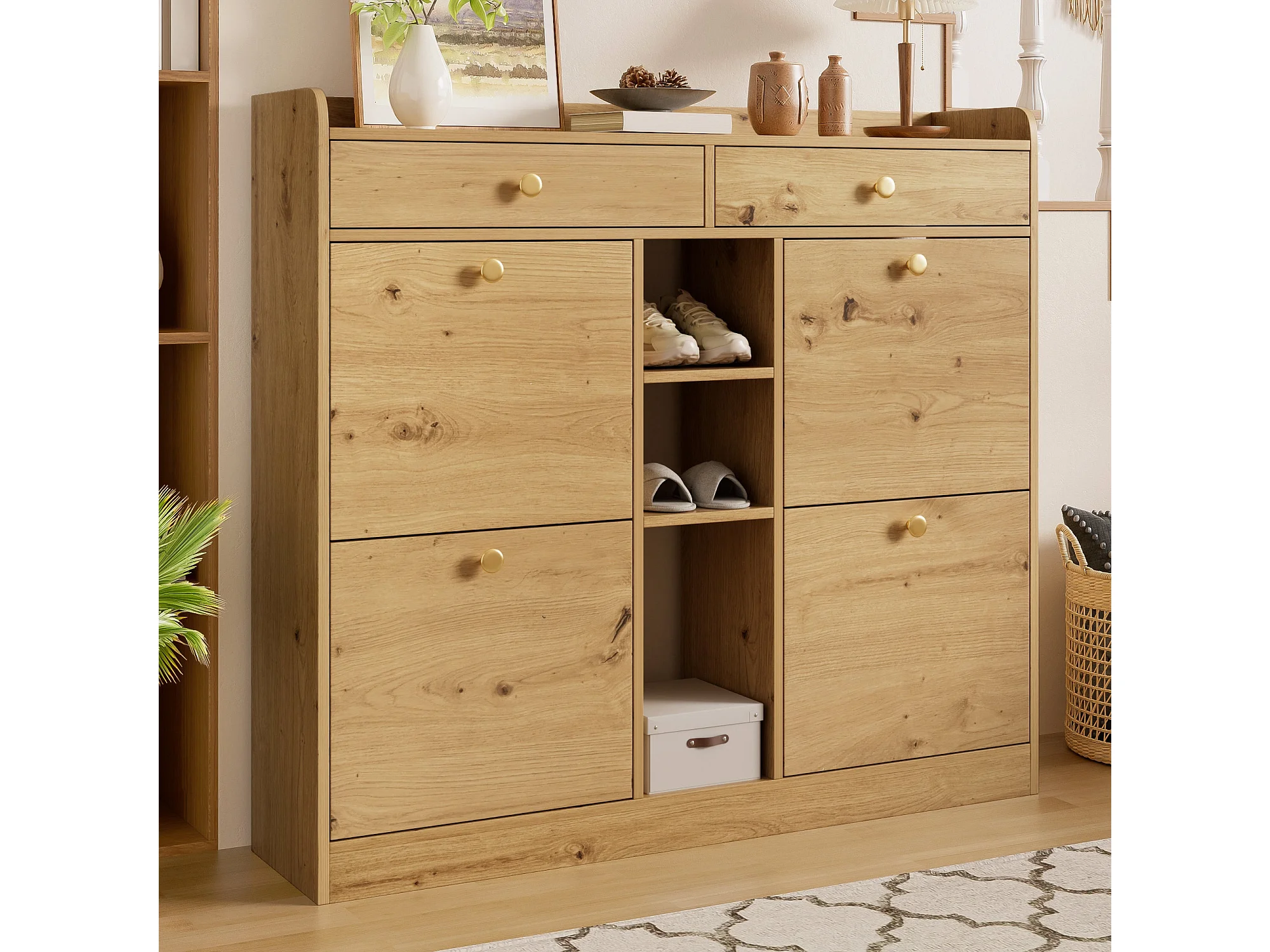Meuble à chaussures effet bois 4 abattants, 2 tiroirs, 3 niches 110x26x100cm