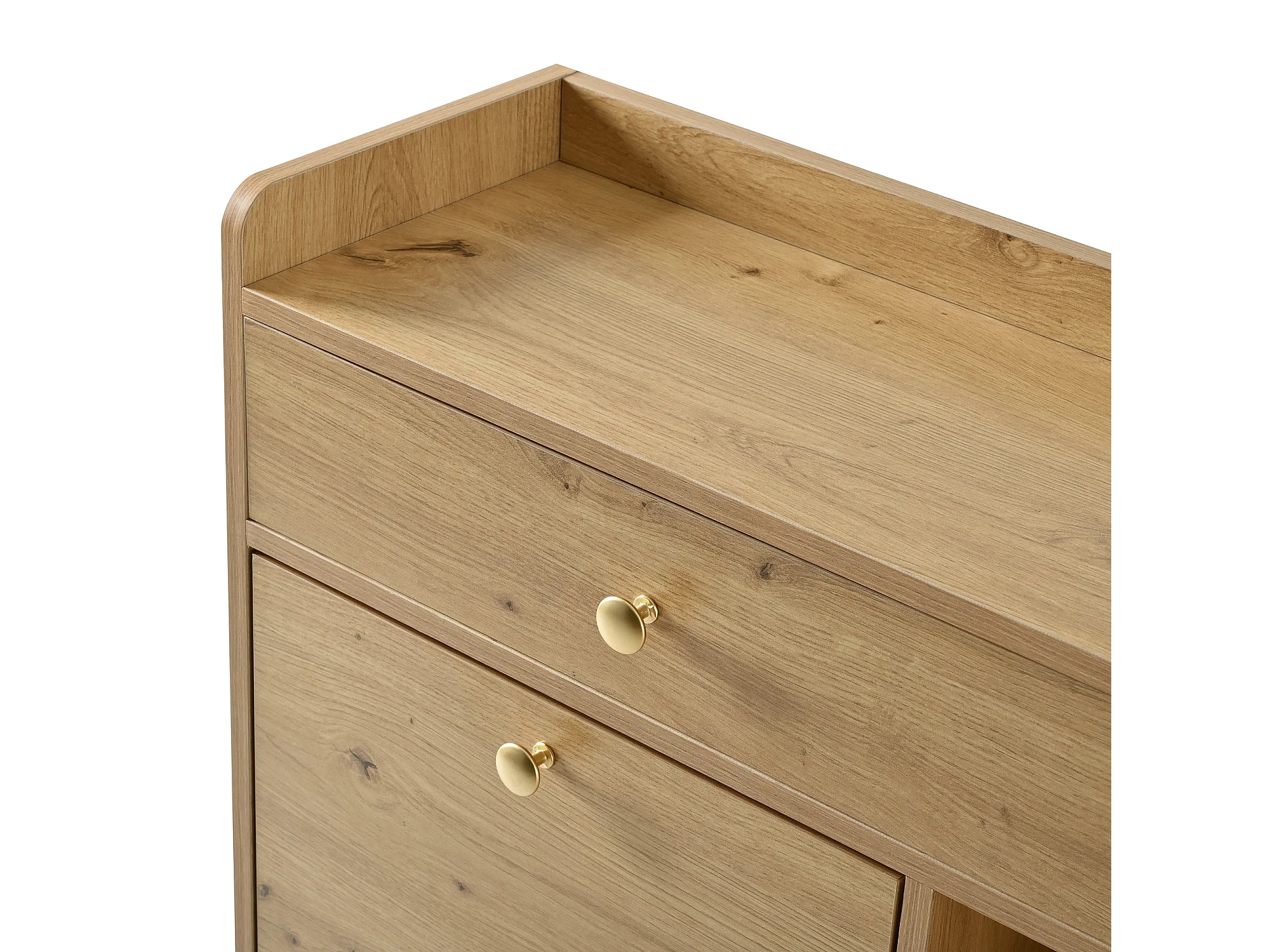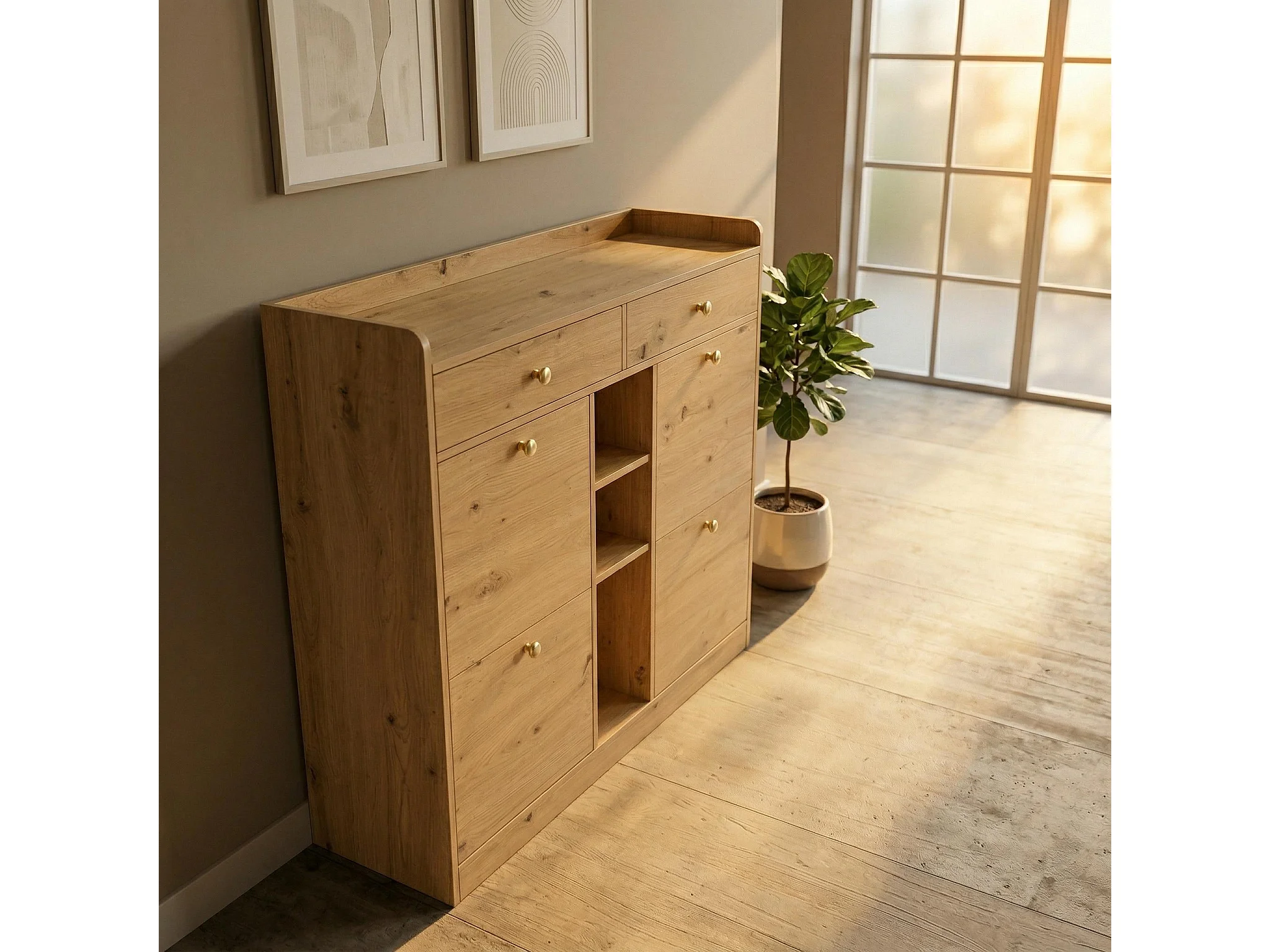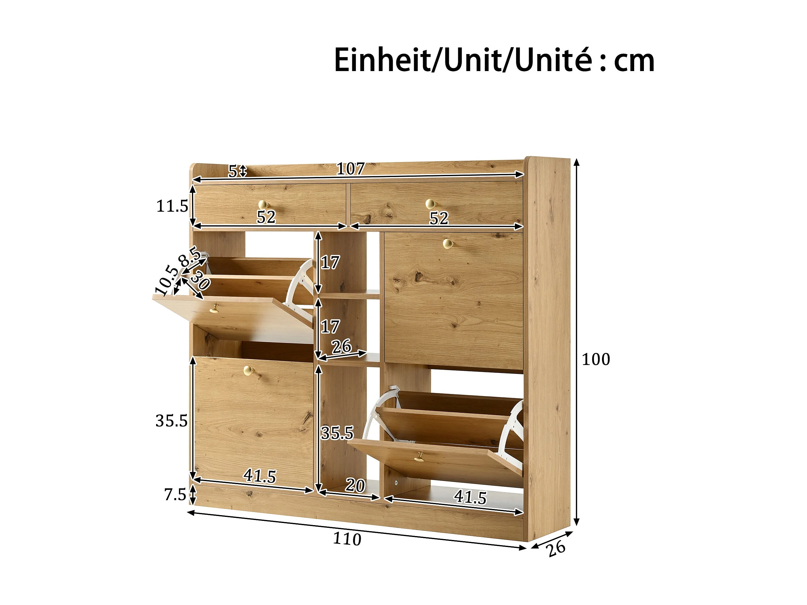 Meuble à chaussures effet bois 4 abattants, 2 tiroirs, 3 niches 110x26x100cm