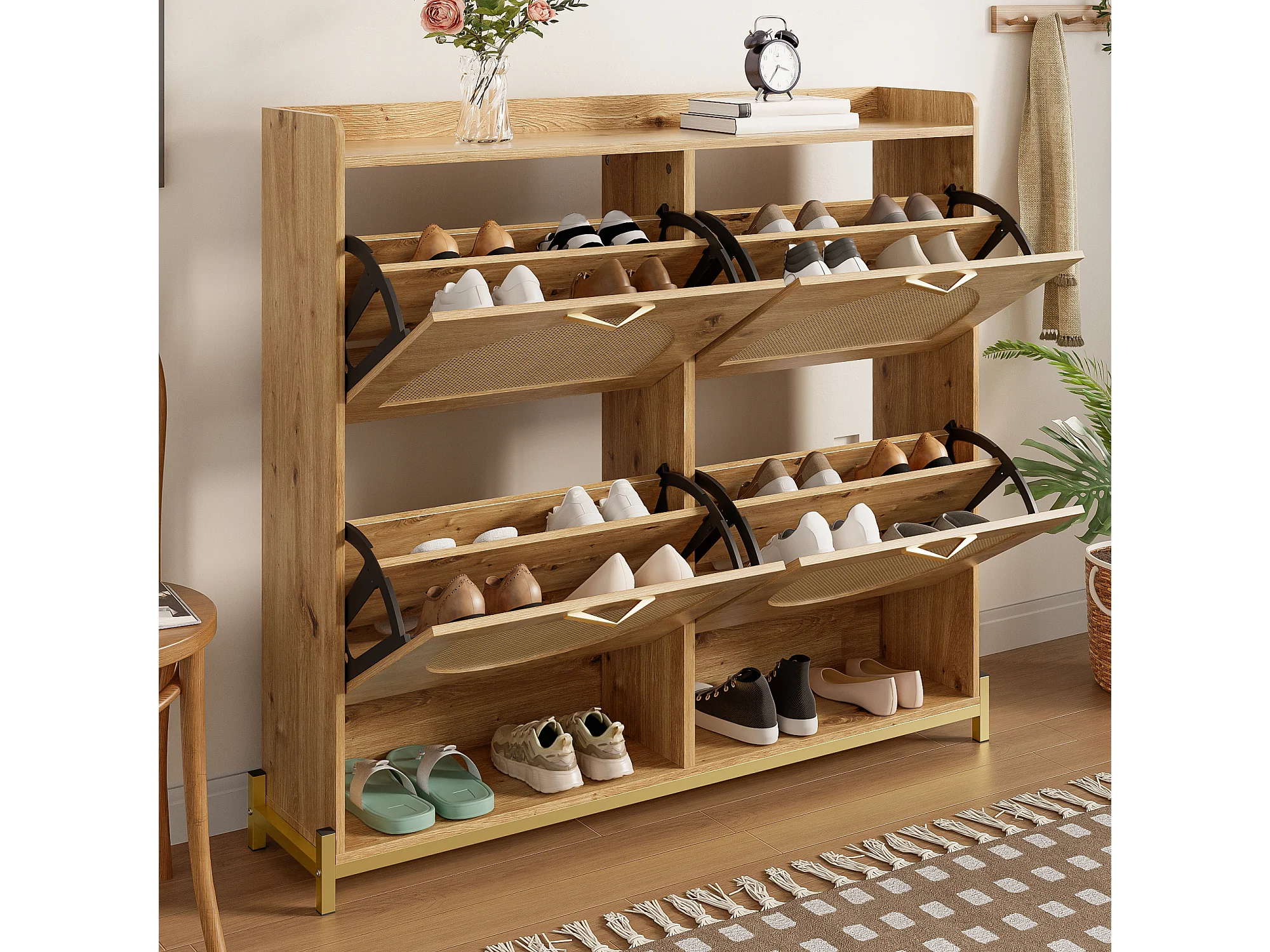 Meuble à chaussures en bois avec 4 portes en rotin - 108.5 x 24 x 100 cm - étagère pour un rangement - MDF - naturel