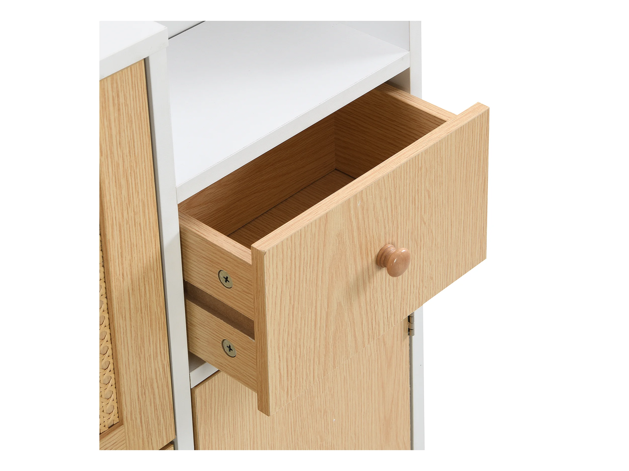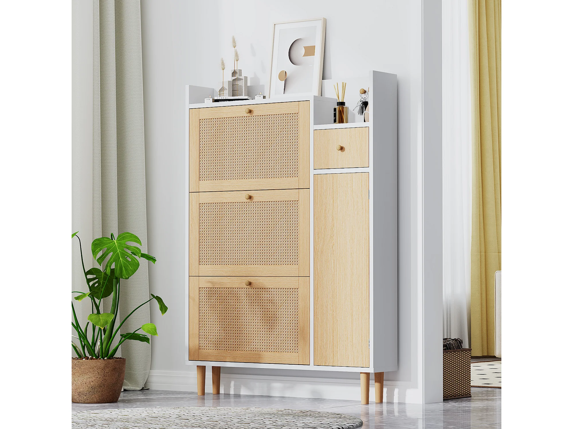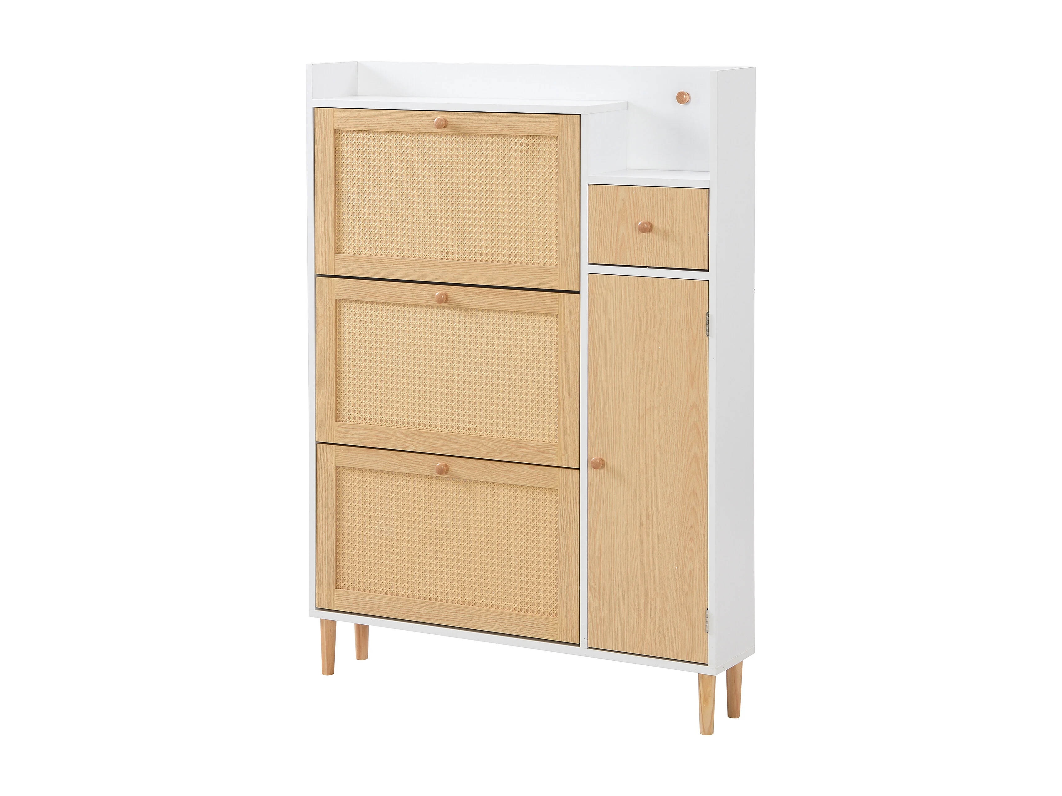 Meuble à chaussures en rotin avec 4 portes et 1 tiroir, pieds et poignées en bois