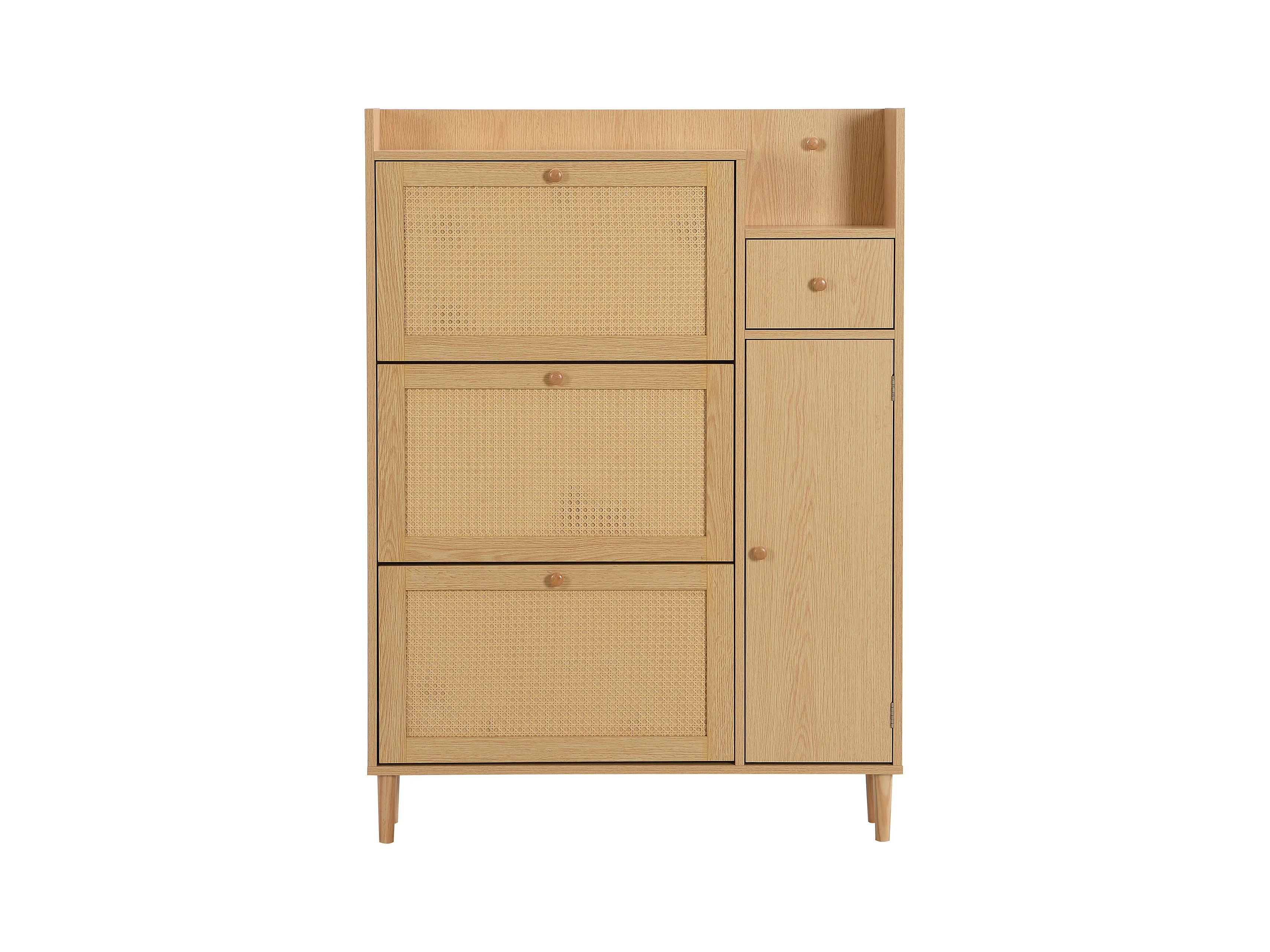 Meuble à chaussures en rotin avec 4 portes et 1 tiroir, pieds et poignées en bois