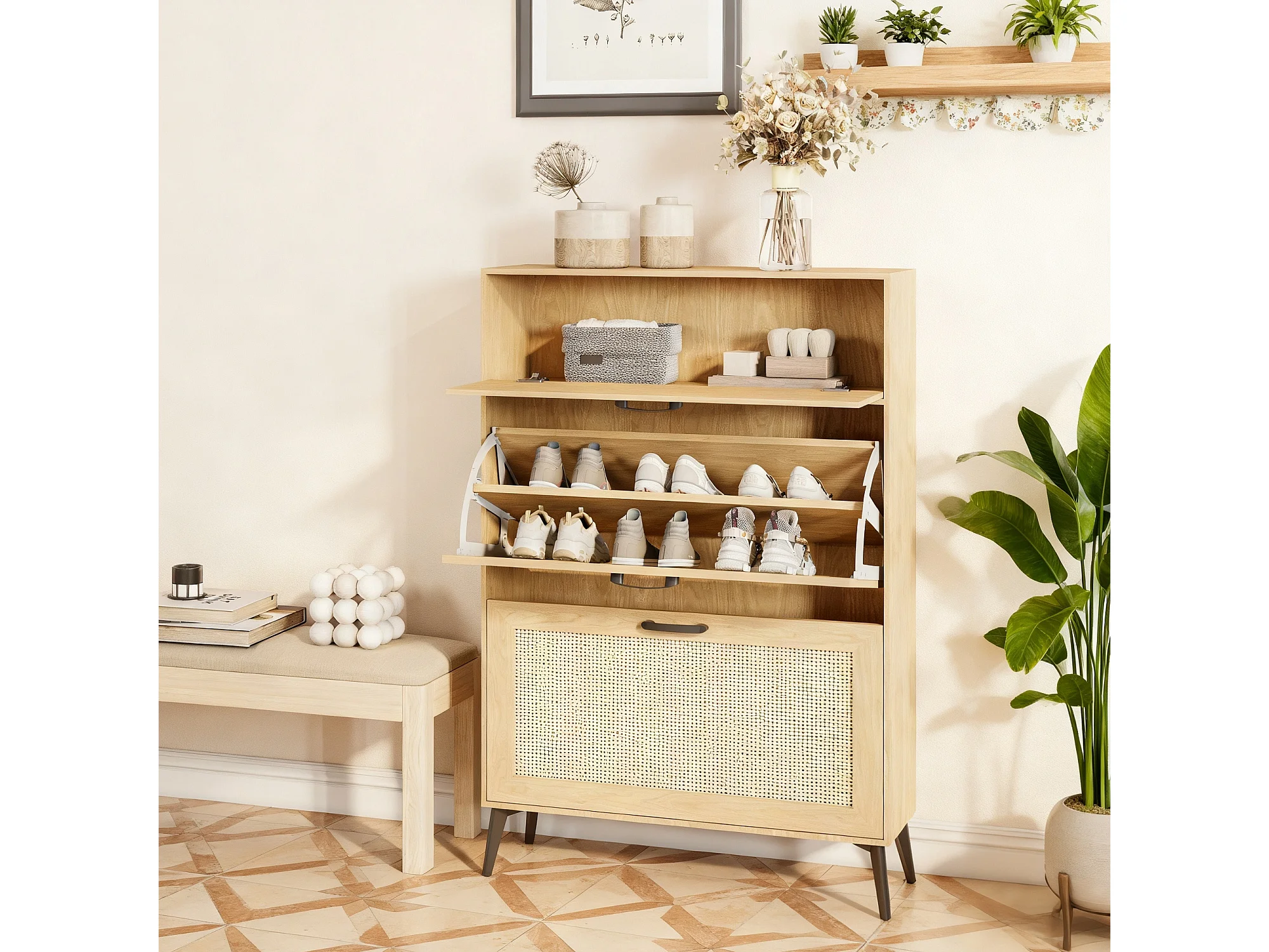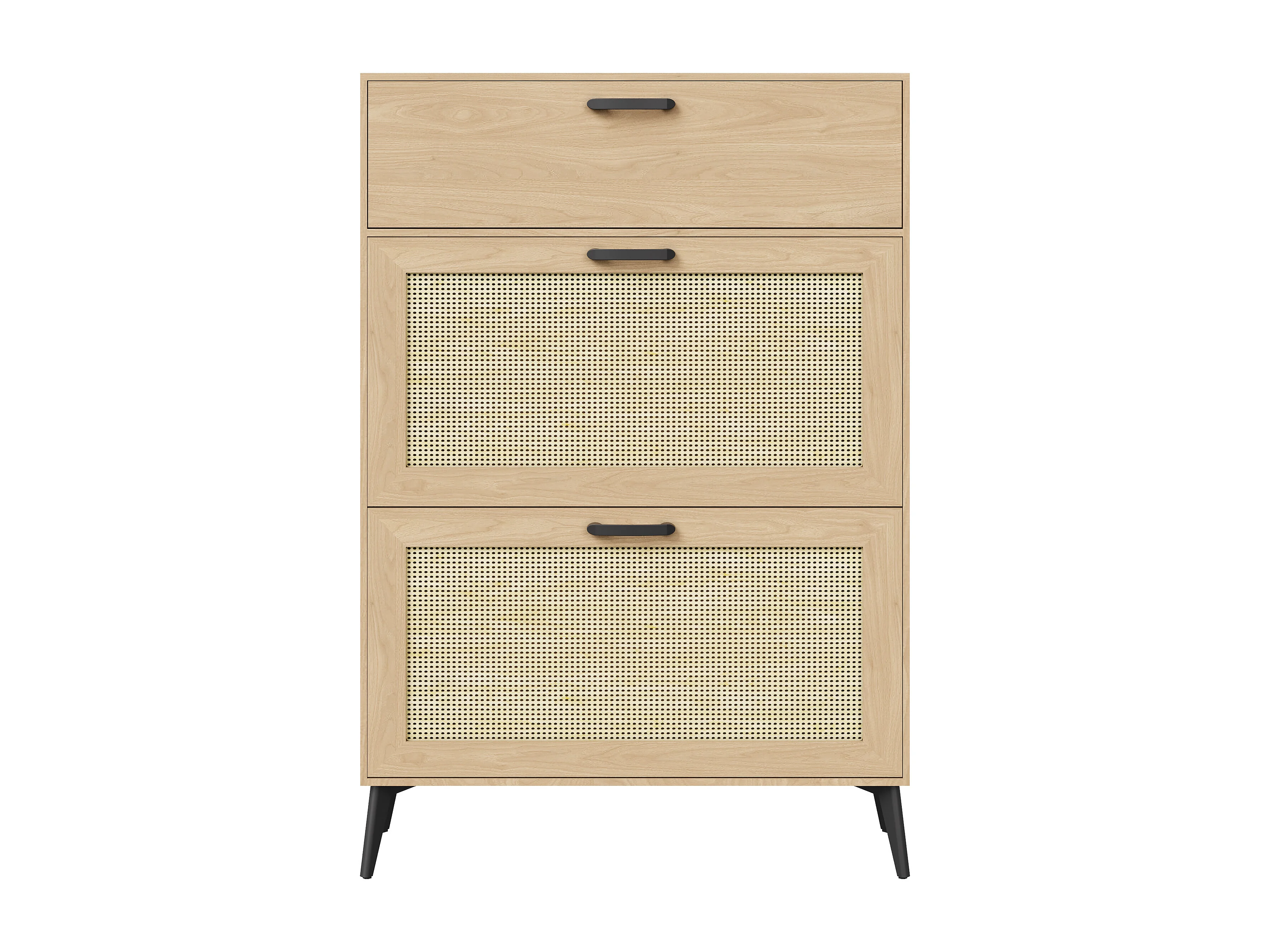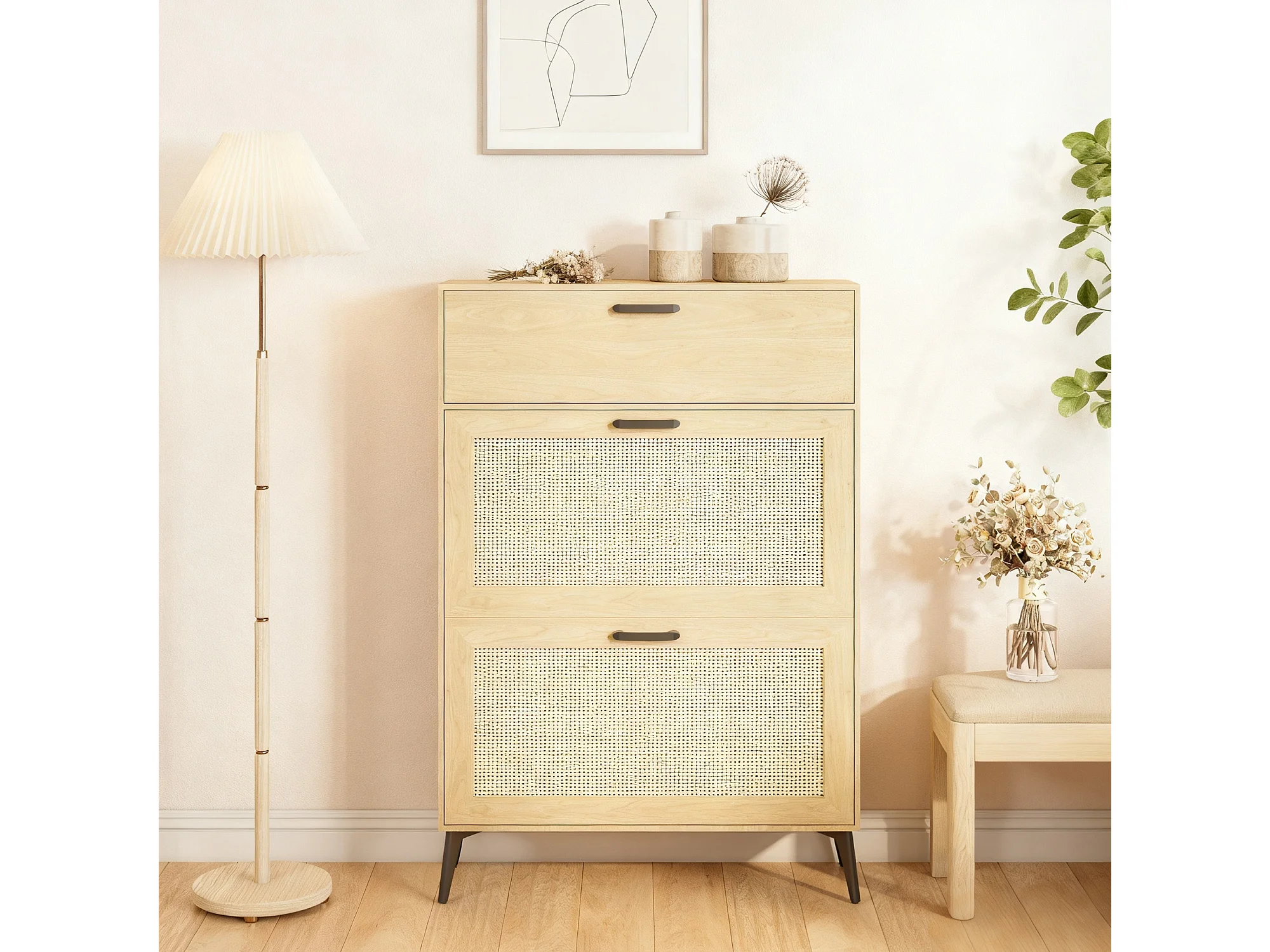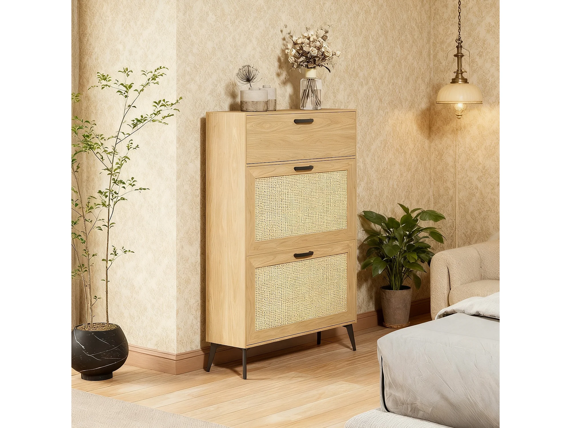 Meuble à chaussures en naturel rotin - avec 2 Abattants et 1 Tiroir - pieds et poignées en métal - bois massif - chêne - Pour 12 à 15 - Pairesstyle maison campagne