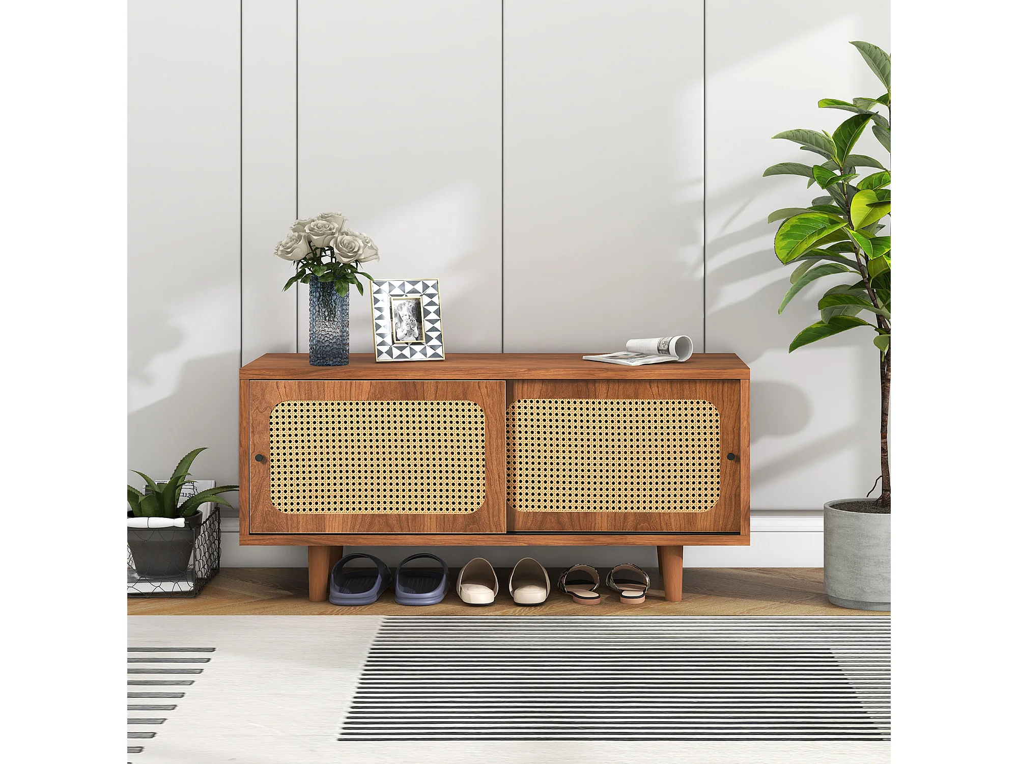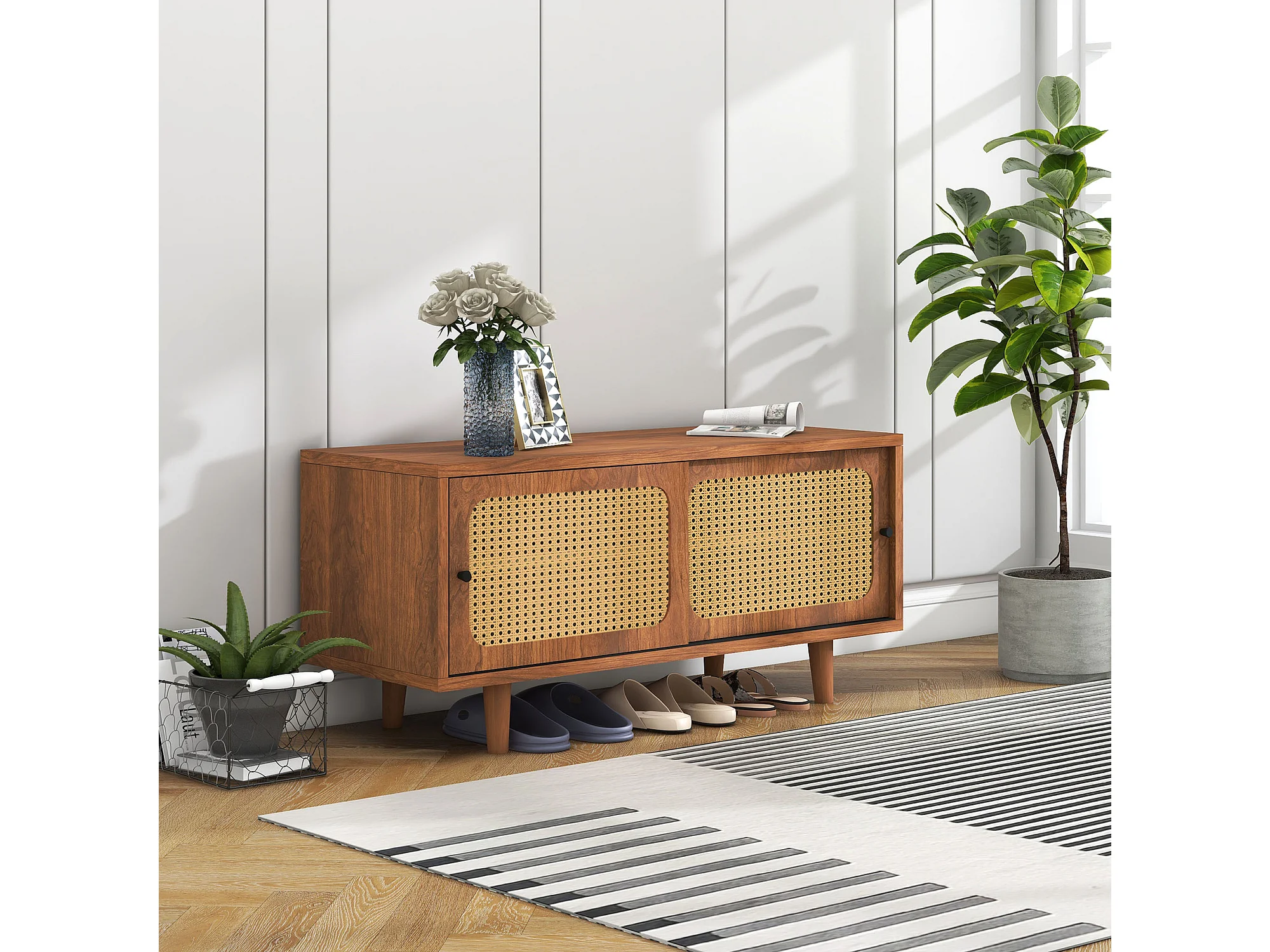 Meuble à chaussures en Rotin avec 2 portes et étagère réglable, couleur noyer – Rangement élégant pour couloir, salon et chambre, 104 x 40 x 48 cm